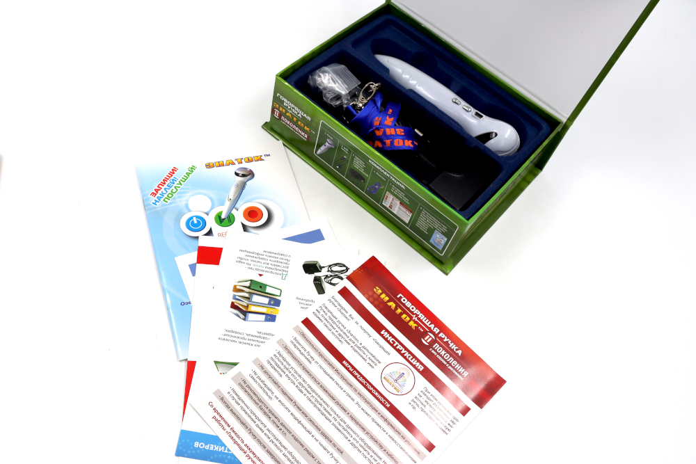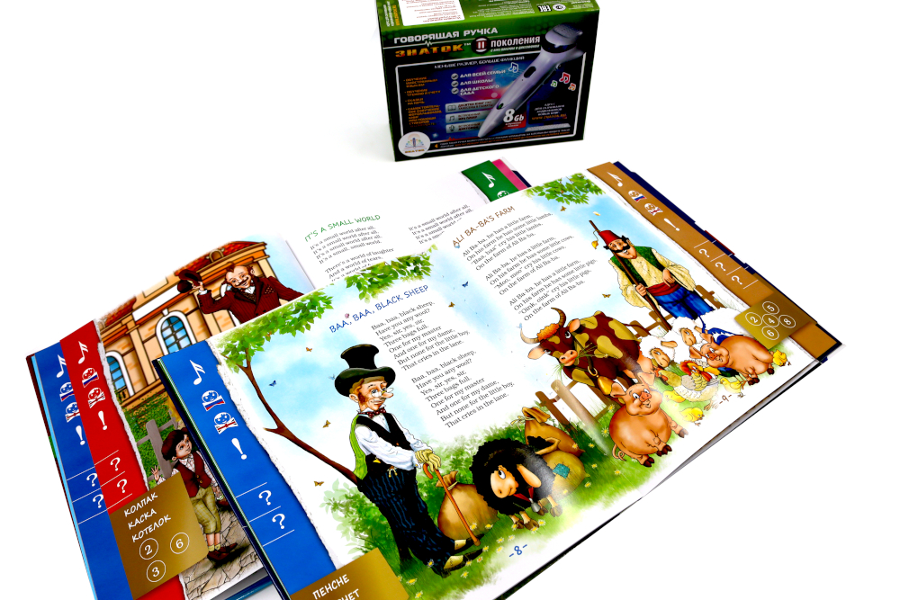Комплект состоит из двух книг «Английские песни для детей» и говорящей ручки с памятью в 8Гб и аудиостикерами. Знакомство с книгой «Английские песни для детей» поможет взрослым и детям, изучающим английский язык, узнать и хорошо запомнить точное произношение и значение новых английских слов и предложений. Послушайте весёлые забавные песенки, которые распевают дети в Великобритании. Попробуйте их спеть сами. И не забудьте, что все картинки на страницах это книги тоже озвучены. Очень простая в использовании уникальная помощница - говорящая ручка, предназначенная для эффективного обучения иностранным языкам, как детей, так и взрослых. Она так же поможет обучить детей чтению и счёту, расскажет сказку на ночь, познакомит ребёнка с окружающим миром. Причём, ручка озвучивает не только слова, но и рисунки! Для превращения ручки в удивительного рассказчика и доброго учителя достаточно коснуться, расположенного на книге или плакате, вот такого логотипа. В память ручки (8 GB) уже внесены книги, указанные на обратной стороне коробки и в инструкции. Аудиофайлы других книг можно бесплатно скачать в разделе «Книги» или с информационного сайта www. books. znatok. ru, подсоединив выключенную ручку при помощи прилагаемого USB-кабеля к компьютеру. Если памяти будет не хватать, то файлы можно перенести из ручки в компьютер, и создать там свою библиотеку аудиофайлов, при необходимости закачивая их в ручку. Особого внимания заслуживают входящие в набор аудиостикеры и их применение.| Издательство | ЗНАТОК |