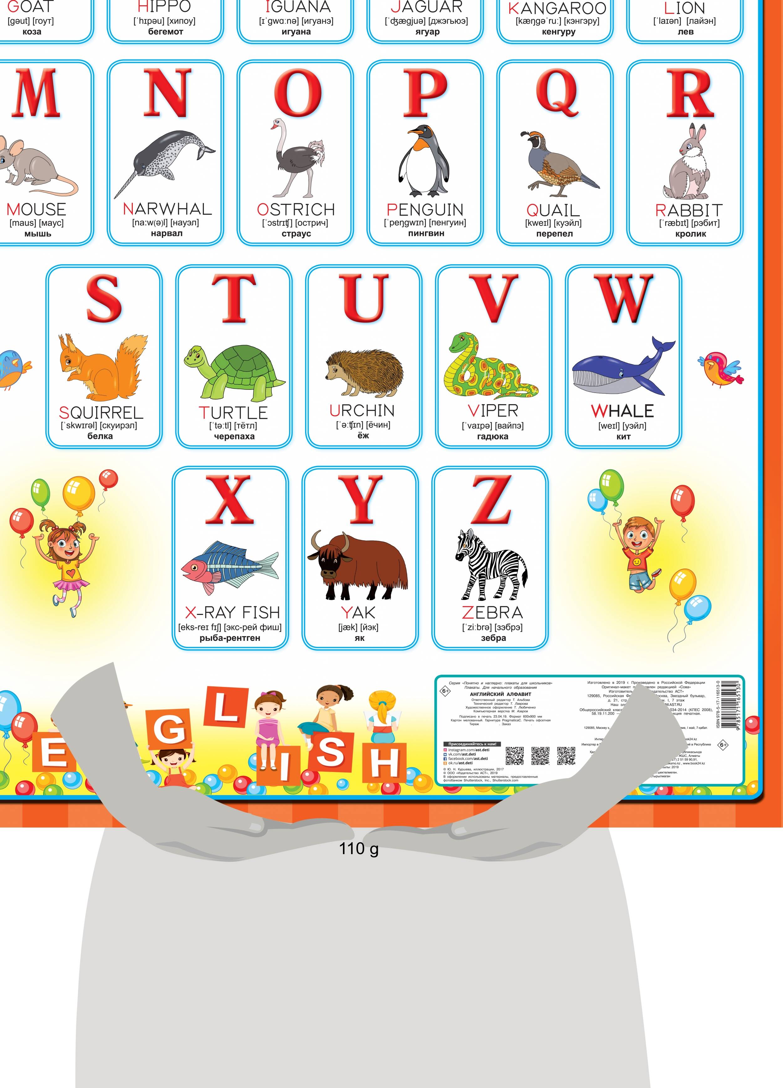 О чем эта книга Красочный плакат поможет без особого труда выучить английский алфавит. Кому эта книга будет интересна Для детей, которые делают первые шаги в изучении английского языка. Каковы особенности этой книги • Плакат можно повесить на стену и обращаться к нему в любое удобное время. • Развивает визуальную память. • Плакат сделан из плотного картона. • Можно использовать для обучения и развития детей дома или в школе.| Издательство | АСТ |