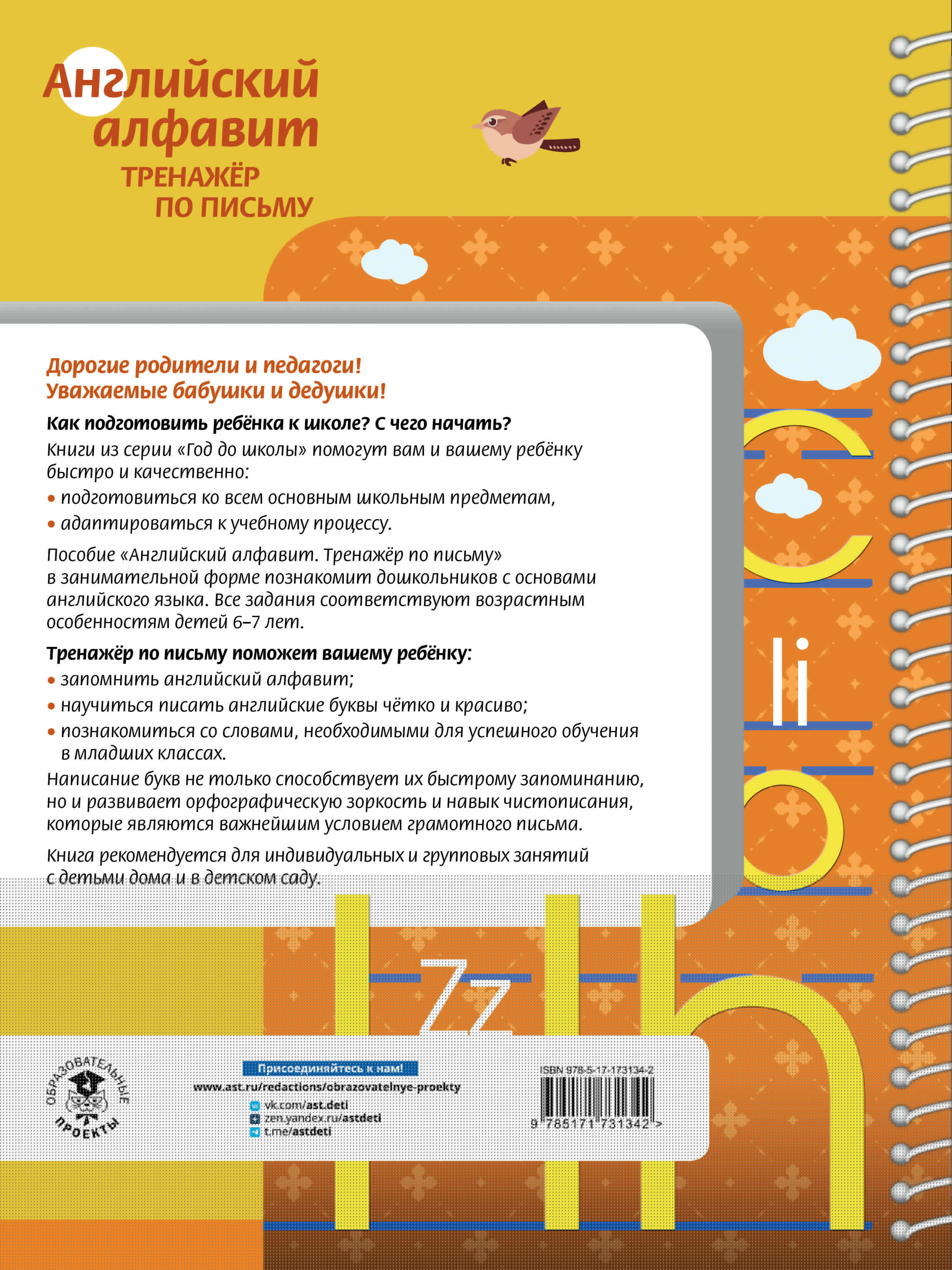 Пособие "Английский алфавит. Тренажёр по письму" в занимательной форме познакомит дошкольников с основами английского языка. Все задания соответствуют возрастным особенностям детей 6-7 лет. Тренажёр по письму поможет вашему ребёнку: • запомнить английский алфавит; • научиться писать английские буквы чётко и красиво; • познакомиться со словами, необходимыми для успешного обучения в младших классах. Написание букв не только способствует их быстрому запоминанию, но и развивает орфографическую зоркость и навык чистописания, которые являются важнейшим условием грамотного письма. Книга рекомендуется для индивидуальных и групповых занятий с детьми дома и в детском саду.| Издательство | Издательство "АСТ" |