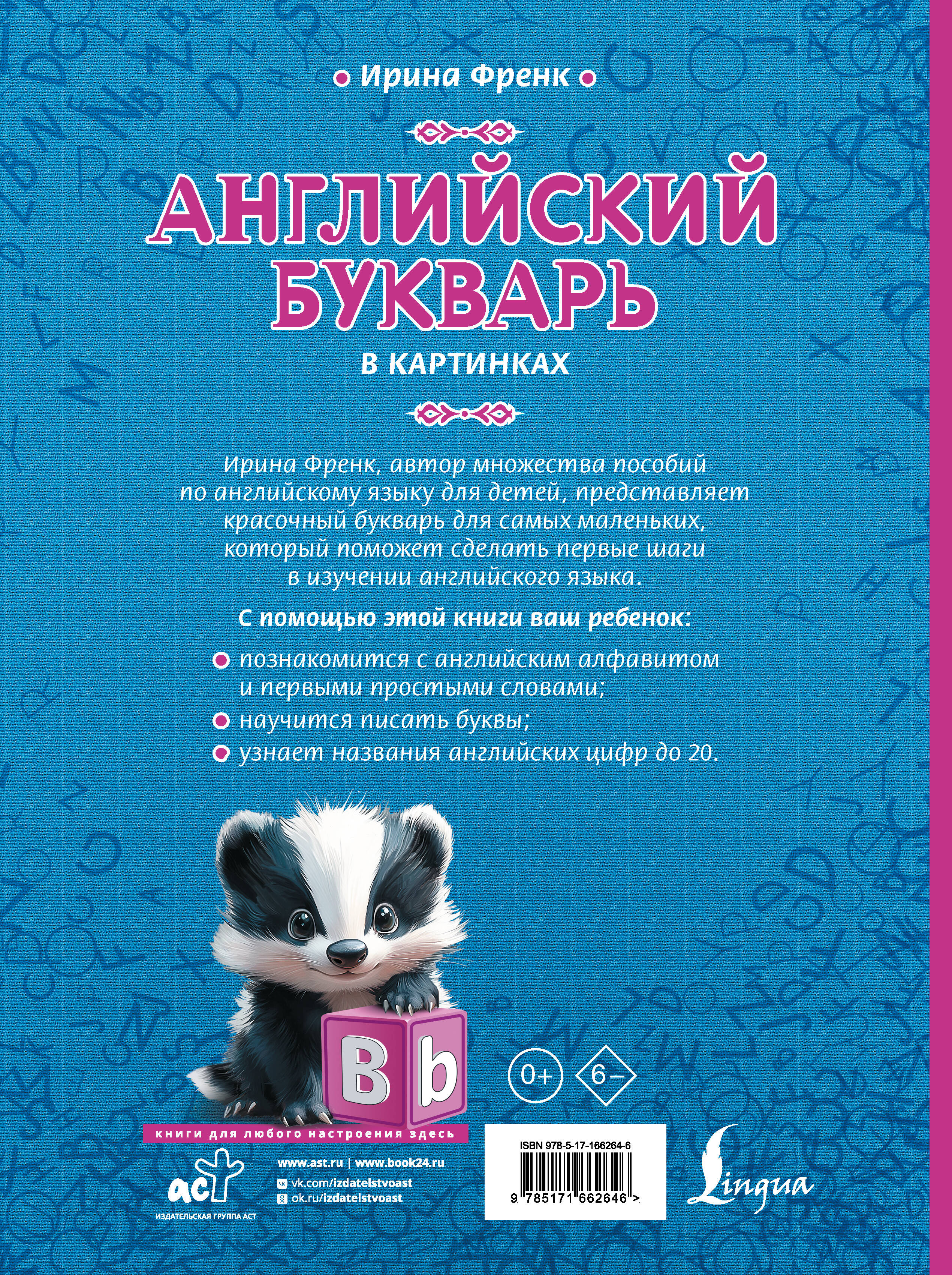 Ирина Френк - автор множества пособий по английскому языку для детей - подготовила красочный и увлекательный букварь, который станет отличным помощником на первых этапах изучения английского. С помощью этой книги дети познакомятся с английским алфавитом, научатся писать буквы и узнают первые слова. Все транскрипции в тексте даны русскими буквами, так что и родители без глубокого знания английского смогут заниматься с ребенком. Кроме того, в книге представлены английские цифры до 20, а в конце учебника детей ждут кроссворды, раскраски и словарик с иллюстрациями, который поможет закрепить материал. Яркие и красочные картинки делают пособие особенно интересным для разглядывания и повторения изученного. Пособие предназначено для занятий с детьми старшего дошкольного возраста, но может пригодиться и для учеников начальных классов.| Издательство | Издательство "АСТ" |