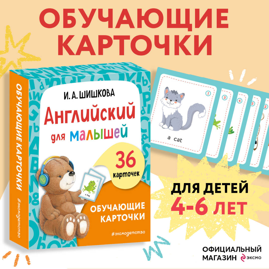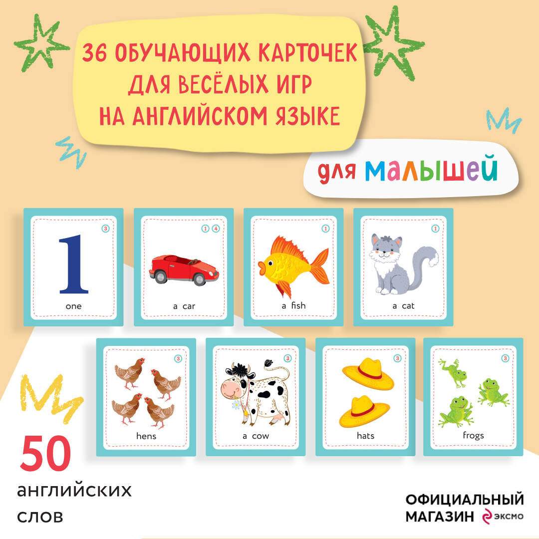 Не все дети любят книги. Учиться чему-то по книгам дети любят еще меньше. Как же быть? Осваивать простые английские слова и первые правила в игре! Вам не придется самим ломать голову и придумывать игру с карточками и английскими словами. Автор уже все придумала, и на 4-х карточках комплекта вы найдете советы и инструкции, во что поиграть с ребенком и как лучше это сделать. Игры с карточками помогут ребенку запомнить более 50 английских слов, строить простые фразы, использовать множественное число. А заодно они убедят малыша, что английский язык - это интересно, а в книжке «Английский для малышей» и рабочей тетради к ней его ждет еще больше веселых игр! Первые успехи в английском начинаются в игре!| Издательство | ООО "Издательство "Эксмо" |