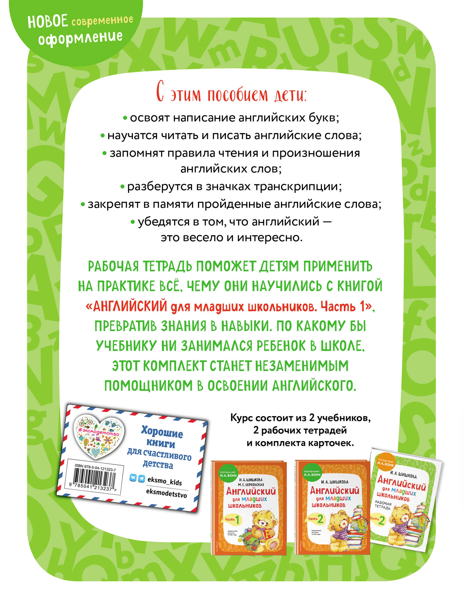 Комплект из пособия и рабочей тетради «Английский для младших школьников. Часть 1». Курс-бестселлер И.А. Шишковой и М.Е. Вербовской уже более 20 лет помогает детям знакомиться с английским языком в веселой игровой форме, осваивать английские буквы и звуки, правила чтения, первые слова и фразы. Занимаясь по книге, слушая аудиозапись (доступна по QR-коду) и повторяя за диктором, выполняя задания в рабочей тетради, школьники сформируют базовый словарный запас и получат первые знания об английском языке. Простые и понятные объяснения, эффективная методика, достаточное количество практики, полезные слова и занимательные задания помогут детям заложить базу для дальнейших успехов в английском и отличных оценок!| Издательство | ООО "Издательство "Эксмо" |