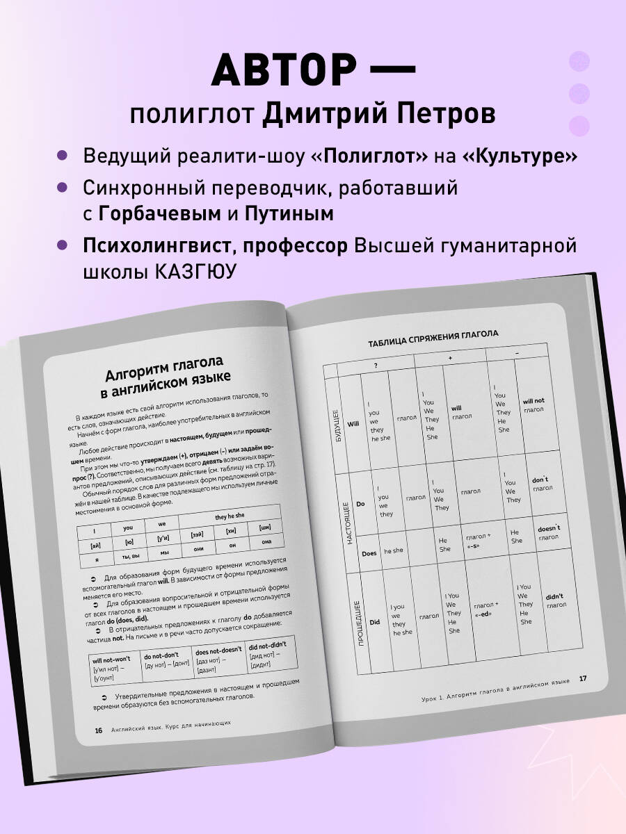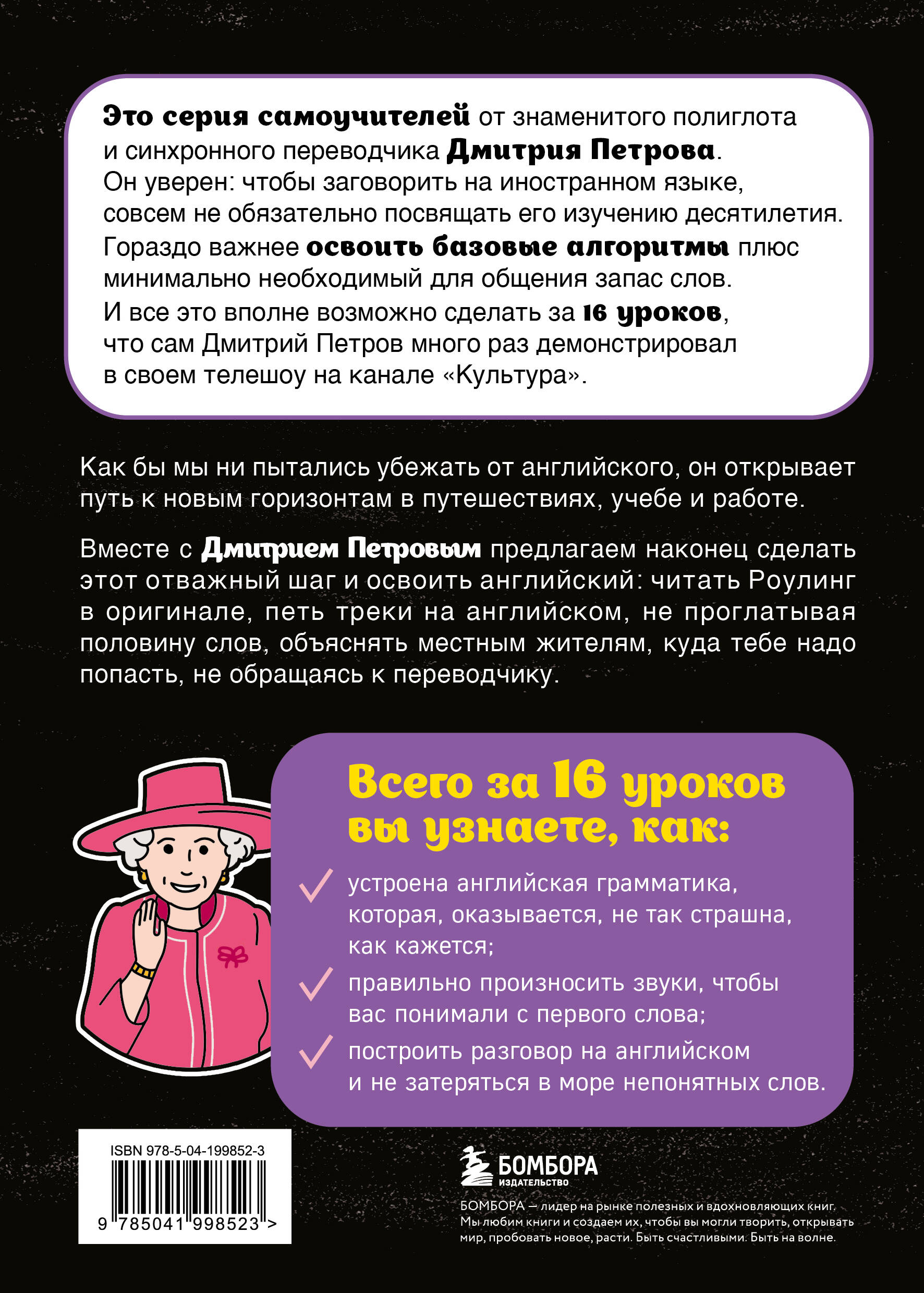 Это серия самоучителей от знаменитого полиглота и синхронного переводчика Дмитрия Петрова. Он уверен: чтобы заговорить на иностранном языке, совсем не обязательно посвящать его изучению десятилетия. Гораздо важнее освоить базовые алгоритмы, плюс - минимально необходимый для общения запас слов. И все это вполне возможно сделать за 16 уроков, что сам Дмитрий Петров много раз демонстрировал в своем телешоу на канале «Культура». Как бы мы ни пытались убежать от английского, он открывает путь к новым горизонтам в путешествиях, учебе и работе. Вместе с Дмитрием Петровым предлагаем наконец сделать этот отважный шаг и освоить английский: читать Роулинг в оригинале, петь треки на английском, не проглатывая половину слов, объяснять местным жителям, куда тебе надо попасть, не обращаясь к переводчику. Всего за 16 уроков вы узнаете, как: - устроена английская грамматика, которая, оказывается, не так страшна, как кажется; - правильно произносить звуки, чтобы вас понимали с первого слова; - построить разговор на английском и не затеряться в море непонятных слов.| Издательство | ООО "Издательство "Эксмо" |
