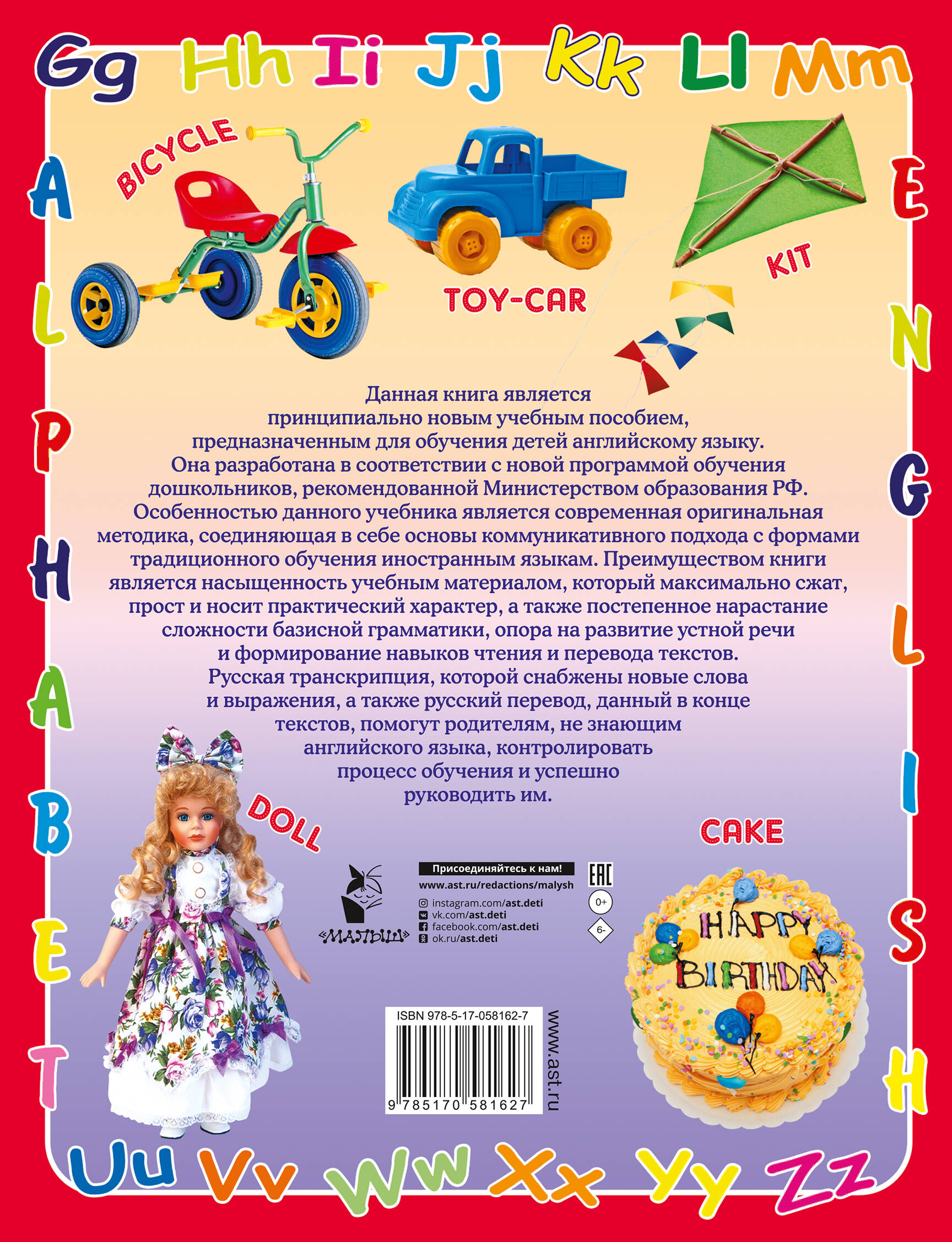 Данная книга является принципиально новым учебным пособием, предназначенным для обучения детей английскому языку. Она разработана в соответствии с новой программой обучения дошкольников, рекомендованной Министерством образования РФ. Особенностью данного учебника является современная оригинальная методика, соединяющая в себе основы коммуникативного подхода с формами традиционного обучения иностранным языкам. Преимуществом книги является насыщенность учебным материалом, который максимально сжат, прост и носит практический характер, а также постепенное нарастание сложности базисной грамматики, опора на развитие устной речи и формирование навыков чтения и перевода текстов. Русская транскрипция, которой снабжены новые слова и выражения, а также русский перевод, данный в конце текстов, помогут родителям, не знающим английского языка, контролировать процесс обучения и успешно руководить им.| Издательство | Издательство "АСТ" |