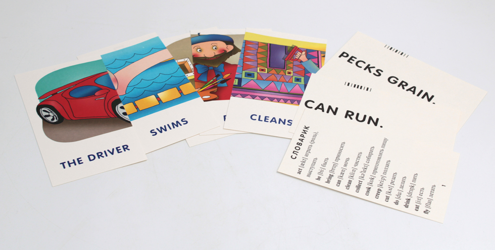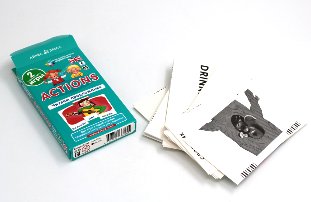 Набор состоит из 48 карточек, которые могут использоваться с двух сторон. Учимся читать (цветная сторона карточек). Предложите ребёнку из 6 карточек выбрать три и составить из них картинку. Собрав картинку, ребёнок увидит, как выглядит соответствующее предложение по-английски. Прочитайте это предложение, пусть ребёнок повторит за вами. Обратите его внимание на оформление предложения, а также на порядок слов в английском предложении. Отрабатываем навык чтения (чёрно-белая сторона карточек). Возьмите 4-6 карточек с сочетаниями слов. Предложите ребёнку выбрать из них две так, чтобы можно было составить правильно оформленное предложение из сочетаний слов. Рассмотрите картинки на карточках, попросите ребёнка подобрать к каждой картинке нужное предложение. Прочитайте слова из «секретов чтения» в соответствии с указанным правилом, каждый раз ускоряйте темп чтения. Проверьте по словарику, значение всех ли слов запомнил ребёнок. Игры с карточками помогут научить ребёнка правильно читать по-английски, расширят лексический запас, будут способствовать запоминанию графического образа слова.| Издательство | Айрис-Пресс |