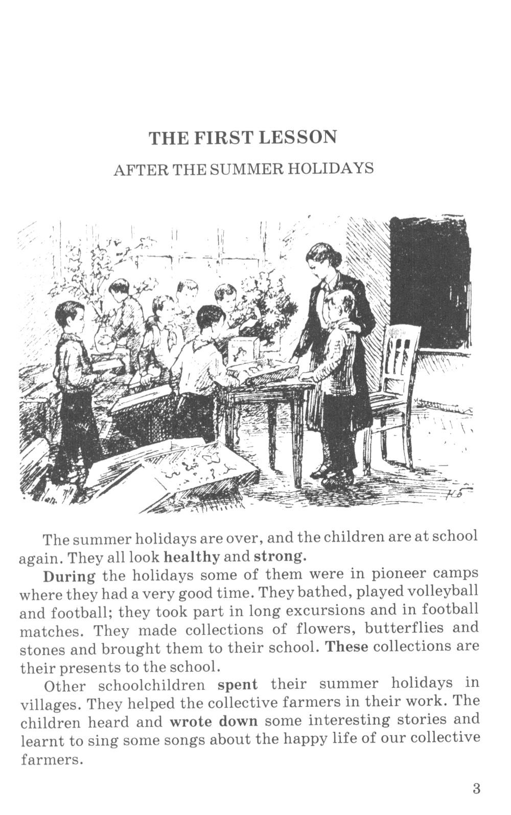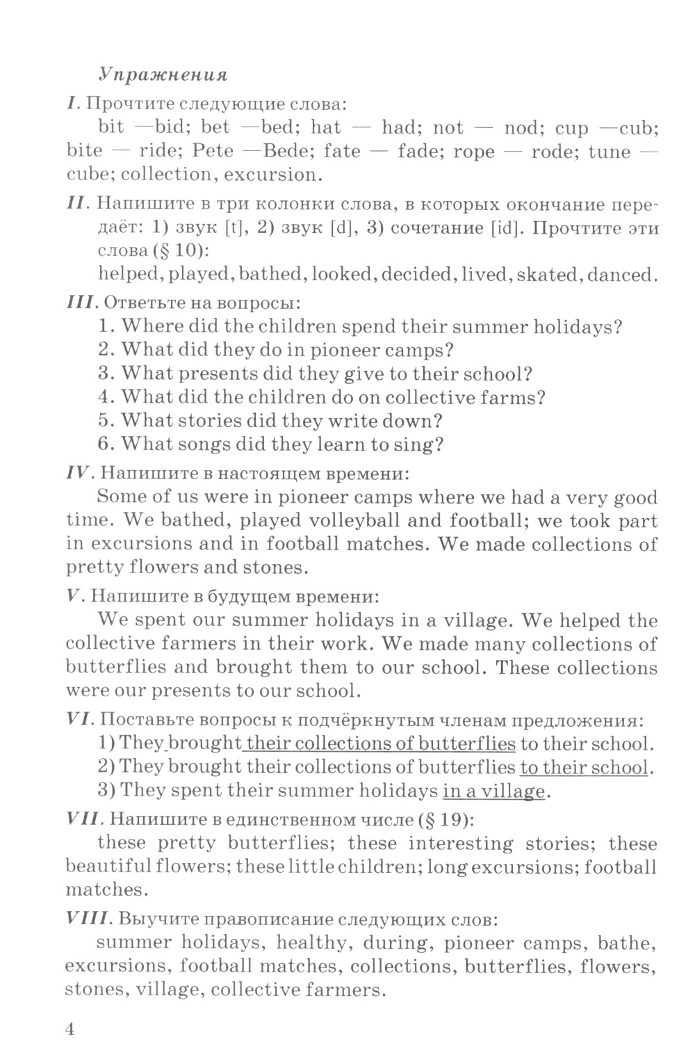 Настоящий учебник по английскому языку для учеников 6 класса предназначен для четвёртого года обучения иностранному языку. Для удобства восприятия новой информации программа разделена на 20 уроков, каждый из которых снабжён упражнениями на чтение, письмо и закрепление грамматических и синтаксических правил. Школьники познакомятся с прошедшим длительным и настоящим совершённым временами, сравнительной и превосходной степенями многосложных прилагательных, притяжательными местоимениями и суффиксальным способом словообразования. Алфавитный словарь облегчит ознакомление учащихся с новой лексикой, а справочные правила помогут закрепить изученный материал. Приложение к изданию содержит подробный план-оглавление по учебным четвертям с указанием тем для повторения, а также перечнем новых слов и выражений.| Издательство | Советские учебники |
