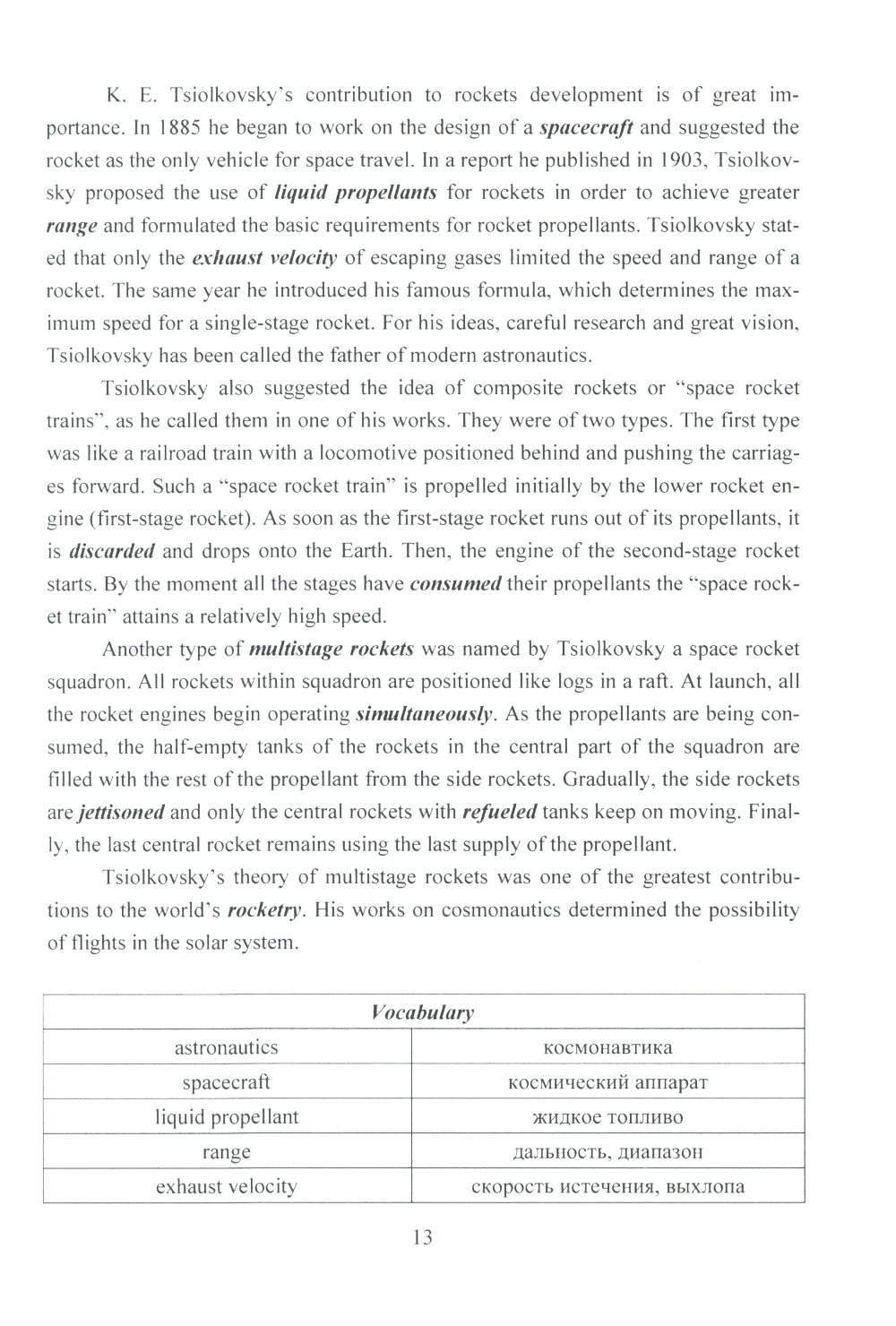 Языковой материал представлен в коммуникативной форме, большое внимание уделяется навыкам чтения, говорения и письма. Использована оригинальная литература по ракетостроению и космонавтике. Для студентов высших технических учебных заведений, обучающихся по следующим направлениям: 01.03.03, 01.04.03 «Механика и математическое моделирование», 15.03.01 «Машиностроение», 15.03.03, 15.04.03 «Прикладная механика», 24.03.01, 24.04.01 «Ракетные комплексы и космонавтика», 24.04.02 «Системы управления движением и навигация» и 24.05.01 «Проектирование, производство и эксплуатация ракет и ракетно-космических комплексов».