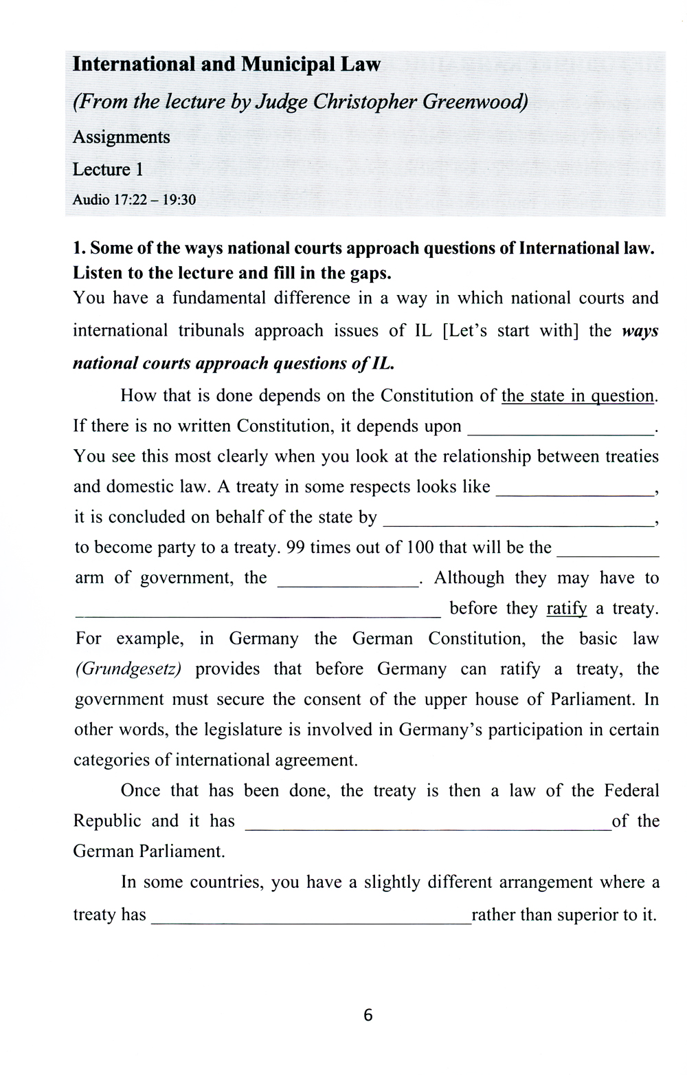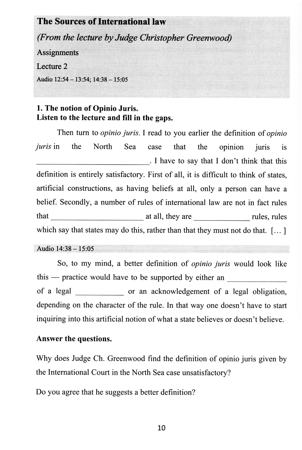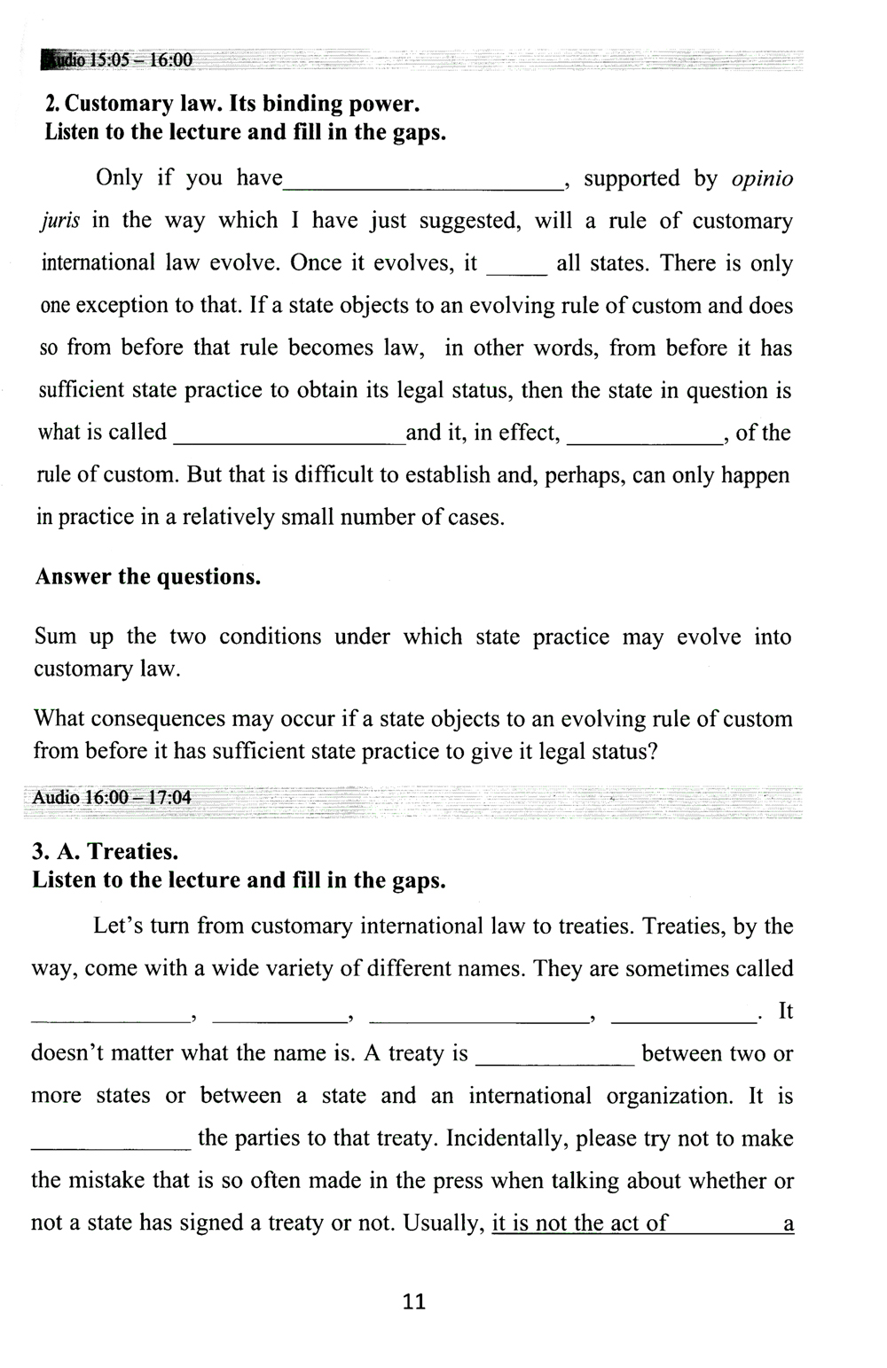 Учебное пособие предназначено для развития способности студентов работать с аудиовизуальной информацией, понимать и анализировать лекции по международному праву, а также для овладения юридической терминологией в рамках программы по обучению английскому языку для специальных целей. Материал пособия соотносится с видеолекциями, прочитанными судьями Международного суда ООН К. Гринвудом и Дж.Э. Донохью, а также профессором Нью-Йоркского университета Х.Э. Альваресом. Для студентов старших курсов бакалавриата международно-правового факультета МГИМО МИД России.| Издательство | МГИМО-Университет |