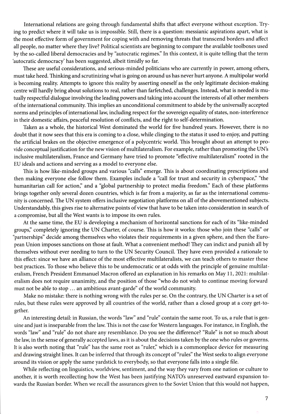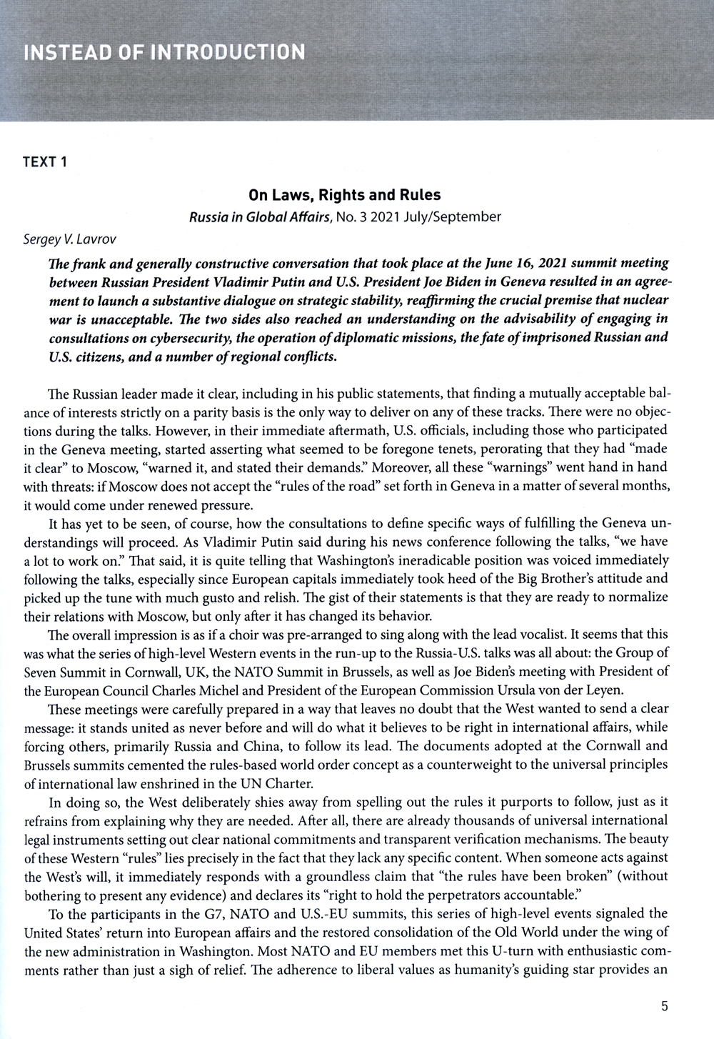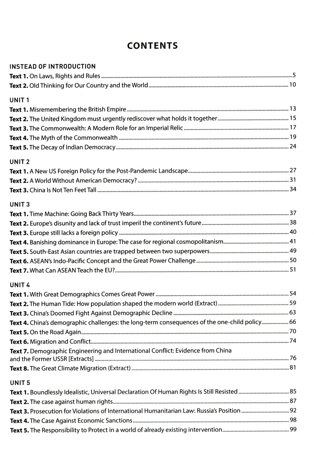 Настоящая хрестоматия является дополнением к учебнику «Английский язык для международников - 4. Язык профессии» О.А. Кравцовой, Е.Б.Ястребовой и Е.Ю. Корневой, предназначенному для студентов бакалавриата на завершающем этапе обучения по направлениям «Международные отношения» и «Зарубежное регионоведение» (уровень владения языком - С1). Хрестоматия содержит главы из книг, выдержки из научных статей и статьи из англоязычных периодических изданий, тематически соответствующие урокам учебника и представляющие различные точки зрения на затрагиваемые проблемы. Предназначена для внеаудиторной работы: подготовка сообщений по актуальным вопросам, проектных заданий, выступлений в дебатах и т.п.| Издательство | МГИМО-Университет |
