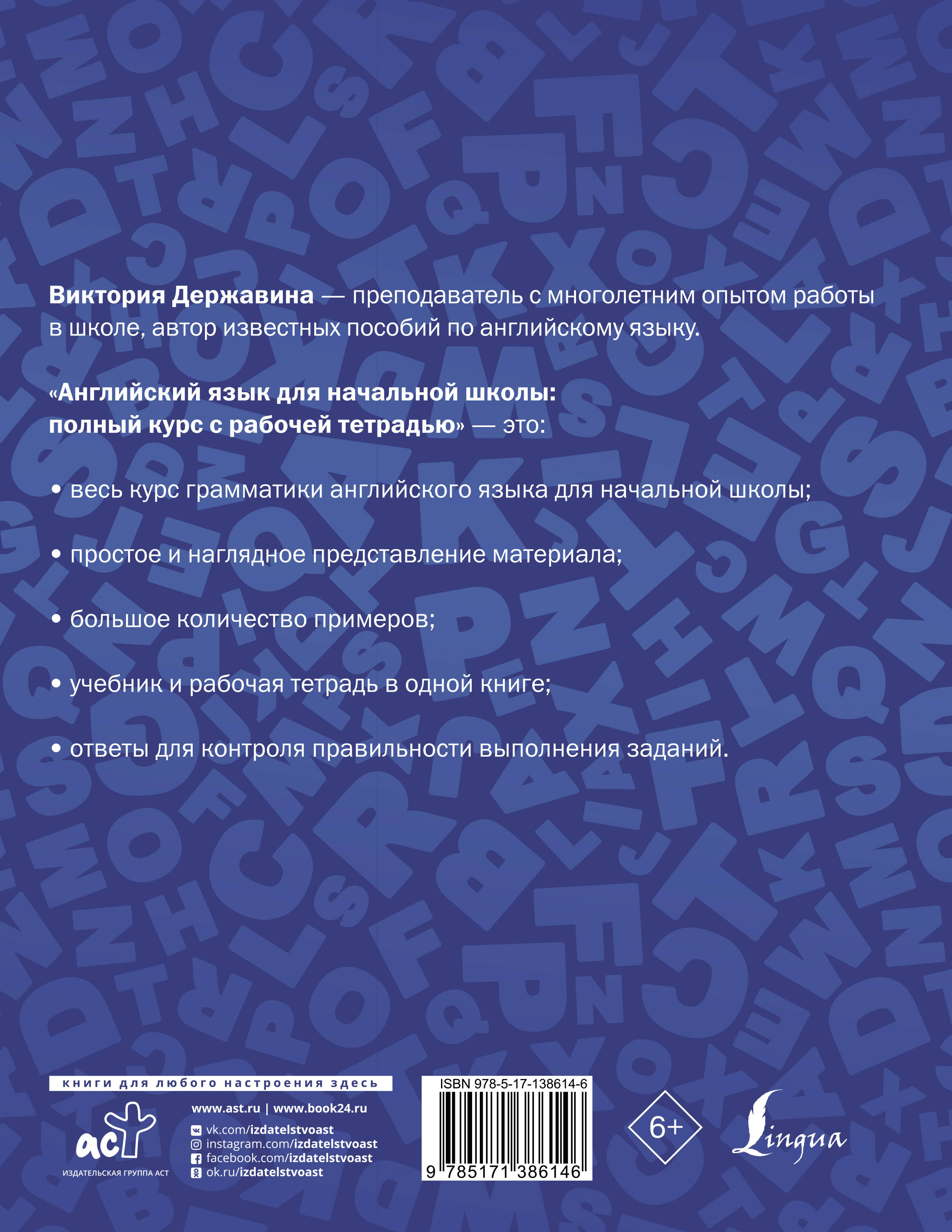Иностранный язык является одним из важных предметов в образовании современного ученика начальных классов. Изучение иностранного языка в младшем школьном возрасте влияет на коммуникативную культуру ученика, благоприятствует его общему речевому развитию и расширению кругозора. В начальной школе изучаются основы английского языка. Не зная этих основ или имея значительные пробелы в знаниях, школьник столкнется со сложностями на дальнейших этапах обучения, в средней и старшей школе. Именно поэтому важно уделять большое внимание изучению языка на начальном этапе. Особенности данного пособия: • весь курс грамматики английского языка для начальной школы, • простое и наглядное представление материала, • большое количество примеров, • учебник и рабочая тетрадь в одной книге, • ответы для контроля правильности выполнения заданий. Эта книга станет незаменимым помощником школьнику в подготовке к урокам и контрольным работам, повторении пройденного материала и систематизации знаний.| Издательство | ИЗДАТЕЛЬСТВО "АСТ" |