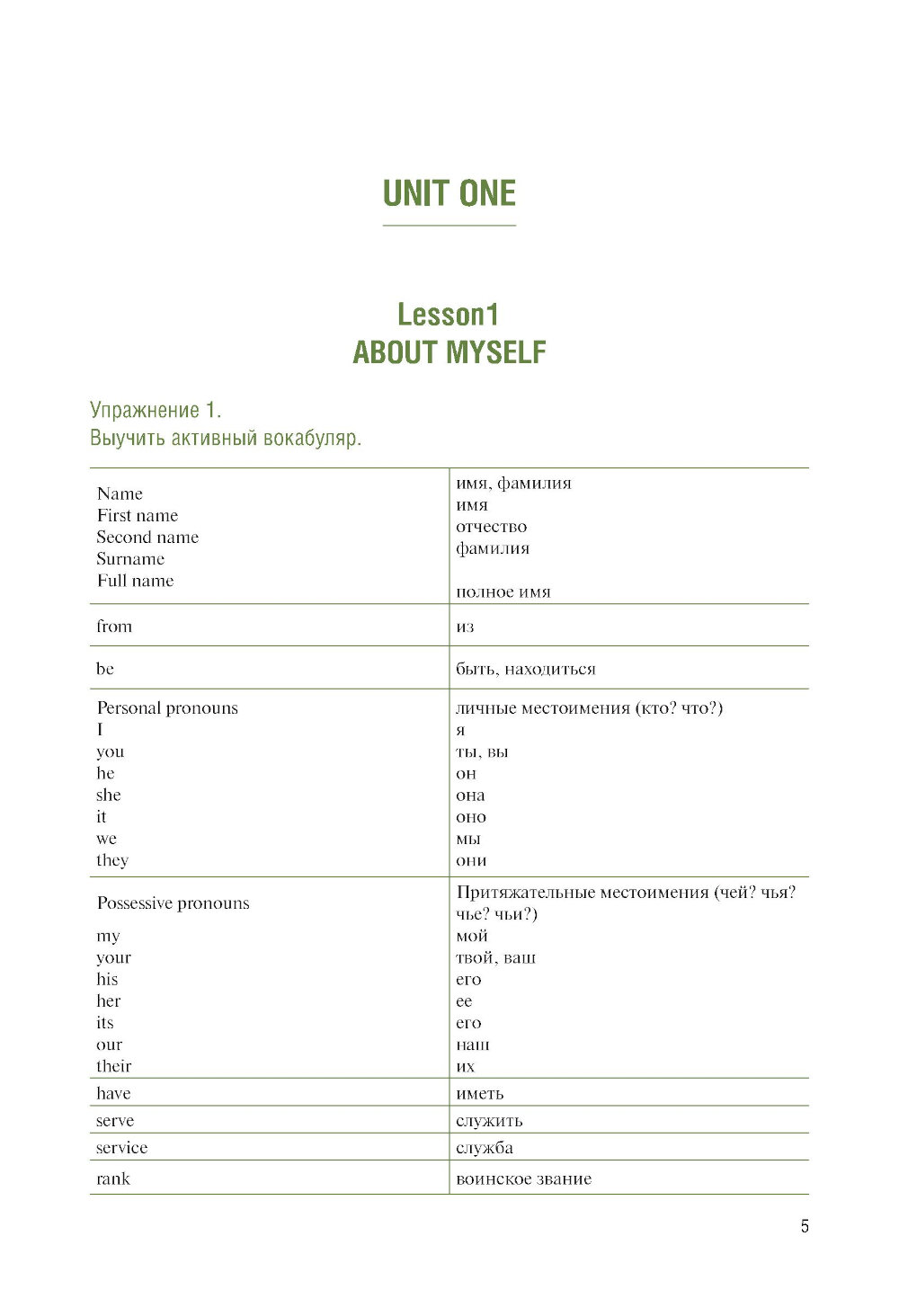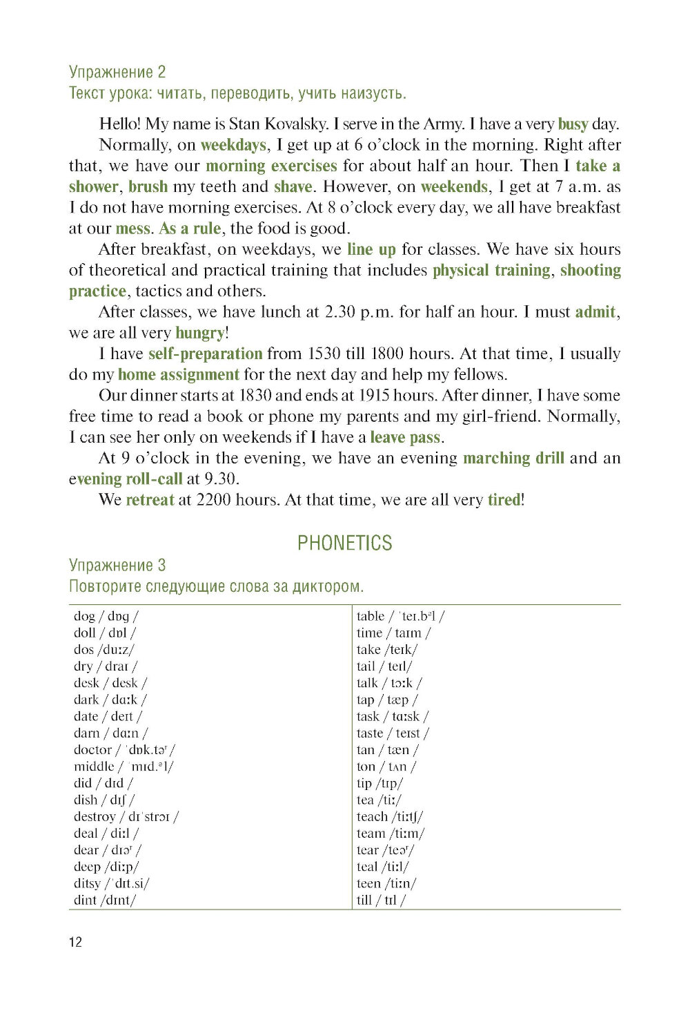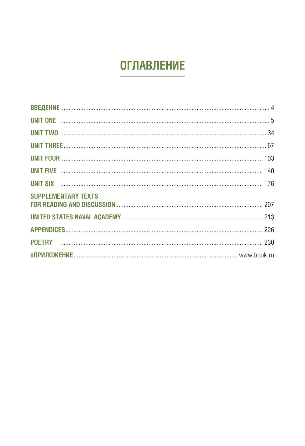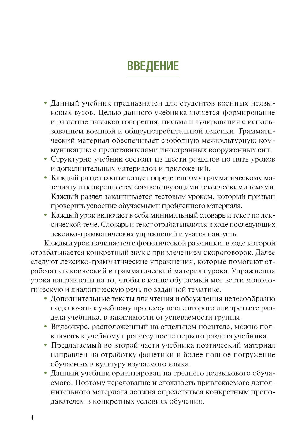 Цель - вывести обучаемых за пределы ситуаций общения, относящихся к военной службе. Лексические темы расширены до общеупотребительных, таких как «Посещение врача», «Посещение музея». Включены дополнительные материалы, чтобы помочь преподавателю разнообразить уроки и углубить знания обучаемых. Среди них тексты для чтения и обсуждения, тексты информационного характера об иностранных военных вузах, видеокурс для отработки навыков аудирования и другие сведения, помогающие лучше понять англоязычную культуру. Использованы данные из открытых иностранных источников. Соответствует ФГОС ВО последнего поколения. Для студентов бакалавриата, специалитета и магистратуры, обучающихся по специальностям, не связанным с профессиональным владением языком.