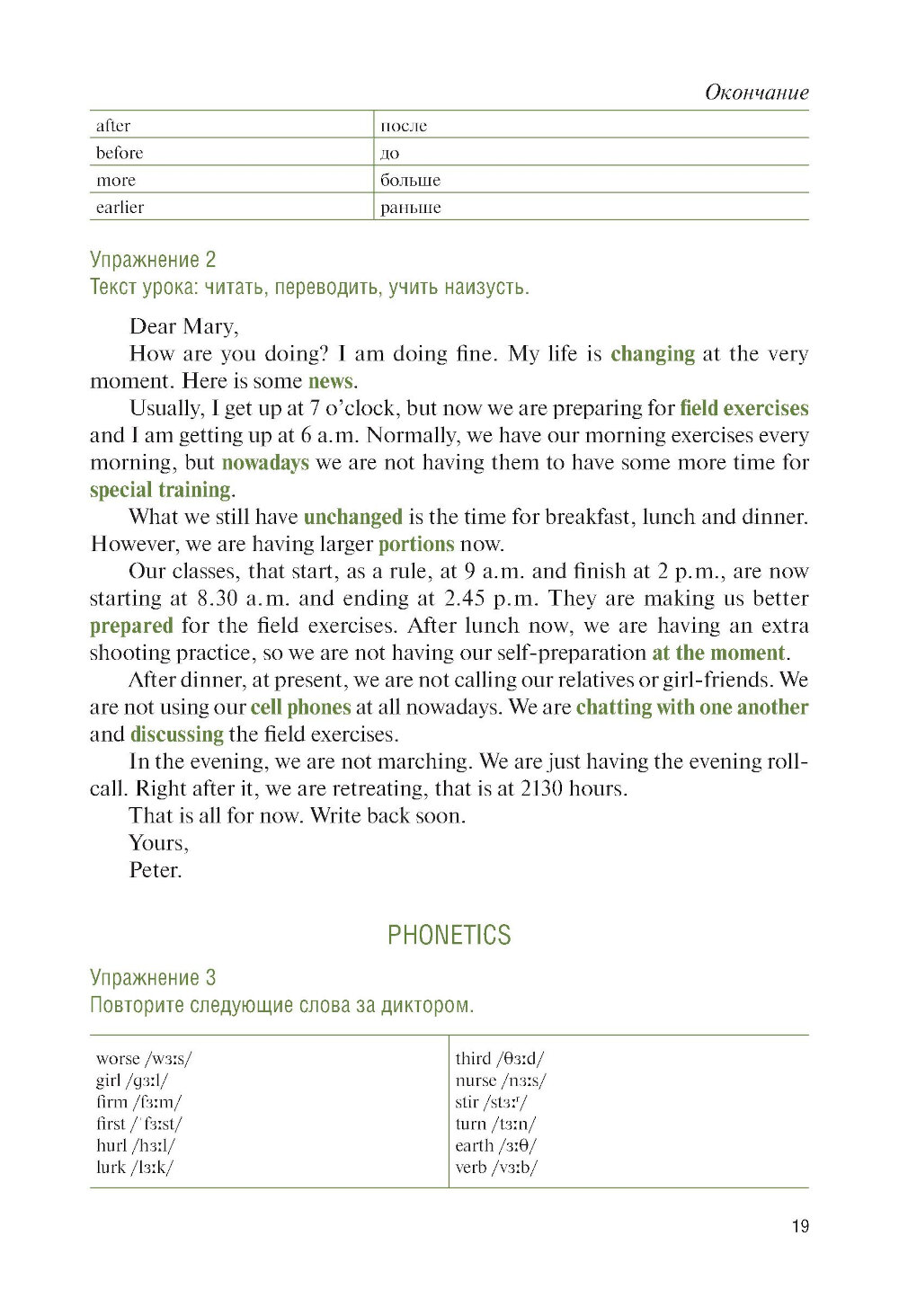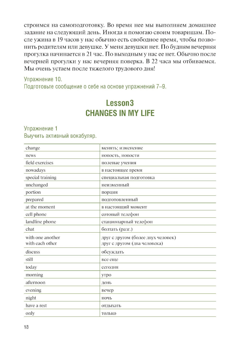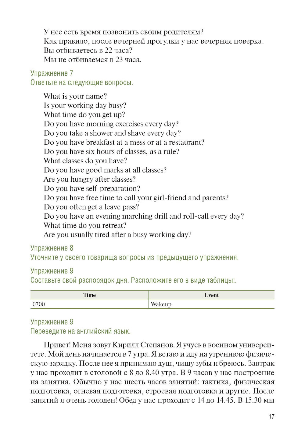 Цель - вывести обучаемых за пределы ситуаций общения, относящихся к военной службе. Лексические темы расширены до общеупотребительных, таких как «Посещение врача», «Посещение музея». Включены дополнительные материалы, чтобы помочь преподавателю разнообразить уроки и углубить знания обучаемых. Среди них тексты для чтения и обсуждения, тексты информационного характера об иностранных военных вузах, видеокурс для отработки навыков аудирования и другие сведения, помогающие лучше понять англоязычную культуру. Использованы данные из открытых иностранных источников. Соответствует ФГОС ВО последнего поколения. Для студентов бакалавриата, специалитета и магистратуры, обучающихся по специальностям, не связанным с профессиональным владением языком.