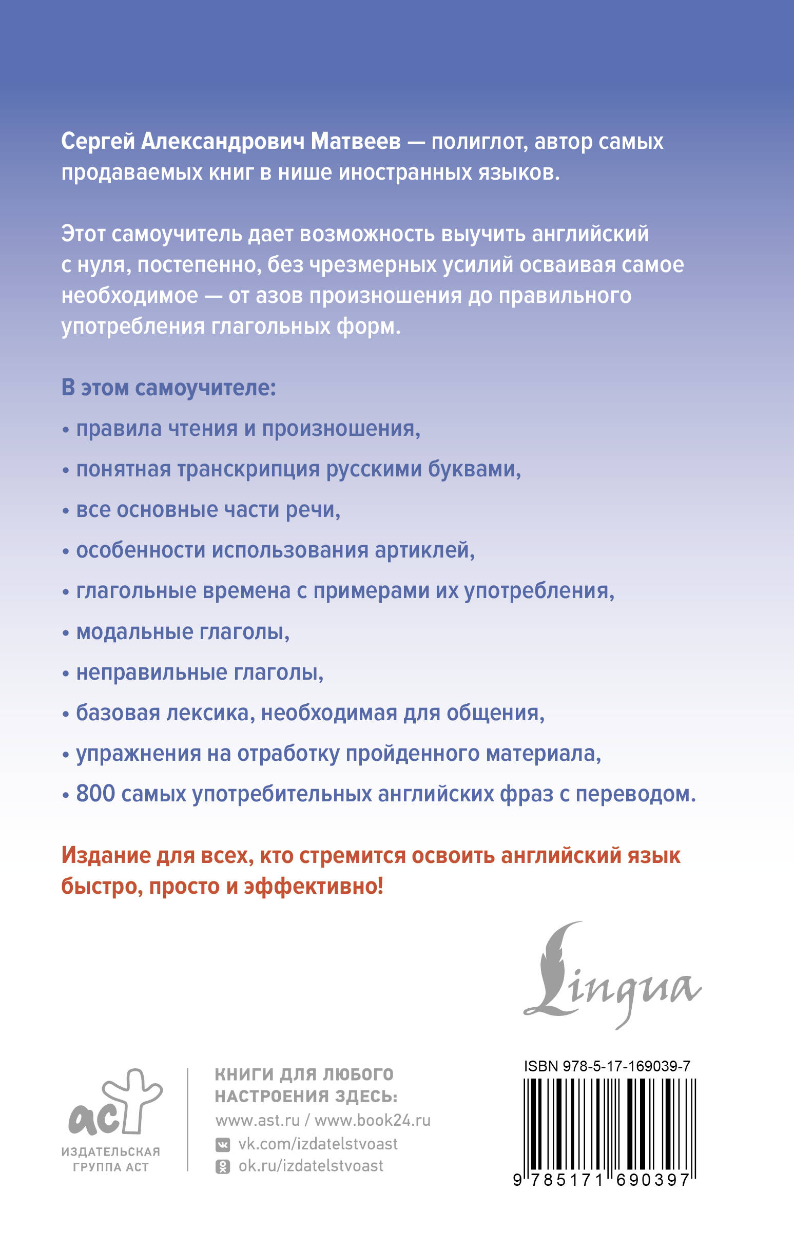Сергей Александрович Матвеев - полиглот, автор самых продаваемых книг в нише иностранных языков. Этот самоучитель дает возможность выучить английский с нуля, постепенно, без чрезмерных усилий осваивая самое необходимое. Здесь вы найдете основы английского произношения и правила чтения. Большинство английских слов и предложений сопровождаются транскрипцией русскими буквами. Подробно представлены все основные части речи и их особенности. Вся грамматика изложена просто, наглядно и с большим количеством примеров. К английским фразам и выражениям дан перевод на русский язык. Упражнения помогут легко закрепить новые знания. По мере прохождения материала даются тематические словарики, позволяющие постепенно увеличивать свой словарный запас и использовать эту лексику в разговоре. В конце книги помещена таблица неправильных глаголов, а также англо-русский разговорник. Проработав этот самоучитель, читатель освоит язык на уровне А2, научится понимать английскую речь на слух, читать несложные тексты, а также общаться на бытовые темы.| Издательство | Издательство "АСТ" |