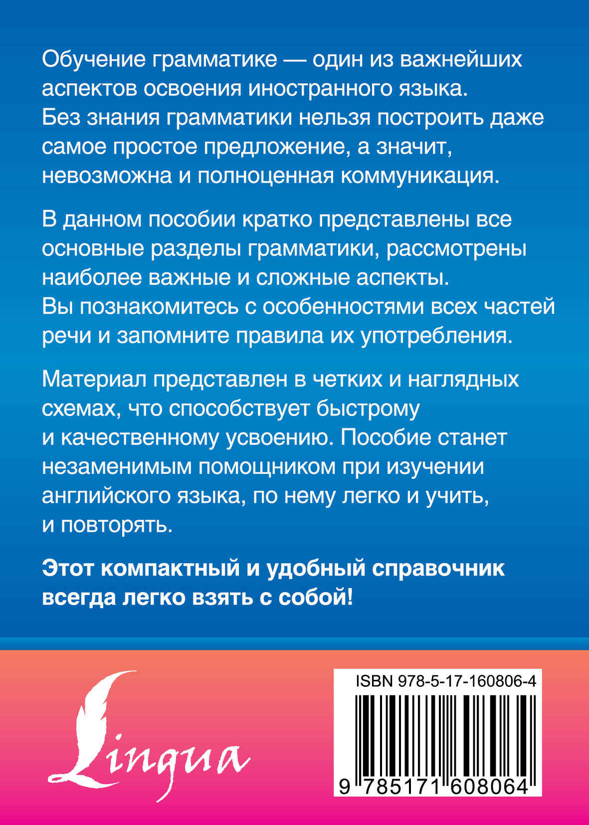 Державина Виктория Александровна - опытный педагог с многолетней практикой преподавания, автор известный пособий по английскому языку. В этом компактном издании представлены все основные разделы грамматики, рассмотрены наиболее важные и сложные аспекты. Материал представлен в четких и наглядных схемах, что способствует быстрому и качественному усвоению. Пособие станет незаменимым помощником при изучении английского языка, по нему легко и учить, и повторять. Справочник будет полезен для школьников, студентов, преподавателей и всех тех, кто учит английский язык.| Издательство | Издательство "АСТ" |