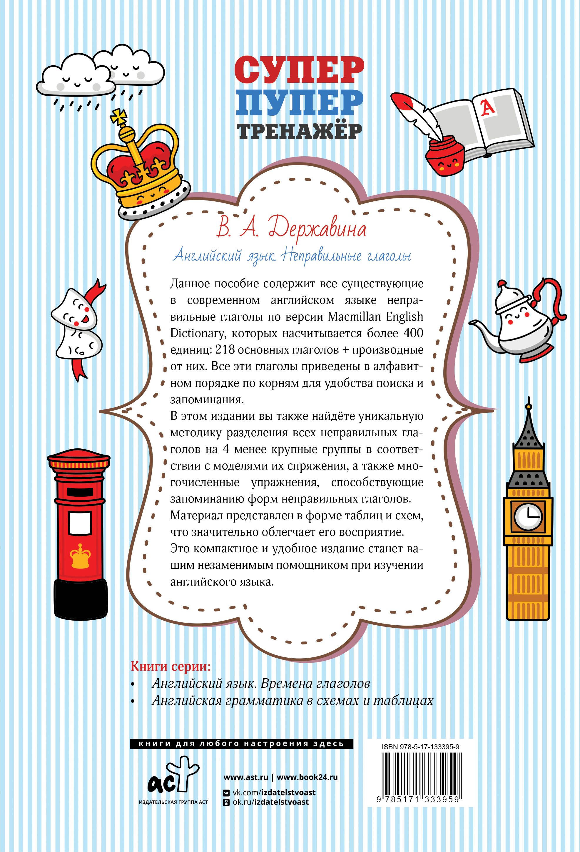 Данное пособие содержит все существующие в современном английском языке неправильные глаголы по версии Macmillan English Dictionary, которых насчитывается более 400 единиц: 218 основных глаголов + производные от них. Все эти глаголы приведены в алфавитном порядке по корням для удобства поиска и запоминания. В этом издании вы также найдёте уникальную методику разделения всех неправильных глаголов на 4 менее крупные группы в соответствии с моделями их спряжения, а также многочисленные упражнения, способствующие запоминанию форм неправильных глаголов.| Издательство | ИЗДАТЕЛЬСТВО "АСТ" |