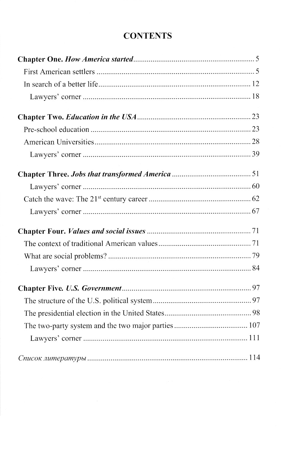 Учебное пособие предназначено для формирования лингвистической и коммуникативной компетенций в области профессионального общения будущих юристов-международников в рамках изучения страноведения США. Пособие охватывает такие темы, как «Первые поселенцы Америки», «Образование», «Трудоустройство», «Устройство государства» и «Общественные ценности». Система упражнений пособия способствует формированию лексической базы и расширению словарного запаса лексикой, относящейся к юридическим категориям. Организация материала обеспечивает прочное закрепление изучаемых лексических единиц и грамматических структур. Для студентов младших курсов бакалавриата международно-правового факультета МГИМО МИД России, изучающих английский язык.