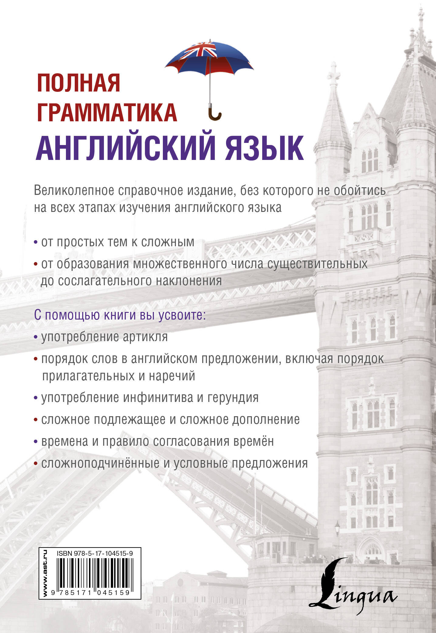 В серию «Полный курс» входят самоучители по основным европейским и восточным языкам. Серия известна на рынке и пользуется популярностью. Книга известного автора словарей и пособий по английскому языку В. А. Державиной представляет полный курс грамматики английского языка. В книге представлены все аспекты английской грамматики: от самых простых тем (например, образование множественного числа существительных) до сложных, с которыми знакомятся на продвинутом этапе изучения английского языка (сослагательное наклонение и условные предложения). Каждая тема завершается упражнениями для закрепления материала. В конце книги даны ответы. Пособие послужит великолепным подспорьем на всех этапах овладения английским языком. Предназначено для всех, кто учит английский язык.| Издательство | ИЗДАТЕЛЬСТВО "АСТ" |