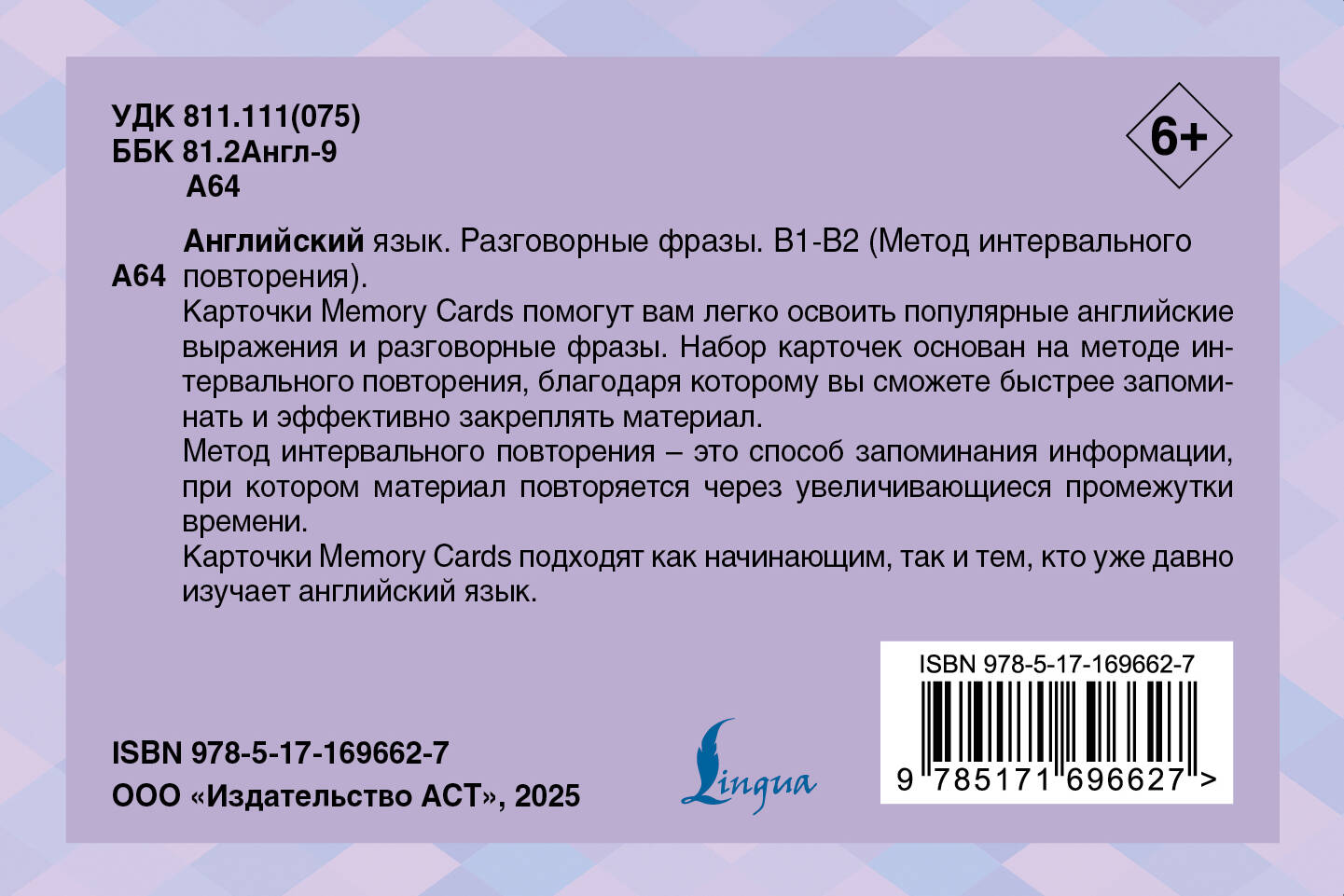 Карточки Memory Cards помогут вам легко освоить популярные английские выражения и разговорные фразы. Набор карточек основан на методе интервального повторения, благодаря которому вы сможете быстрее запоминать и эффективно закреплять материал. Метод интервального повторения - это способ запоминания информации, при котором материал повторяется через увеличивающиеся промежутки времени. Карточки Memory Cards подходят как начинающим, так и тем, кто уже давно изучает английский язык.| Издательство | Издательство "АСТ" |