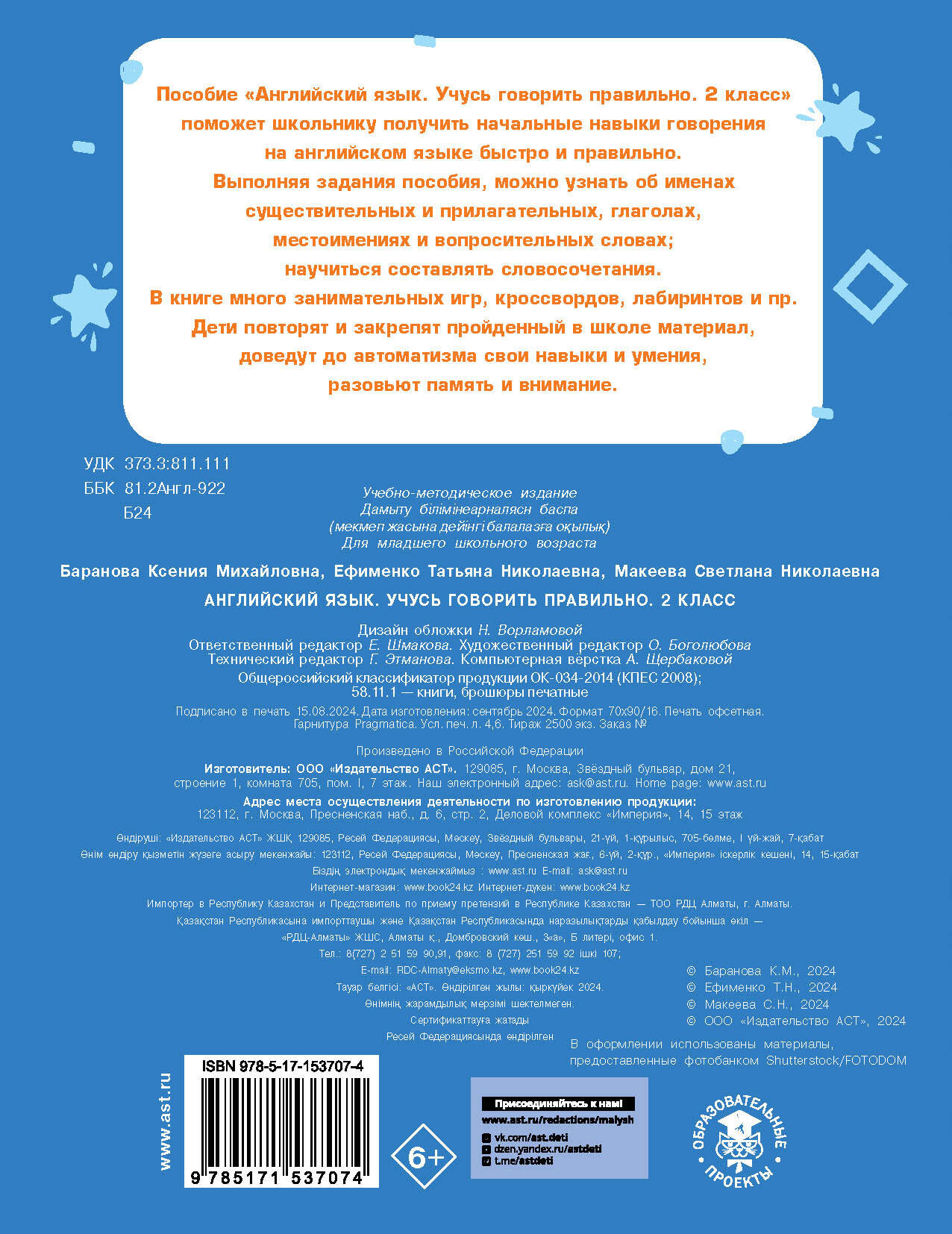 Пособие "Английский язык. Учусь говорить правильно. 2 класс" поможет школьнику получить начальные навыки говорения на английском языке быстро и правильно. Выполняя задания, можно узнать об именах существительных и прилагательных, глаголах, местоимениях и вопросительных словах, а также научиться составить словосочетания. В книге много занимательных игр, кроссвордов и лабиринтов. Дети повторят и закрепят пройденный в школе материал, разовьют память и внимание.| Издательство | Издательство "АСТ" |