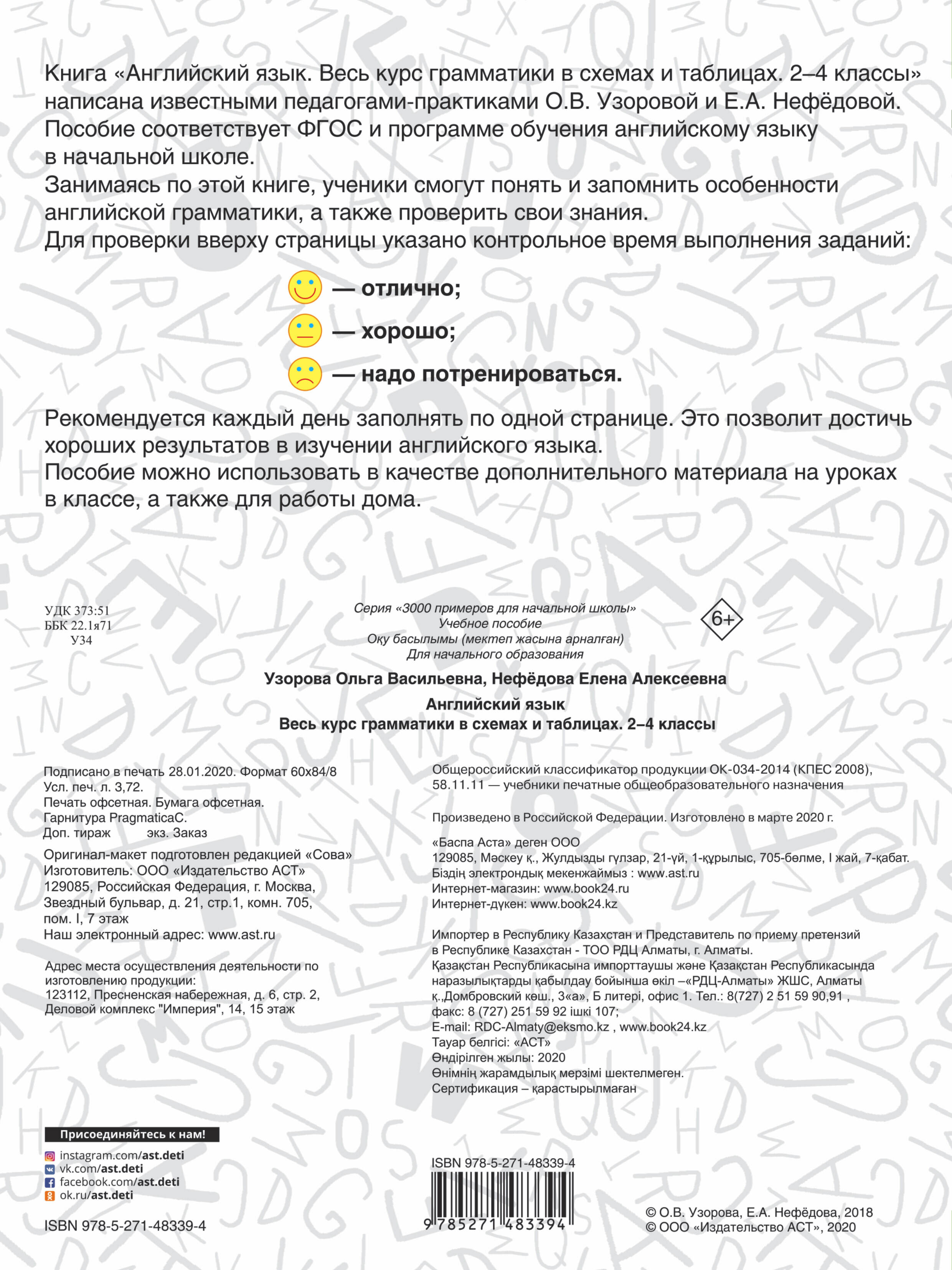 О чем эта книга Учебное пособие известных педагогов-практиков О. В. Узоровой и Е. А. Нефёдовой позволит ученикам проверить свои знания по грамматике английского языка, а учителю и родителям - проконтролировать их. Кому эта книга будет интересна Отличное дополнительное пособие для школьников младших классов. Каковы особенности этой книги - Соответствует ФГОС и программе обучения английскому языку в начальной школе. - Дает возможность ученикам быстро проверить свои знания по грамматике английского языка, а учителю и родителям - проконтролировать их, то есть отметить время, которое ребенок затратил на выполнение заданий. - Для проверки на каждой странице дано контрольное время выполнения заданий.| Издательство | ИЗДАТЕЛЬСТВО "АСТ" |