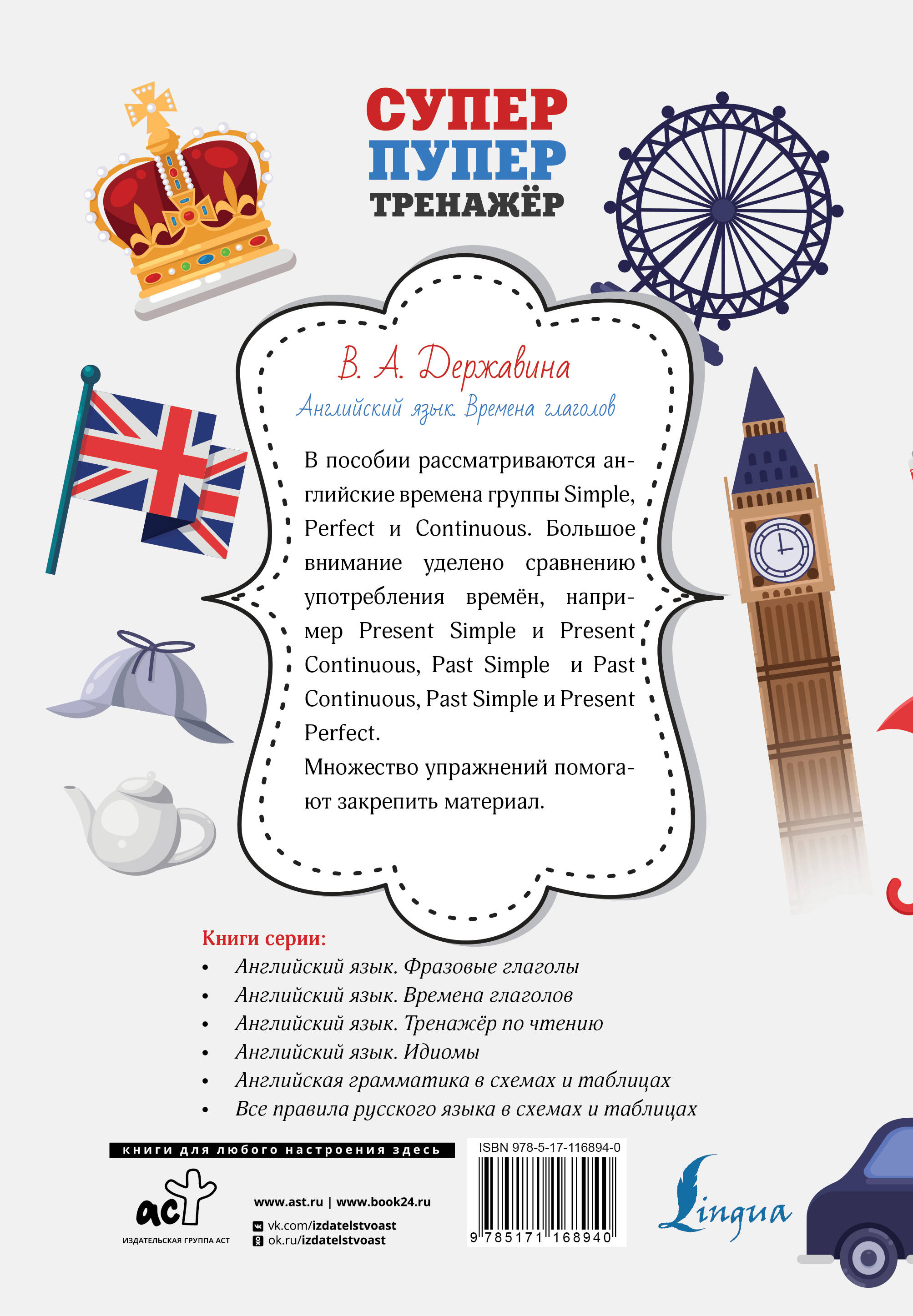В новую серию "Суперпупертренажер" входят пособия по грамматике английского и русского языков. Пособие "Английский язык. Времена глаголов" посвящено разбору употребления времен групп Simple, Perfect и Continuous. Особое внимание уделено сравнению их употребления. Также подробно рассматриваются вспомогательные глаголы to be, to have, to do, без которых немыслимо иметь понятие о временах. Материал помогают закрепить упражнения. Пособие предназначено для всех, кто учит английский язык, особенно полезно будет для тех, кто не вполне понимает, когда какое время употребить.
