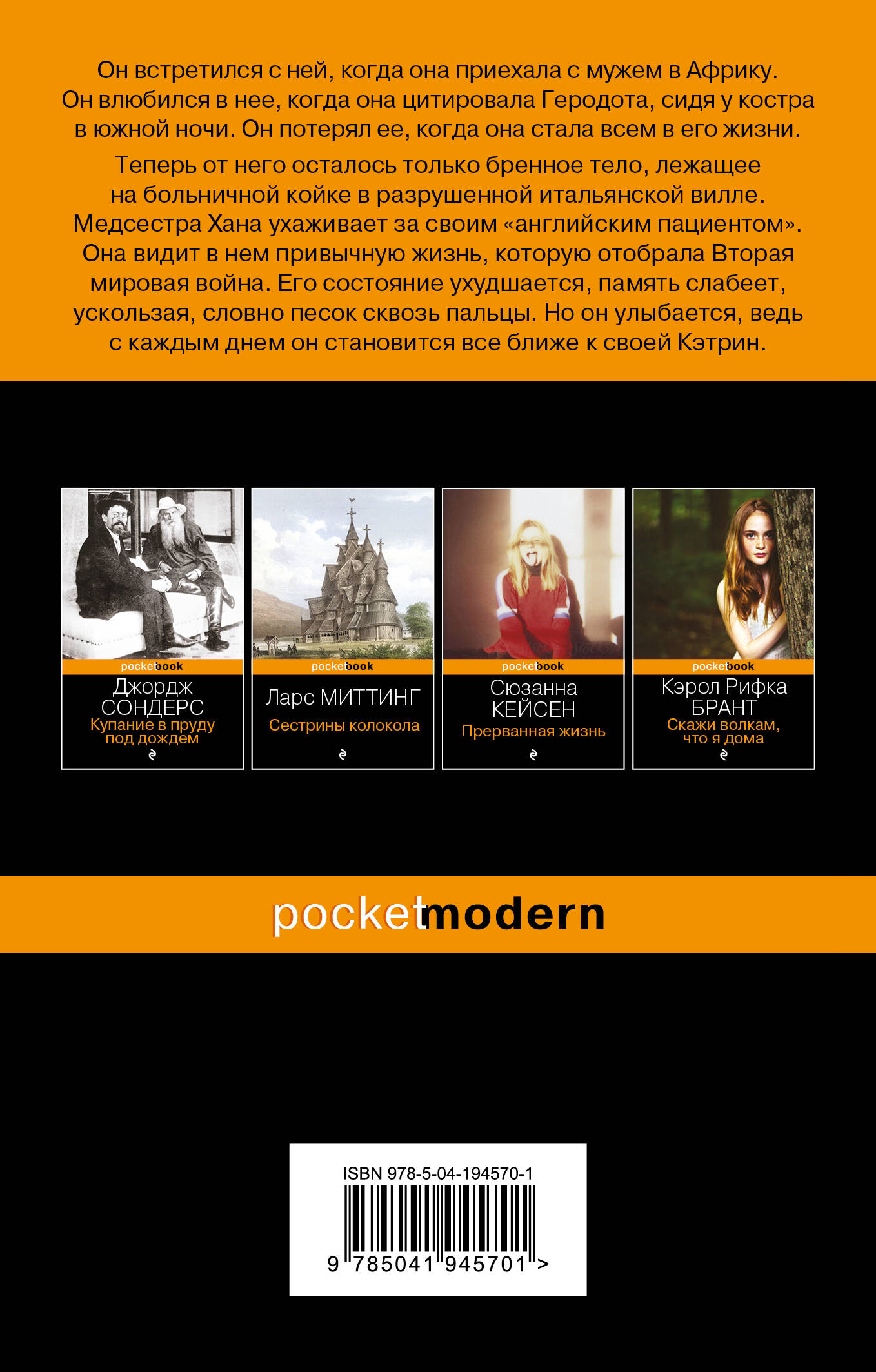 «Английский пациент» - история, удостоенная главных книжных наград. Роман получил Букеровскую премию в 1992 году. В 2018 году «Английский пациент» был удостоен специальной премии «Золотой Букер», которая была приурочена к 50-летию Букеровской премии. Она присуждается по итогам голосования читателей, посчитавших эту книгу лучшим романом из букеровского списка за 50 лет. Книга была адаптирована для экранизации в 1996 году режиссером Энтони Мингеллой. Фильм получил девять «Оскаров», включая «Лучший фильм» и «Лучший режиссер». Он встретился с ней, когда она приехала с мужем в Северную Африку. Он влюбился в нее, когда она цитировала Геродота, сидя у костра в южной ночи. Он потерял ее, когда она стала всем в его жизни. Теперь от него осталось только бренное тело, лежащее на больничной койке в разрушенной итальянской вилле. Медсестра Хана добровольно ухаживает за своим «английским пациентом». Она видит в нем привычную жизнь, которую отобрала Вторая мировая война. Его состояние ухудшается, память слабеет, ускользая словно песок сквозь пальцы. Но он улыбается, ведь с каждым днем он становится все ближе к своей Кэтрин.| Издательство | ООО "Издательство "Эксмо" |