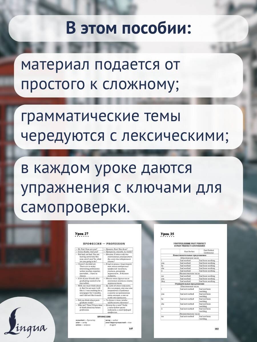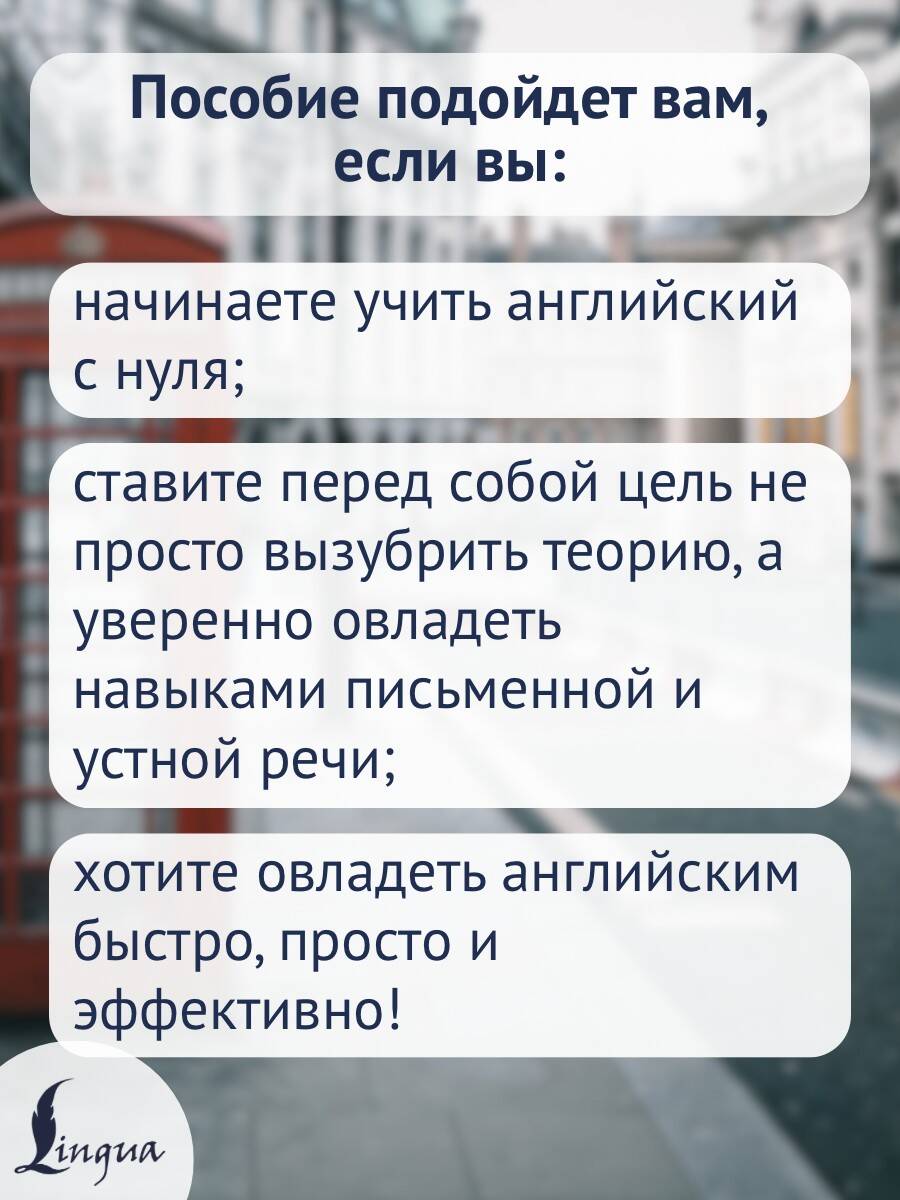 У многих есть предубеждения по поводу самоучителей. Но, чтобы эффективно заниматься самостоятельно и добиваться желаемого результата, нужно соблюдать несколько правил: • разбирать теорию в самоучителе; • искать ответы на все возникающие вопросы и не откладывать их на будущее; • выполнять практические упражнения к каждому уроку; • двигаться дальше, даже если кажется, что вы не идеально изучили прошлый урок. Особый подход к обучению в самоучителе Сергея Матвеева и немного дисциплины помогут поднять уровень английского до B1 и чувствовать себя увереннее в путешествиях или на работе.| Издательство | АСТ |