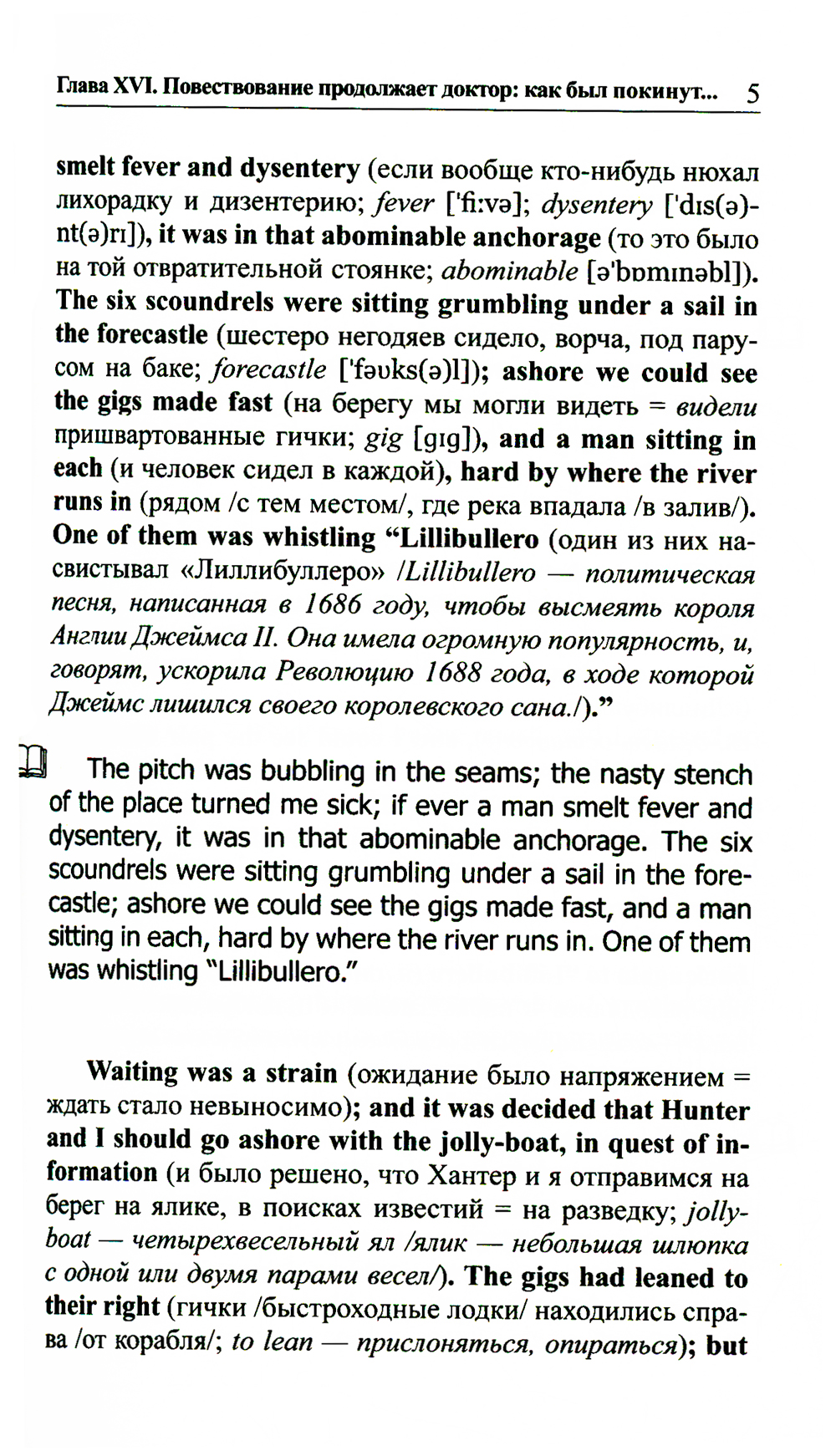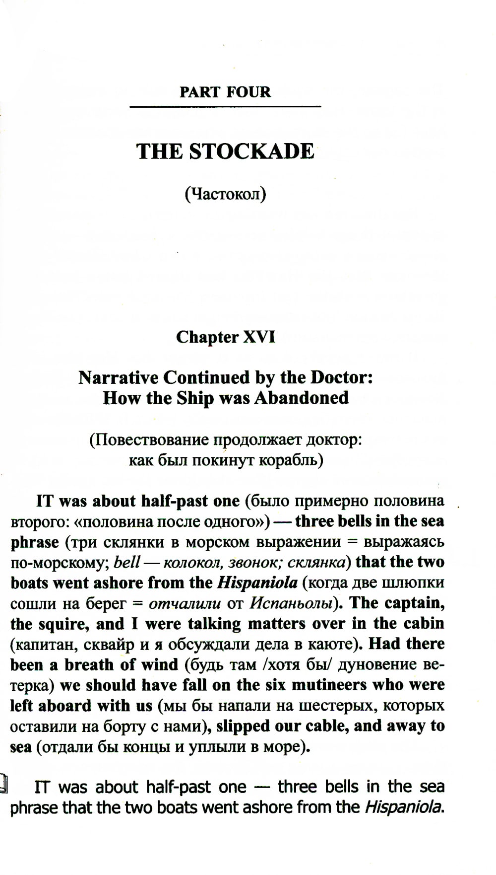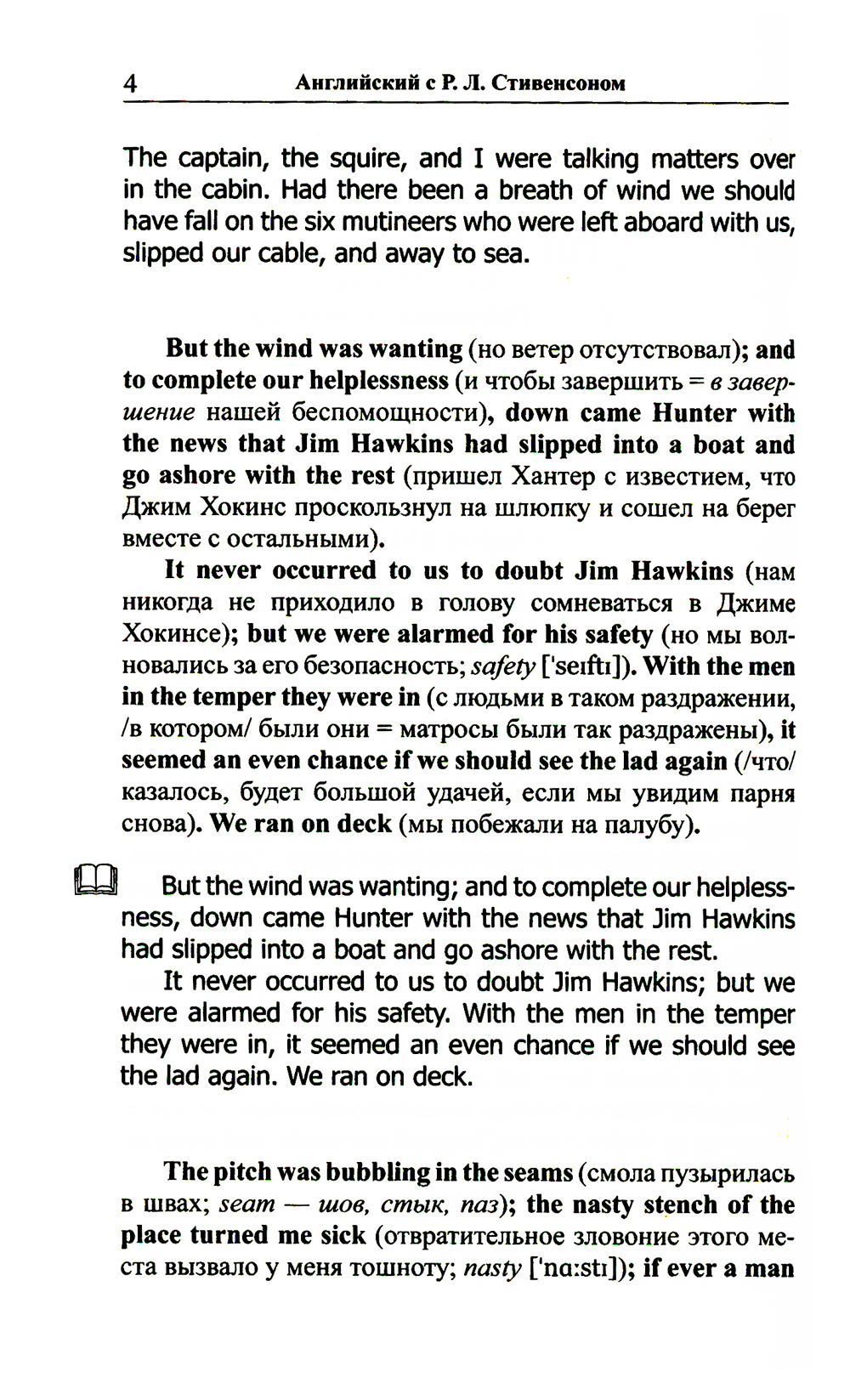 Бессмертный шедевр Стивенсона - захватывающая история о том, как команда отважных друзей отправляется на неведомый остров за сокровищами пиратского капитана Флинта, - адаптирован в настоящем издании по методу Ильи Франка: снабжен дословным переводом на русский язык и необходимым лексико-грамматическим комментарием (без упрощения текста оригинала). Уникальность метода заключается в том, что запоминание слов и выражений происходит за счет их повторяемости, без заучивания и необходимости использовать словарь. Кроме того, читатель привыкает к логике английского языка, начинает его «чувствовать». Издание способствует эффективному освоению языка, может служить дополнением к учебной программе. Для широкого круга лиц, изучающих английский язык и интересующихся культурой англоязычных стран.| Издательство | Восточная книга |