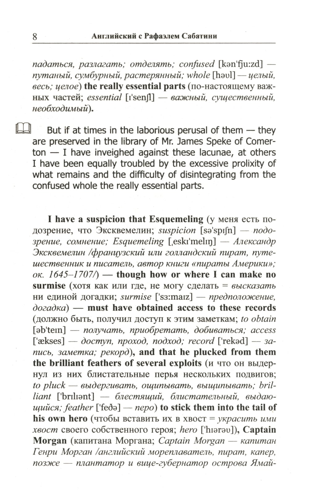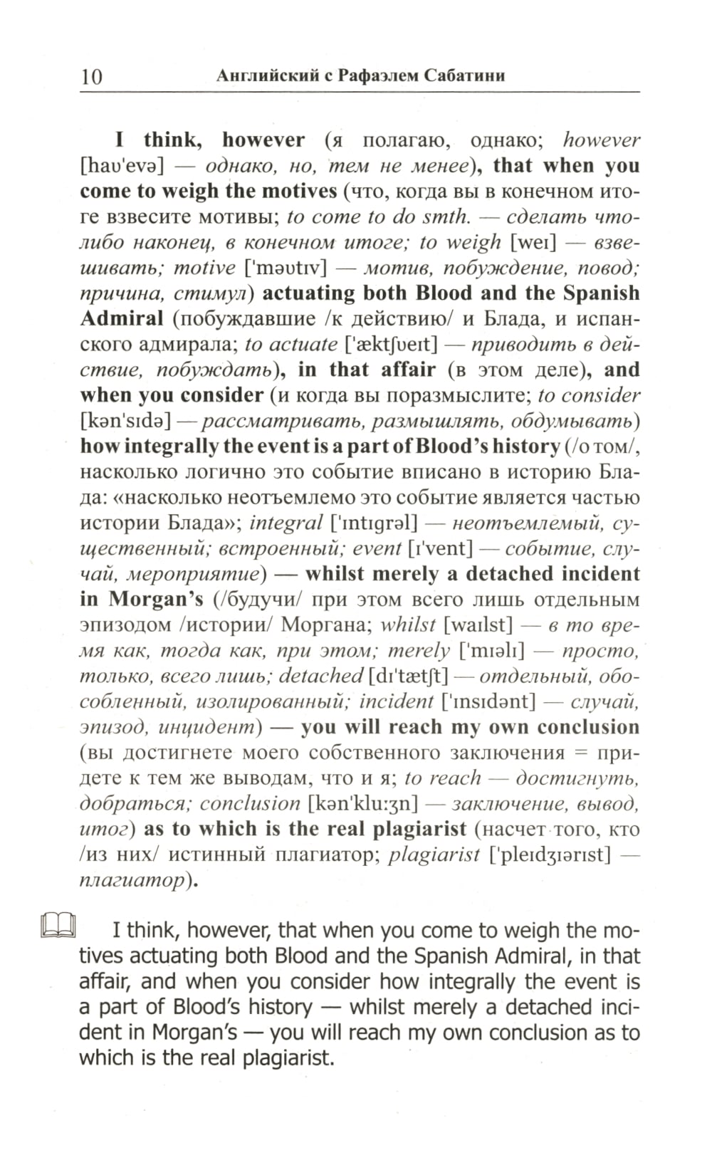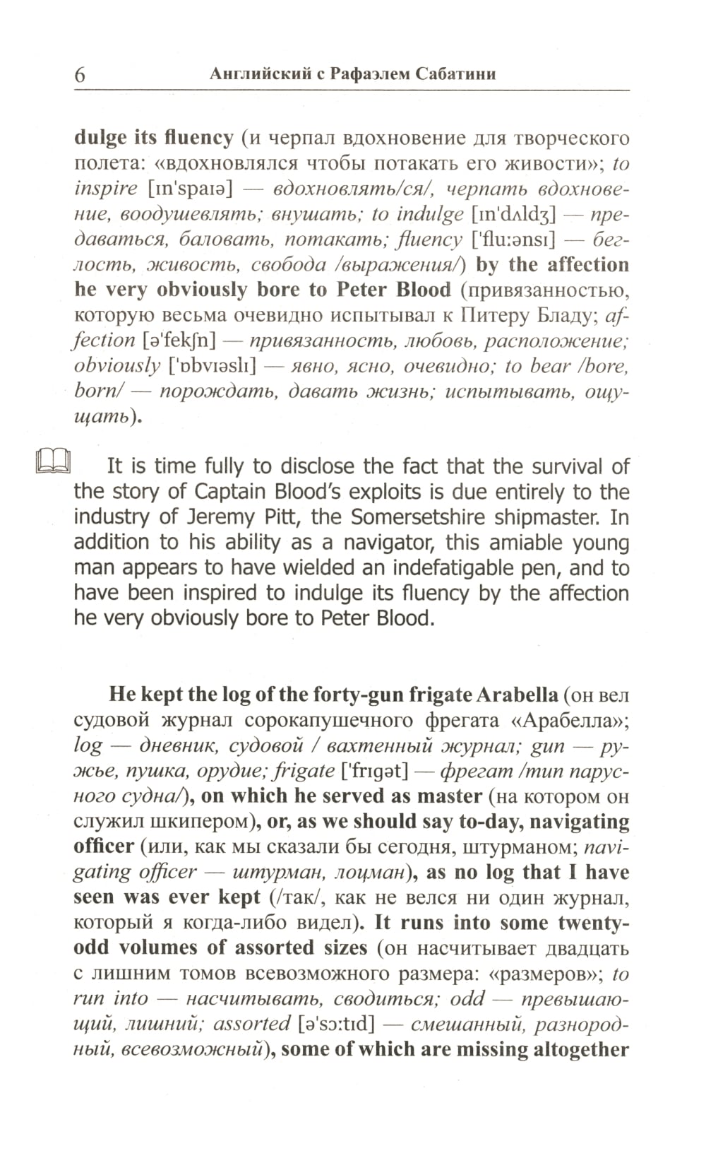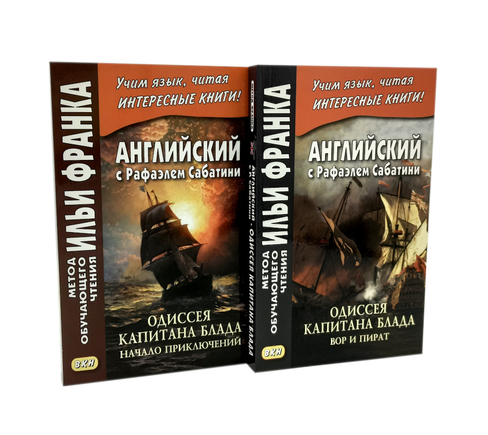 Комплект из 2 книг Рафаэля Сабатини. «Английский с Рафаэлем Сабатини. Одиссея капитана Блада. Начало приключений»: «Одиссея капитана Блада», без сомнения, входит в число лучших приключенческих романов, написанных за всю историю мировой литературы. Повествование о благородном смельчаке, волею судьбы оказавшемся во главе команды пиратов, уже много лет покоряет читателей увлекательным сюжетом и безупречностью в описании исторических реалий. В книгу вошли первые двенадцать глав романа, в которых доктор Питер Блад успевает проделать головокружительный путь от уютной комнаты в особняке на юге Англии до капитанского мостика на захваченном испанском корабле, держащем путь «в царство свободы» на острове Тортуга. Произведение адаптировано по методу Ильи Франка: снабжено дословным переводом на русский язык и необходимым лексико-грамматическим комментарием (без упрощения текста оригинала). Уникальность метода заключается в том, что запоминание слов и выражений происходит за счет их повторяемости, без заучивания и необходимости использовать словарь. Кроме того, читатель привыкает к логике английского языка, начинает его «чувствовать». «Английский с Рафаэлем Сабатини. Одиссея капитана Блада. Вор и пират»: Вторая часть «Одиссеи» повествует о блестящих победах, превративших капитана Блада в одного из самых уважаемых командиров «берегового братства». Однако радость этих побед не может пересилить горечь осознания огромной и непреодолимой пропасти, отделяющей нашего героя от любви всей его жизни... Очередные семь глав романа - с тринадцатой по девятнадцатую - адаптированы в настоящем издании по методу Ильи Франка: снабжены дословным переводом на русский язык и необходимым лексико-грамматическим комментарием (без упрощения текста оригинала). Запоминание слов и выражений при этом происходит за счет их повторяемости, без заучивания и необходимости использовать словарь. Кроме того, читатель привыкает к логике английского языка, начинает его «чувствовать».| Издательство | Восточная книга |