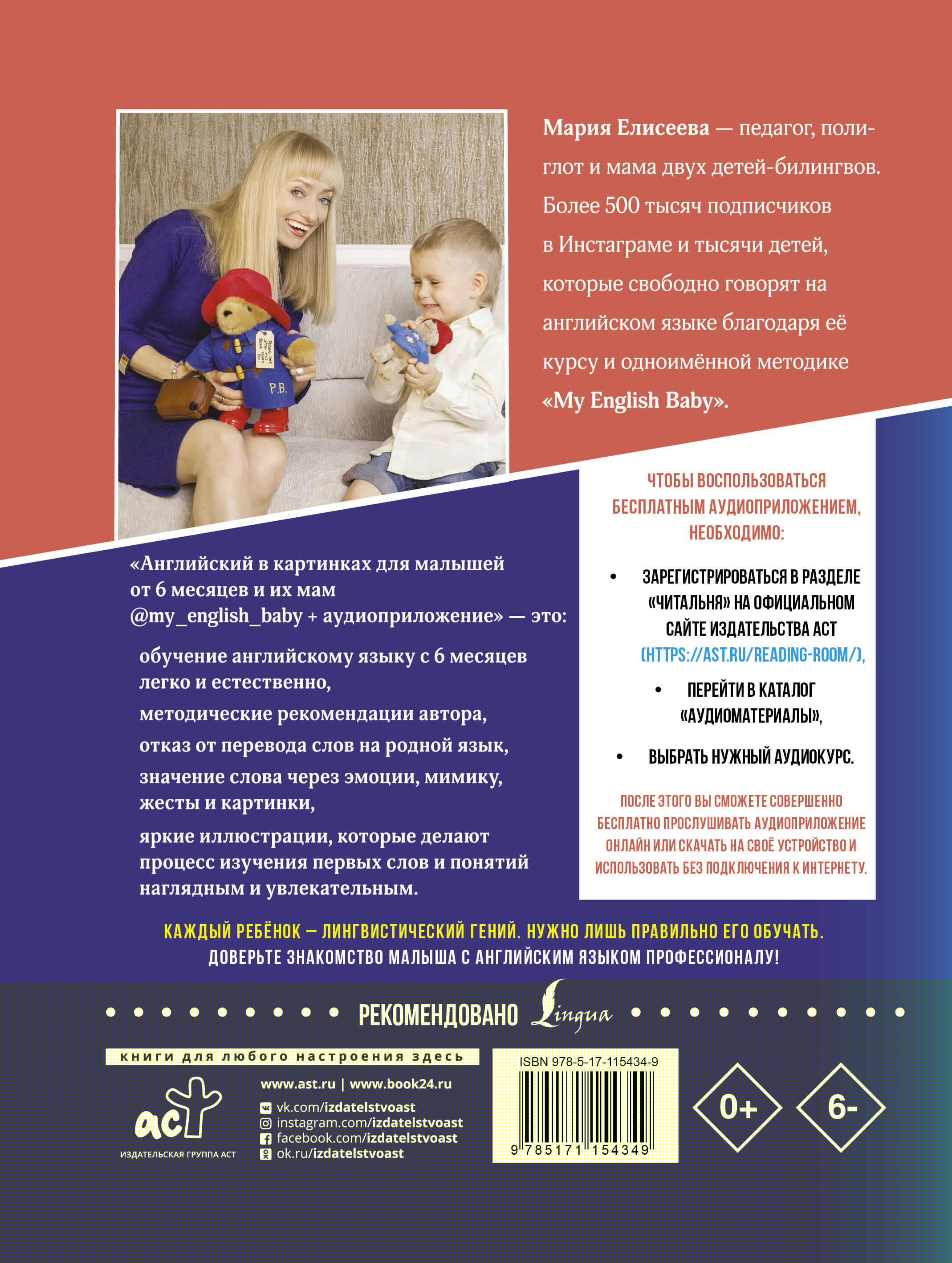 Книга Марии Елисеевой поможет заботливым родителям начать обучение детей английскому языку легко и естественно. Возраст с 6 месяцев - золотое время для изучения нового языка. Малышам неважно, на каком языке говорят с ним близкие, главное - это эмоции. Автор рекомендует не переводить новые слова на родной язык. Яркие картинки делают процесс изучения первых слов и понятий наглядным и увлекательным. Полезным и для родителей, и для детей будет бесплатное аудиоприложение, с помощью которого можно проверить произношение и интонацию. Также эта книга будет полезной и для детей 4-6лет, которые только начинают изучение английского языка. Более 500 000 счастливых родителей в Инстаграме обучают своих детей по методике Марии Елисеевой. Доверьте знакомство малыша с английским языком профессионалу!| Издательство | Издательство "АСТ" |