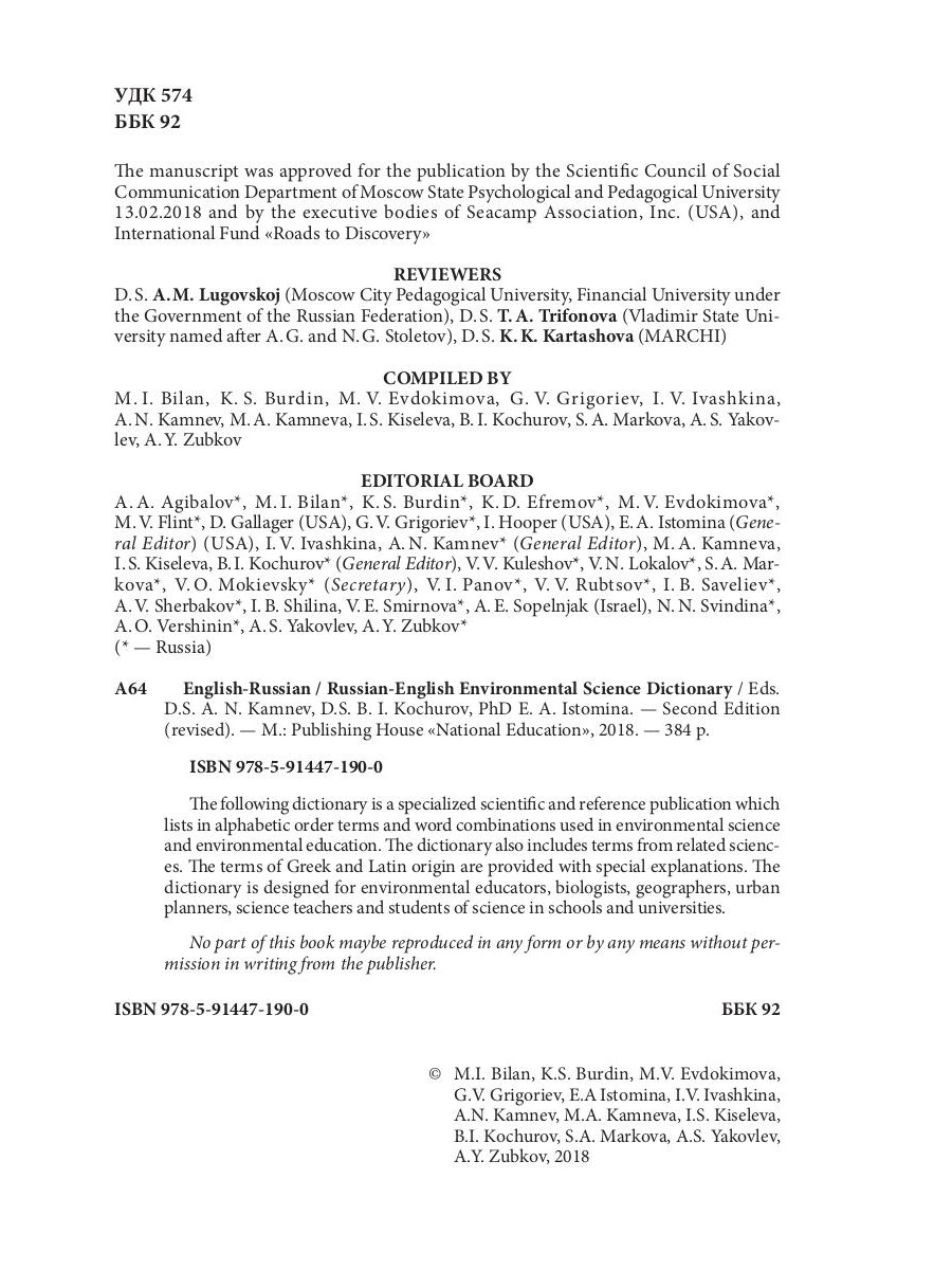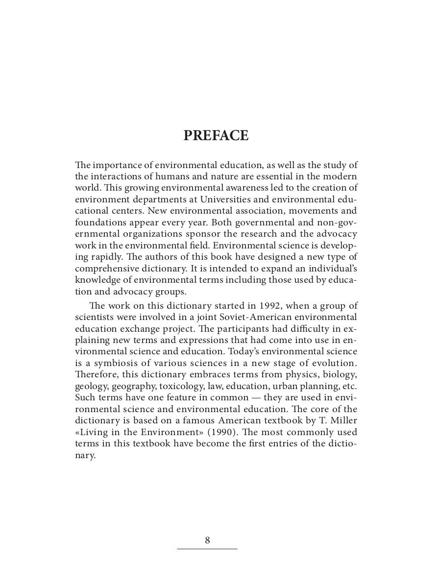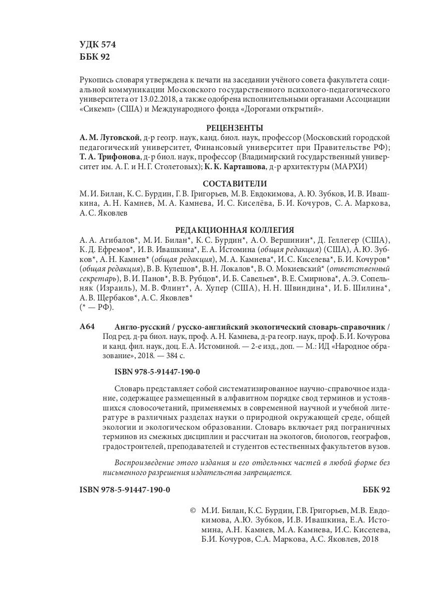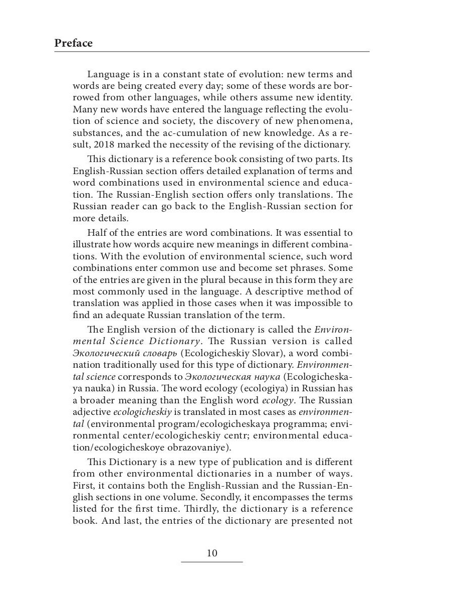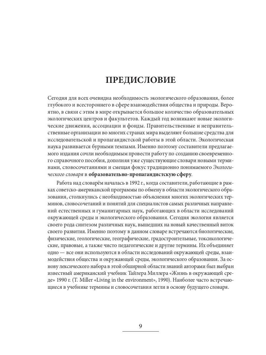 Словарь представляет собой систематизированное научно-справочное издание, содержащее размещенный в алфавитном порядке свод терминов и устоявшихся словосочетаний, применяемых в современной научной и учебной литературе в различных разделах науки о природной окружающей среде, общей экологии и экологическом образовании. Словарь включает ряд пограничных терминов из смежных дисциплин и рассчитан на экологов, биологов, географов, градостроителей, преподавателей и студентов естественных факультетов вузов.