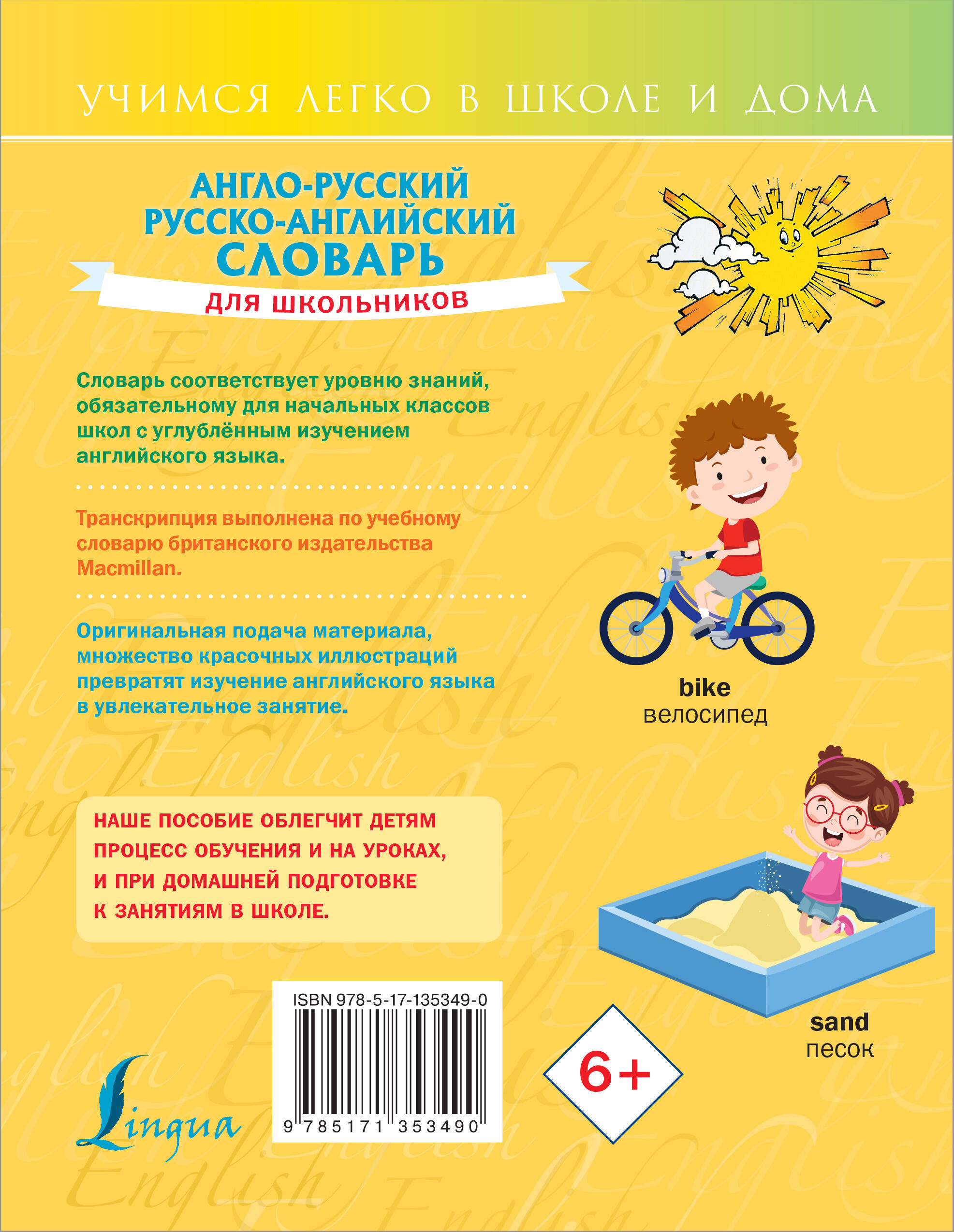 Это англо-русский русско-английский словарь нового поколения для начальной школы. Содержит около 2000 слов и примеров, составляющих лексику, необходимую для учащихся начальных классов школ с углубленным изучением английского языка. Заглавные слова снабжены современной транскрипцией. Транскрипция выполнена по учебному словарю британского издательства Macmillan. Впервые в русско-английской части переводы тоже сопровождаются транскрипцией. Словарь окажет помощь учащимся при заучивании новых слов, выполнении домашних заданий, а также будет полезен для учителей английского языка и родителей.| Издательство | Издательство "АСТ" |