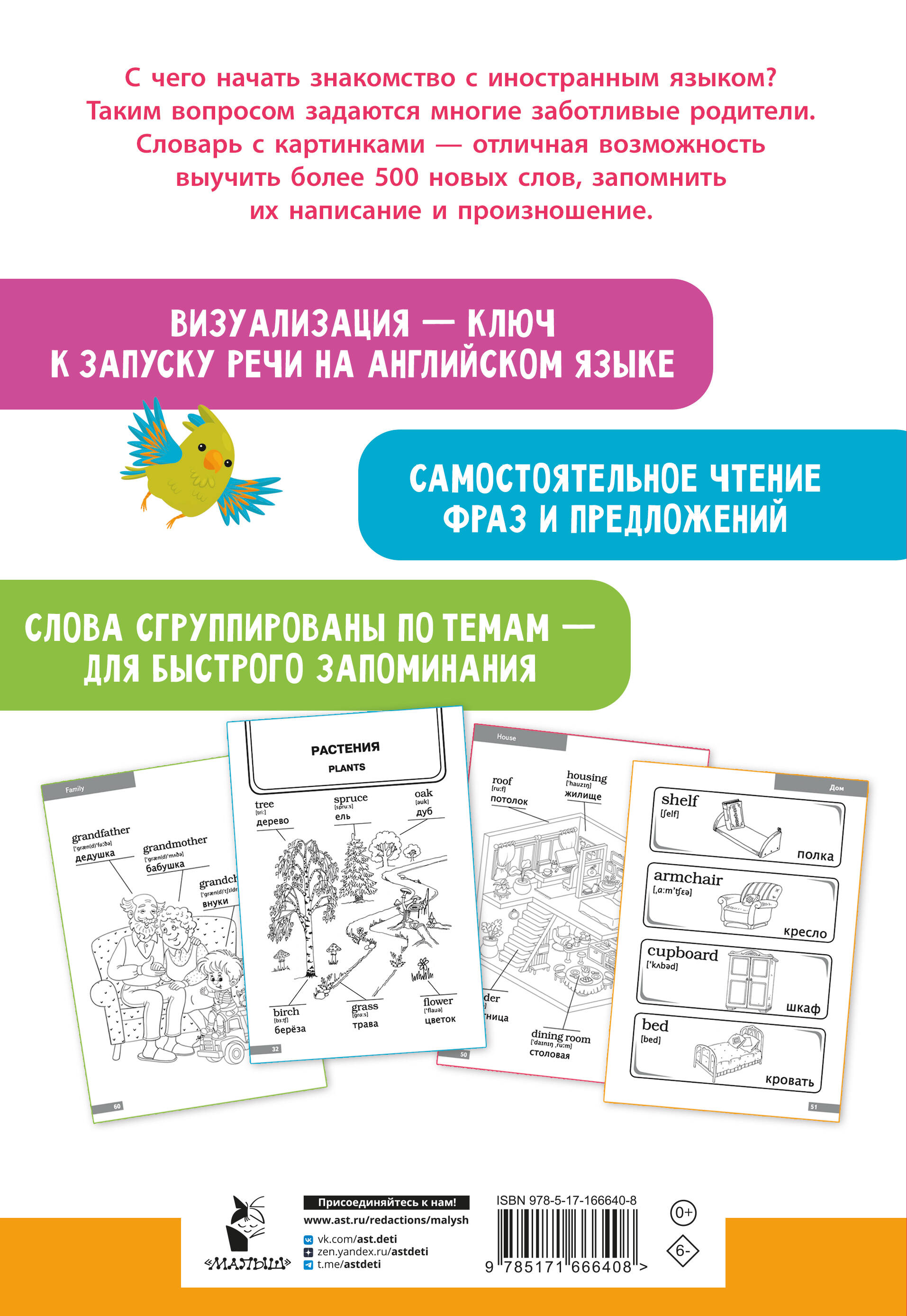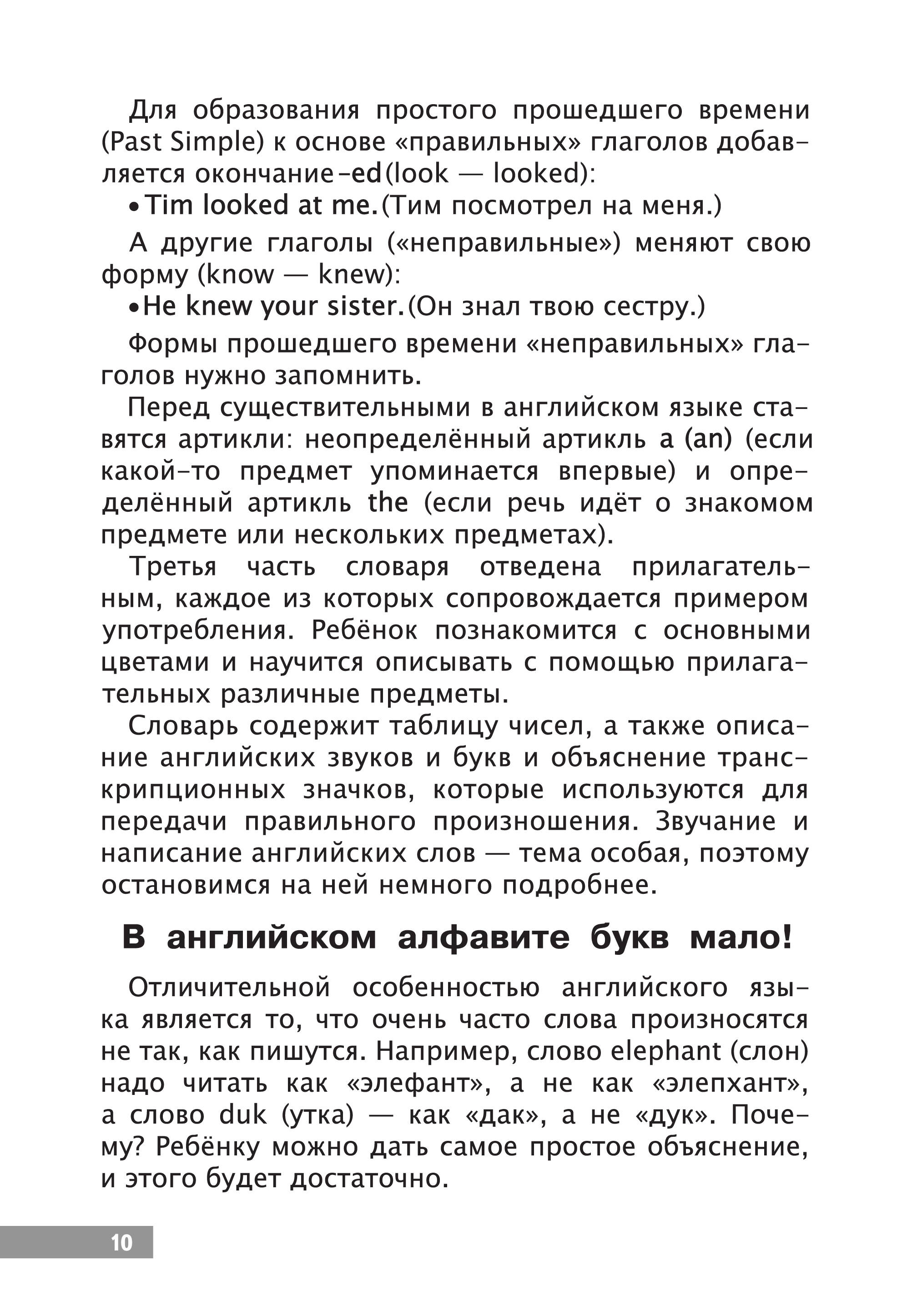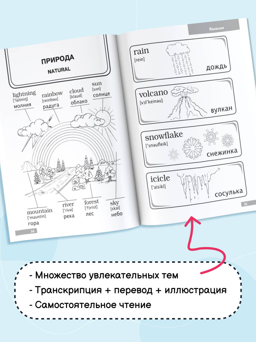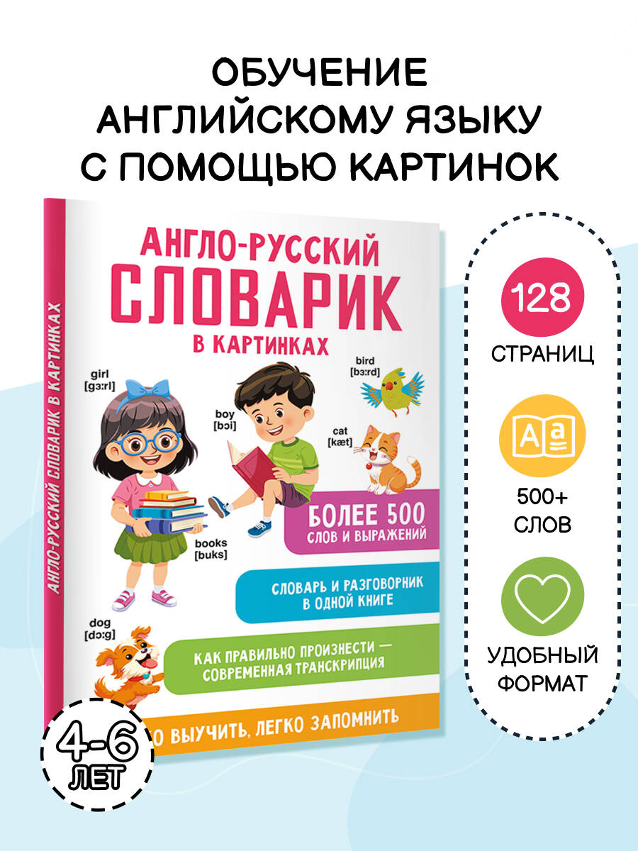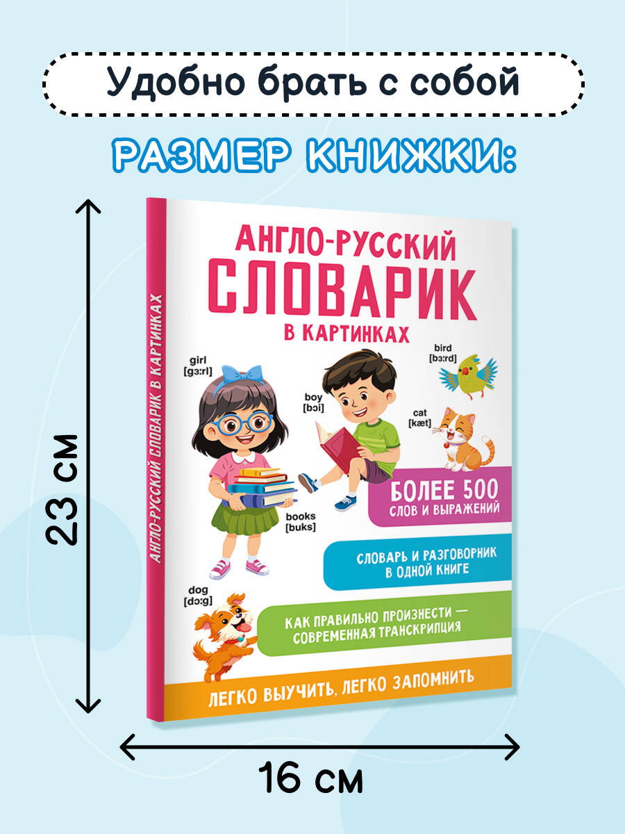 Словарь включает в себя три раздела: существительные, глаголы и прилагательные. Каждое слово иллюстрируется картинкой. Слова сгруппированы по темам - для быстрого запоминания. Начальные навыки самостоятельного чтения на английском языке. Активизация словарного запаса, выведение изученных слов в речь. «Англо-русский словарик в картинках» познакомит ребёнка с английским алфавитом и правилами произношения английских звуков. Это отличная возможность выучить более 500 английских слов и числа от 1 до 100, а также комплексная тренировка для мозга, интересное и полезное занятие для ребят, начинающих своё знакомство с английским языком. Книга построена по тематическому принципу: можно изучать слова не отдельно, а группами - так у ребёнка зарождается интерес к языку, появляется мотивация к его освоению. Для каждого слова на английском - транскрипция + перевод + иллюстрация. Такая подача материала помогает сформировать ассоциации, тренирует зрительную память. Обучение с помощью картинок - метод, давно доказавший свою эффективность, позволяющий упростить и облегчить процесс запоминания, и за короткий срок добиться высоких результатов. Наш словарь, адаптированный для зрительного восприятия, в первую очередь предназначается для занятий английским языком с детьми в возрасте от 4 до 6 лет, но также может быть полезен младшим школьникам.| Издательство | Издательство "АСТ" |