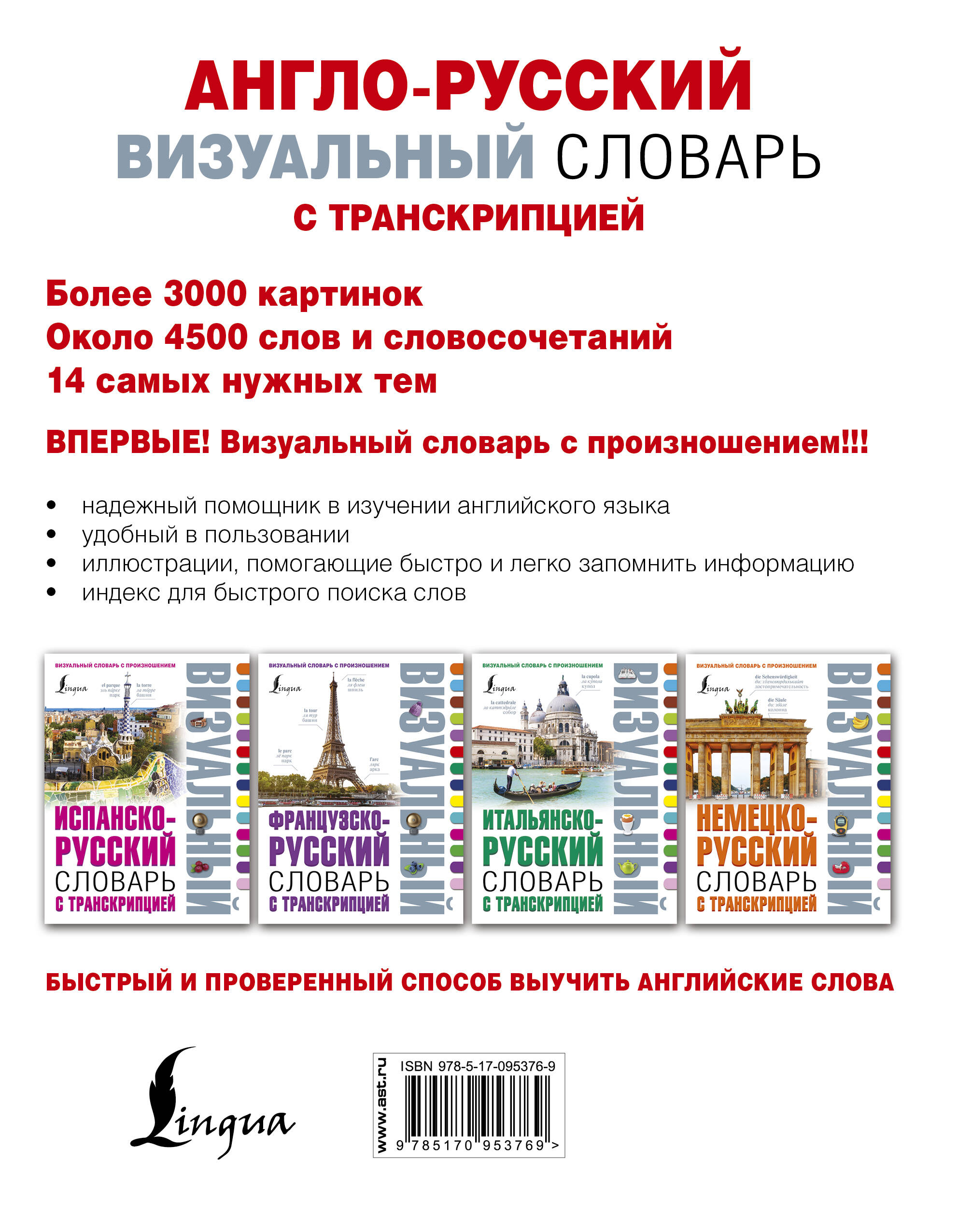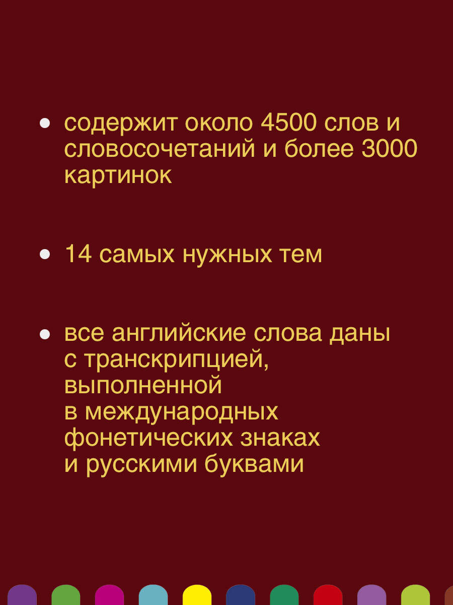 Впервые на книжном рынке англо-русский визуальный словарь, в котором все английские слова снабжены транскрипцией и в международных фонетических знаках, и русскими буквами. В этом издании: - Около 4500 слов и словосочетаний. - Более 3000 картинок, помогающих быстро и легко запомнить информацию. - 14 самых нужных тем: Дом, Люди, Здоровье, Работа, Обучение, Покупки, Пища, Общественное питание, Службы, Транспорт, Досуг, Спорт, Окружающая среда, Флора и фауна. - В конце словаря удобный указатель для поиска нужных слов. Словарь способствует быстрому обогащению словарного запаса по всем самым важным областям жизни и деятельности человека. С этим словарем можно заметно ускорить процесс изучения английского языка.| Издательство | ИЗДАТЕЛЬСТВО "АСТ" |