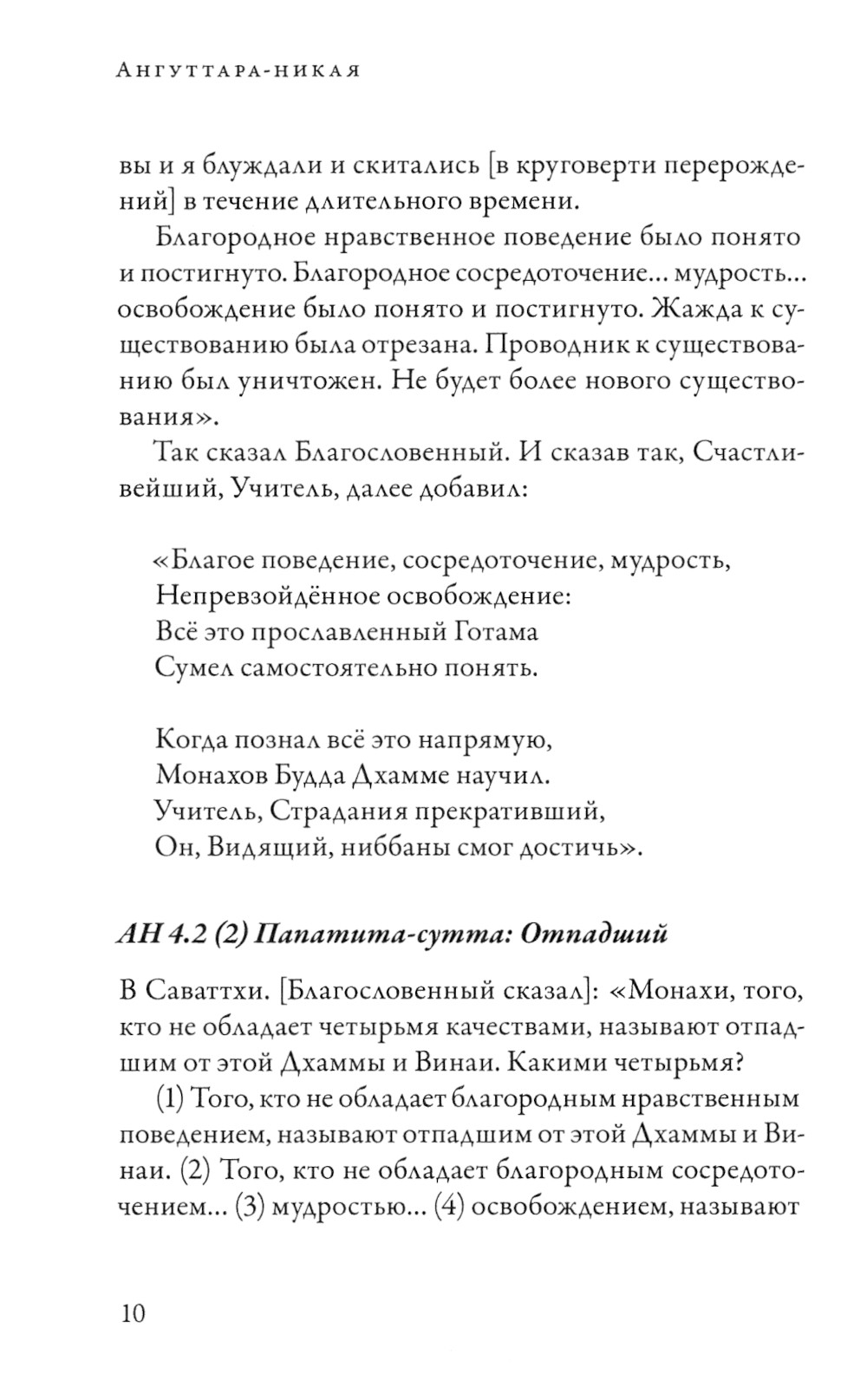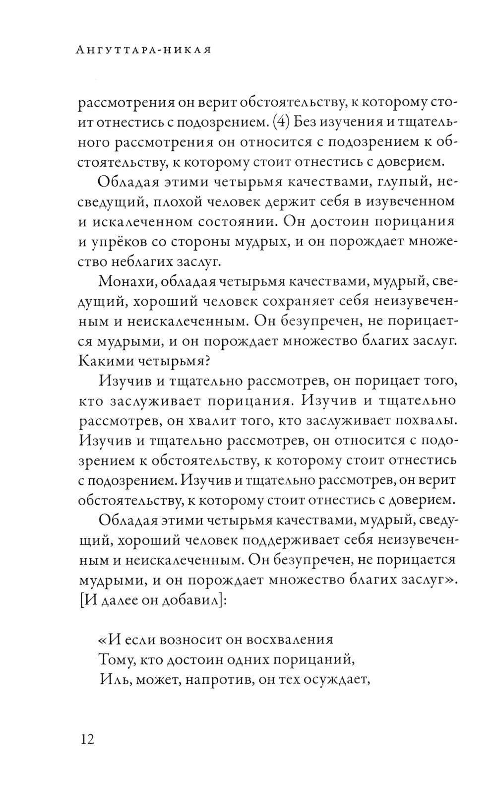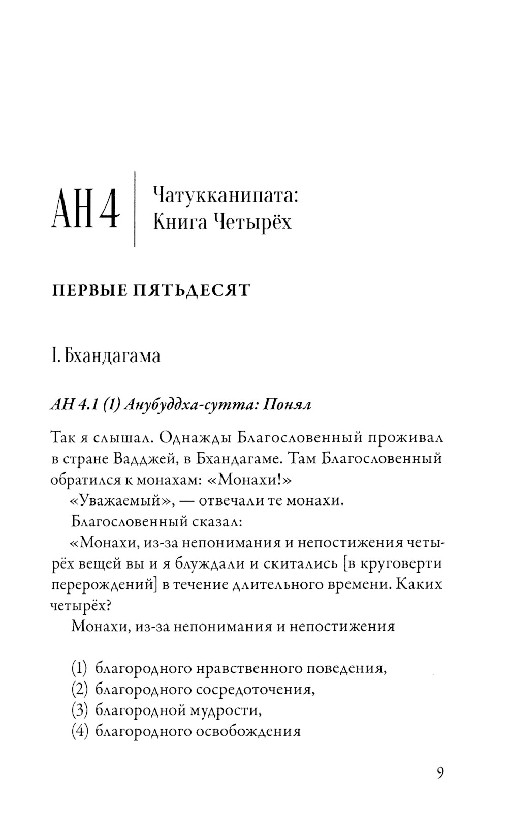 Ангуттара-никая, или «Номерные наставления Будды», - это четвёртое из четырёх больших собраний Сутта-питаки Палийского канона. Она состоит из 11 нипат, или книг, которые в общей сложности содержат почти десять тысяч коротких сутт. Большая часть из них, однако, является повторами с незначительными изменениями, поэтому уникальных текстов насчитывается порядка четырёх тысяч. В основе Ангуттара-никаи лежит номерная схема, в которой сутты, содержащие определённое количество рассматриваемых пунктов, включены в соответствующую этому числу книгу. Это способствовало более лёгкому запоминанию и освоению материала в древние века, когда письменность только начинала зарождаться, а все учения передавались в устной форме. В данном издании АН разделена на четыре тома. Второй том содержит Книгу Четырёх и Книгу Пяти. Тематика сутт охватывает самые разные аспекты буддийского учения.| Издательство | Изд. Ганга |