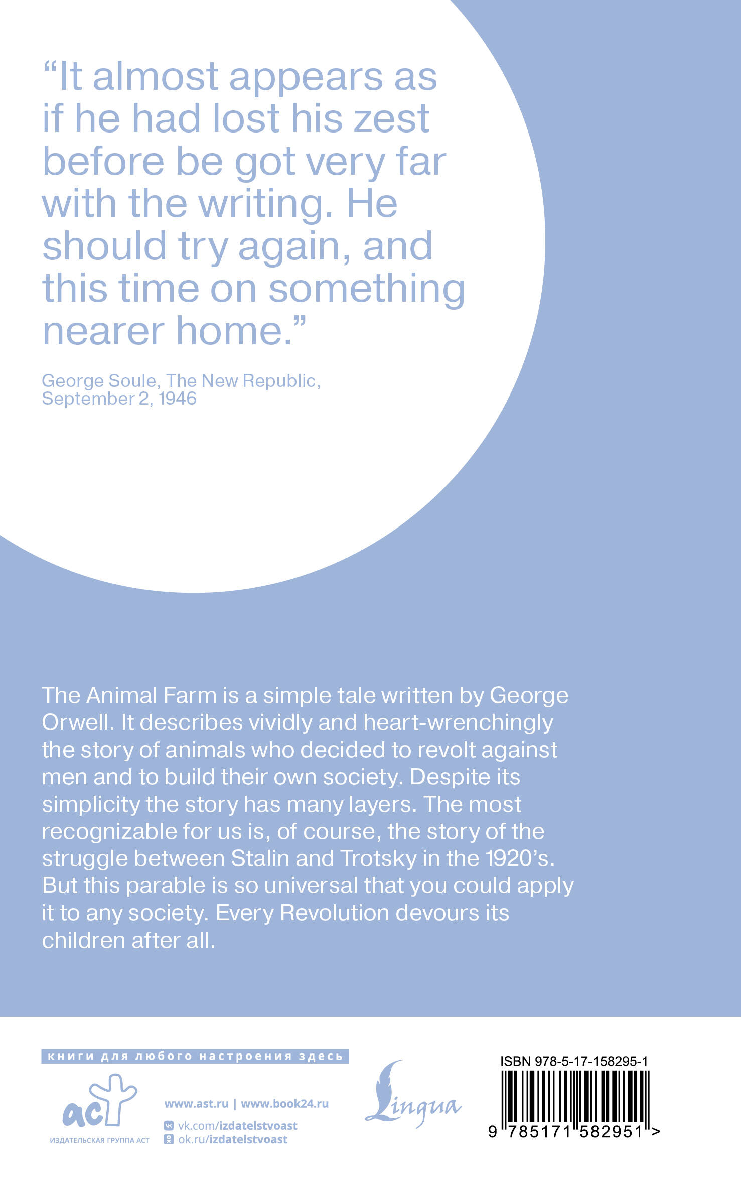 Добро пожаловать на "Скотный двор"! Здесь животные построили своё, справедливое, общество. Мы живём бок о бок, мы совершенно равны, и вместе трудимся на общее благо. Просторные загоны, честная трудовая пайка, сообщество единомышленников - здесь будет всё, о чем только можно мечтать. И никаких назойливых людей. Здесь больше не свистнет бич в руках человека, и некому будет понукать честных трудяг. Не упустите свой шанс присоединиться к нам и наслаждаться жизнью вместе с нами! Сделаем весь мир таким, как "Скотный двор"! "Скотный двор" - сатирическая повесть Джорджа Оруэлла. Язык её прост и понятен, и потому доступен даже начинающему читателю. Повесть дана в оригинале, без сокращений и адаптации.| Издательство | ИЗДАТЕЛЬСТВО "АСТ" |
