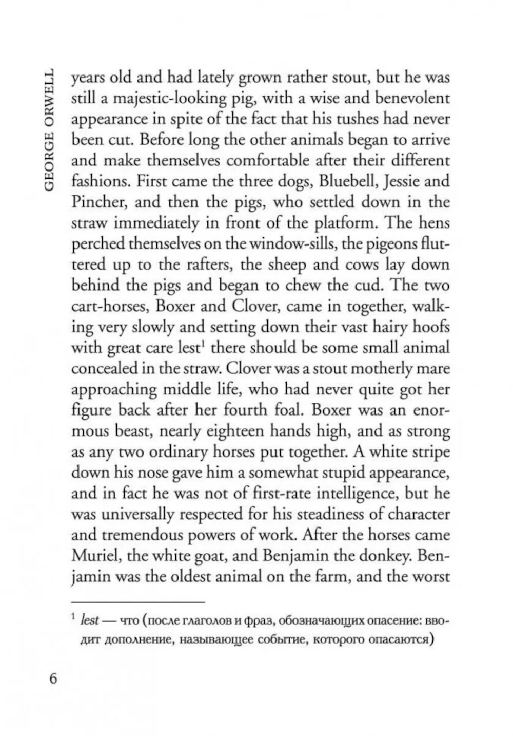 Джордж Оруэлл (настоящее имя Эрик Артур Блэр, 1903-1950), английский писатель и публицист. Сатирическая повесть-притча «Скотный двор» (1945) представляет собой не только аллегорию русской революции, но и повествует о тех сложностях и проблемах, с которыми может столкнуться построение любого справедливого общества, каковы бы ни были прекраснодушные идеалы его лидеров. Непомерные амбиции, эгоизм и лицемерие могут привести к извращению и предательству этих идеалов. В нашей стране эта «сказка с политическим значением», как определил жанр книги сам автор, стала известна широкому читателю в 1988 году. В сборник включена также подборка самых ярких эссе, открывающих интереснейшие моменты из жизни писателя. Книга представляет собой неадаптированный текст для чтения. Предназначена для учащихся старших классов языковых школ, вузов, курсов иностранных языков и самостоятельного чтения. Тексты снабжены заданиями на понимание, примечаниями и словарем.| Издательство | Каро |