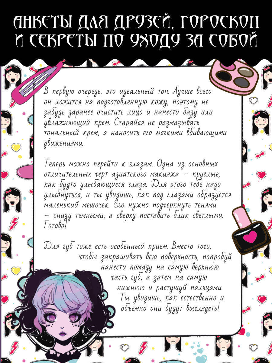 Этот милый дневничок станет прекрасным подарком для любой девочки, которая хочет познакомиться с азиатской культурой и любит аниме и готику. В нем можно украсить страницы, познакомиться с японскими гаданиями и секретами ухода за кожей, узнать о себе что-то новое благодаря волшебному тесту и загадочным гороскопам! Для младшего школьного возраста| Издательство | Издательство "АСТ" |