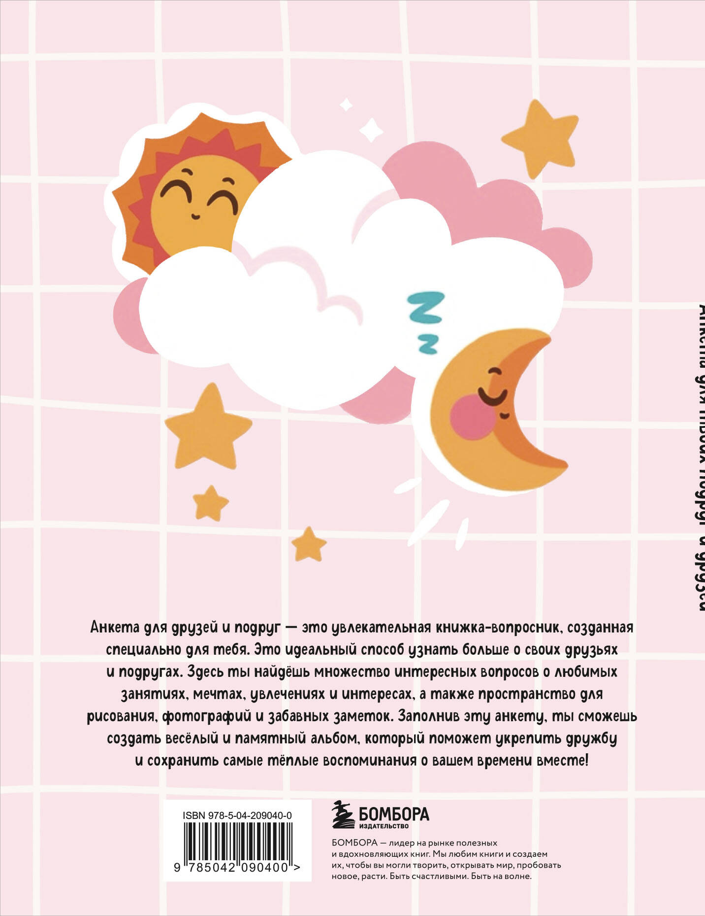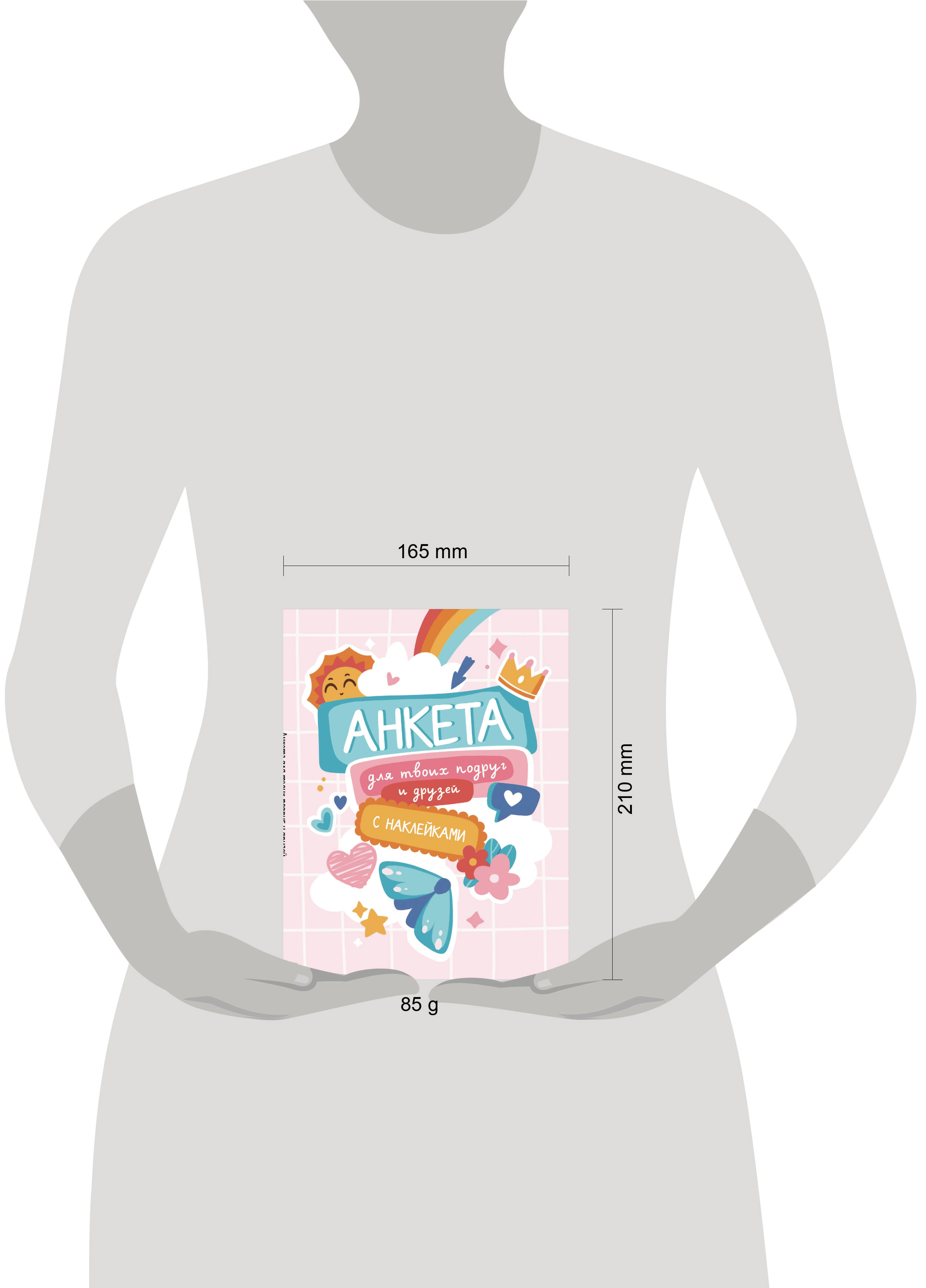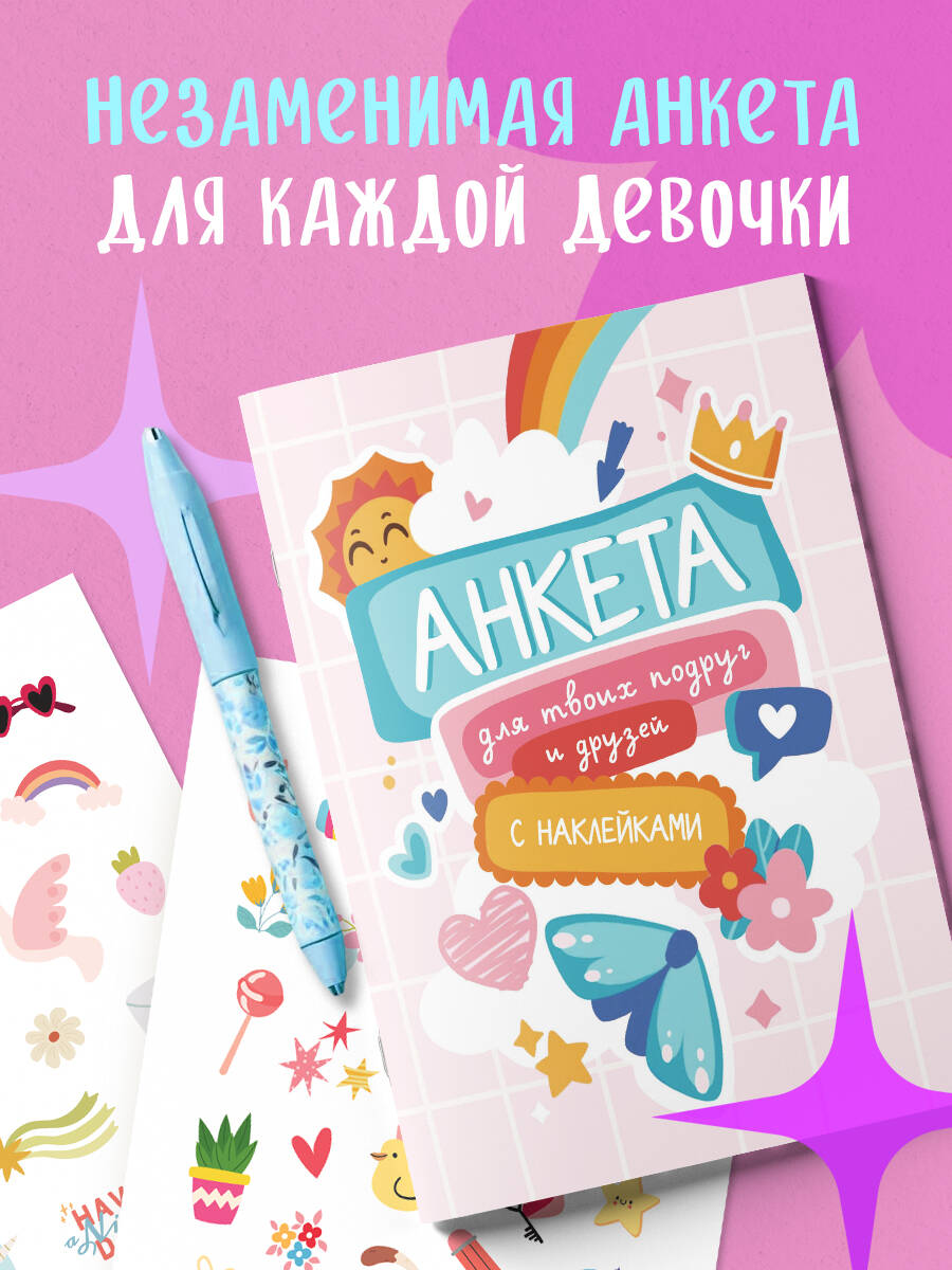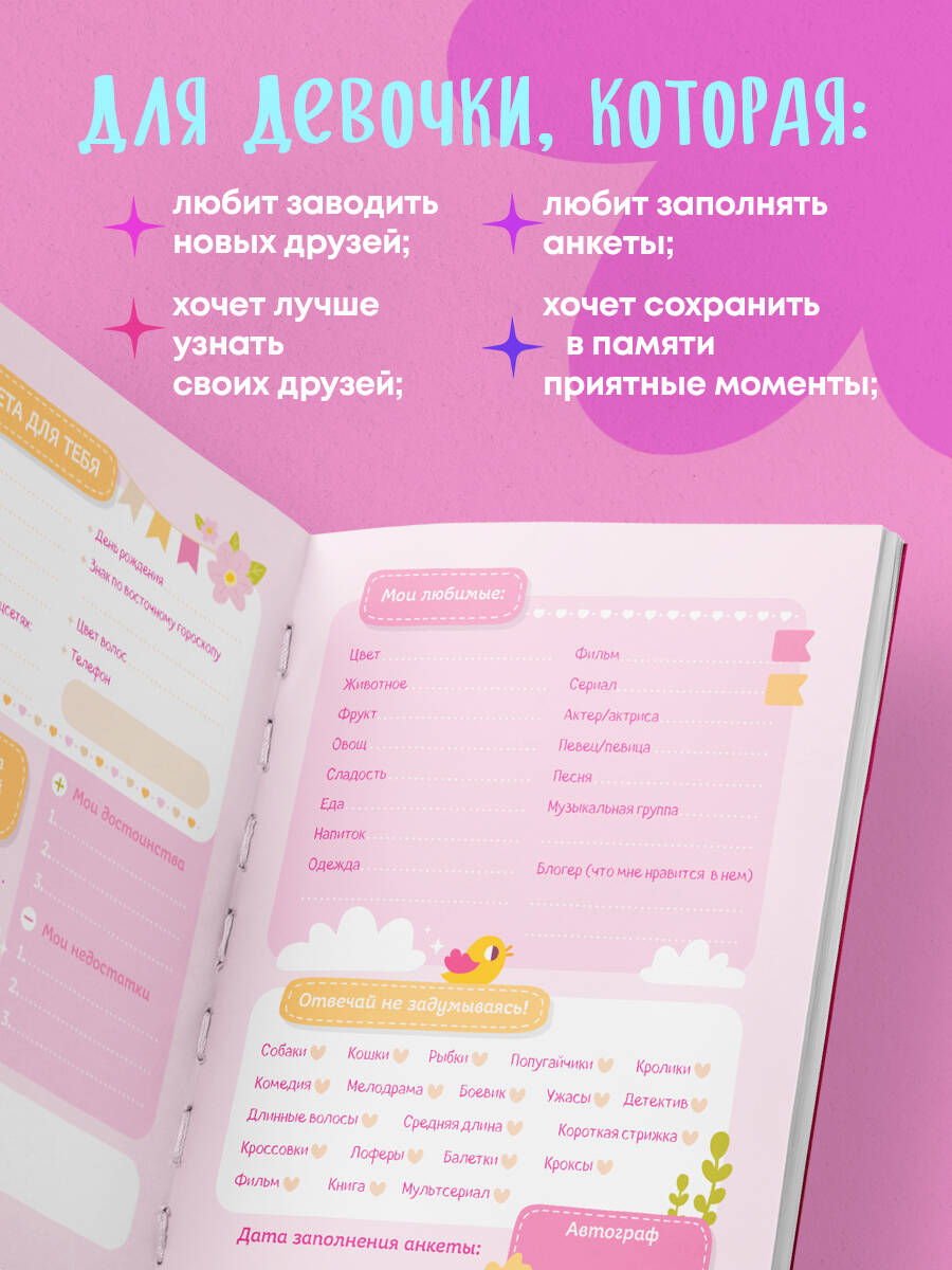 Анкета - просто незаменимый атрибут для каждой девочки! Она идеально подходит для той, которая: - хочет лучше узнать своих подруг и друзей; - хочет сохранить в памяти все приятные моменты и воспоминания; - любит знакомиться с новыми людьми и заводить новых друзей; - любит заполнять анкеты, проходить тесты и составлять подборки любимых книг, фильмов и т.д. С его помощью девочка сможет: - заполнить собственную анкету; - предложить каждому другу и подруге заполнить анкету; - узнать что-то новое о себе и своих друзьях. Технические параметры: - удобный формат А5 (162×210 мм); - 32 страницы на плотной офсетной бумаге; - стильная обложка из лакированного картона; - яркий блок. - стильные наклейки-стикеры. Красочно оформленная анкета станет отличным подарком для девочки младшего и среднего школьного возраста. А качественные материалы, из которых она выполнена, позволят сохранить записанное в него на долгие годы.| Издательство | ООО "Издательство "Эксмо" |