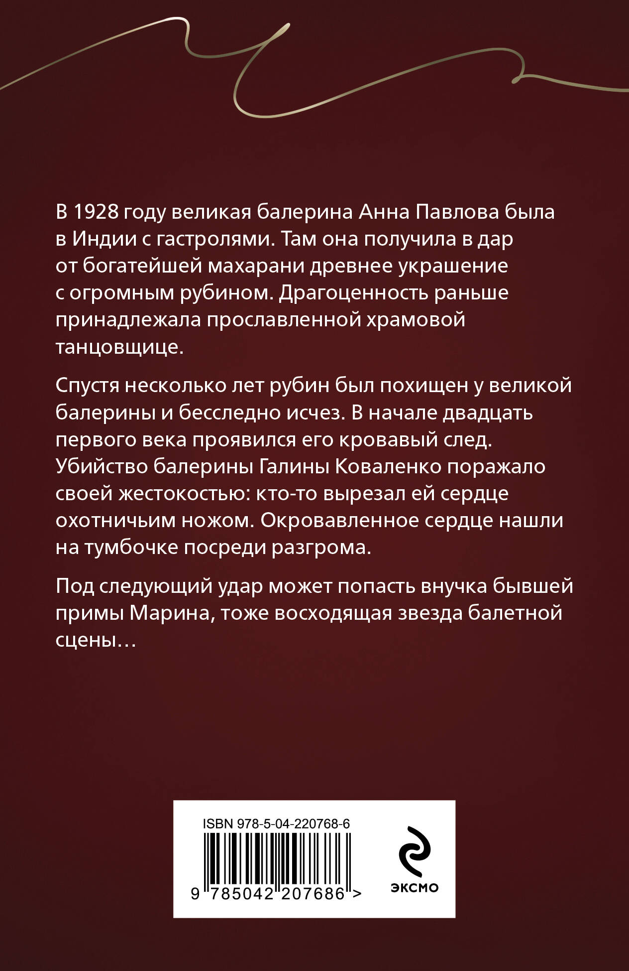 В 1928 году великая балерина Анна Павлова на гастролях в Индии получила в дар от богатейшей Махарани древнее украшение с огромным рубином. Драгоценность раньше принадлежала прославленной храмовой танцовщице. Спустя несколько лет подвеска с камнем была похищена и бесследно исчезла. В начале двадцать первого века проявился ее кровавый след. Убийство балерины Галины Коваленко поражало своей жестокостью: кто-то вырезал ей сердце охотничьим ножом и оставил на тумбочке посреди разгрома. Под следующий удар может попасть внучка бывшей примы Марина, тоже восходящая звезда балетной сцены… Тайну рубина вы узнаете, прочитав детектив Юлии Алейниковой.| Издательство | ООО "Издательство "Эксмо" |