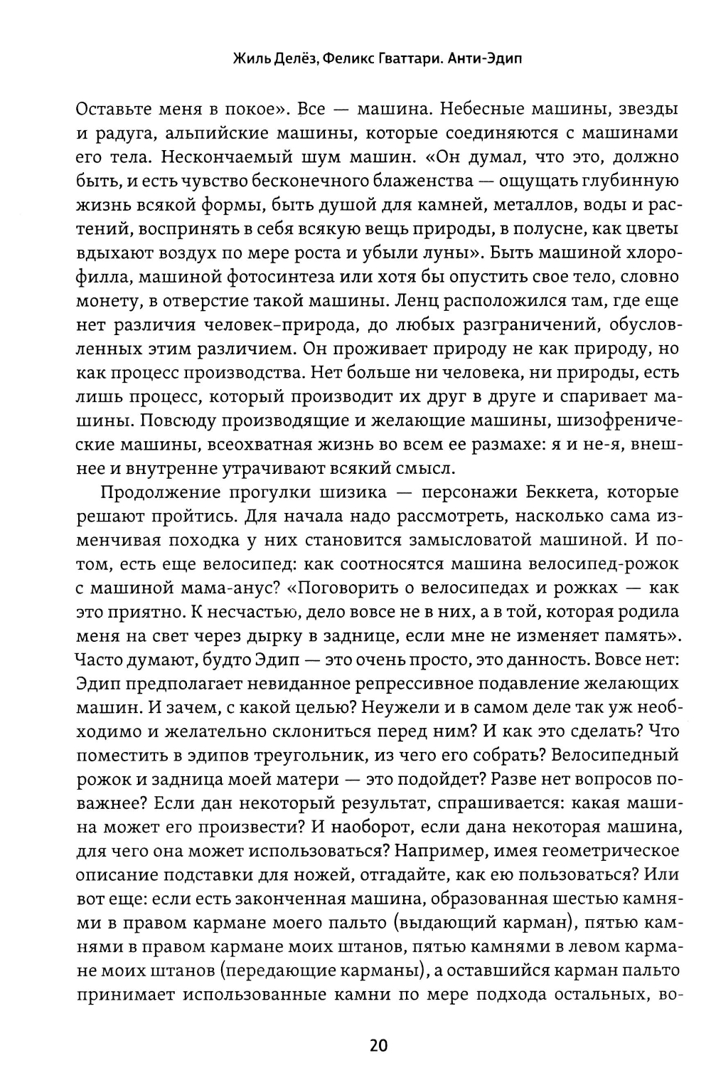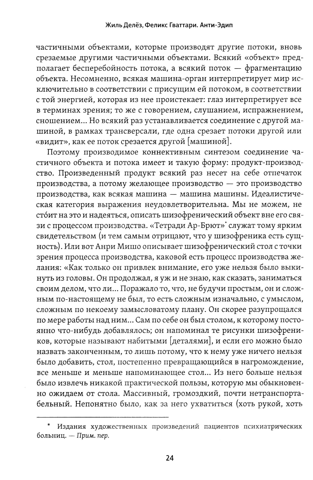 «Анти-Эдип» стал символом тотального переустройства психоаналитической теории, переосмыслением главной фрейдистской концепции - эдипова комплекса. Жиль Делёз и Феликс Гваттари начинают деконструкцию фрейдизма с критики представлений о «семейном треугольнике» как об основной структуре бессознательного, ведь в таком качестве он превращается в инструмент подавления. Более того, «эдиповские» психоаналитики, чувствуя за собой поддержку полиции и санитаров, зачастую сами готовы подвергать людей репрессиям - за отказ от «эдипизации». Авторы показывают, что по ту сторону псевдооппозиции «семья - общество» лежит отношение между бессознательным желанием и общественным производством. Шизофрения - это внешний предел капиталистической системы, вблизи которого декодированные потоки желания сметают все на своем пути. Капитализм постоянно стремится к этому пределу - и постоянно его отодвигает. Шизик - одновременно и герой, и враг капитализма, поскольку выдает его главную тайну.