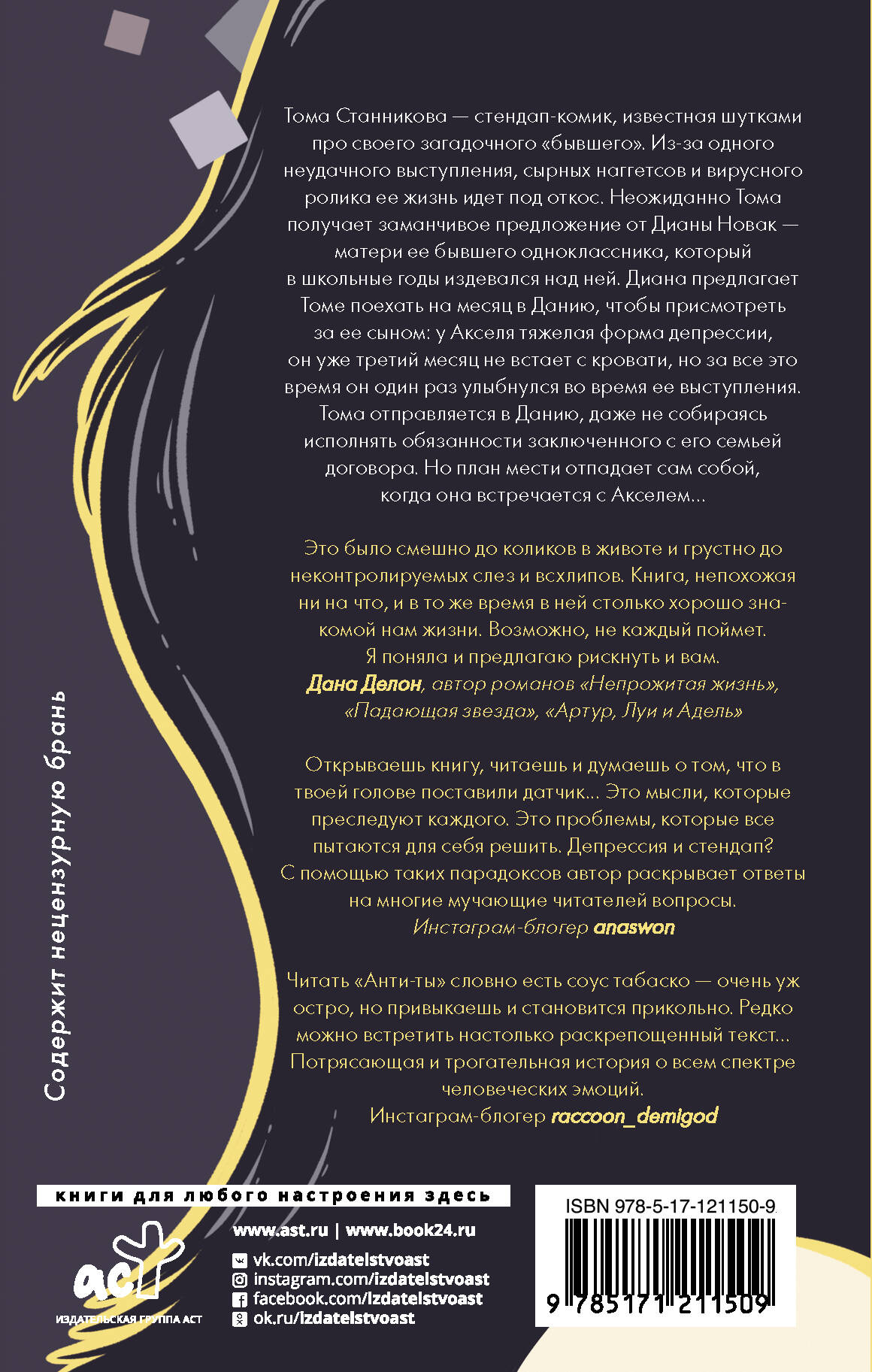 Тома Станникова - стендап-комик, известная шутками про своего загадочного "бывшего". Из-за одного неудачного выступления, сырных наггетсов и вирусного ролика ее жизнь идет под откос. Неожиданно Тома получает заманчивое предложение от Дианы Новак - матери ее бывшего одноклассника, который в школьные годы издевался над ней. Диана предлагает Томе поехать на месяц в Данию, чтобы присмотреть за ее сыном: у Акселя тяжелая форма депрессии, он уже третий месяц не встает с кровати, но за все это время он один раз улыбнулся во время ее выступления. Тома отправляется в Данию, даже не собираясь исполнять обязанности заключенного с его семьей договора. Но план мести отпадает сам собой, когда она встречается с Акселем… Это было смешно до коликов в животе и грустно до неконтролируемых слез и всхлипов. Книга, непохожая ни на что, и в то же время в ней столько хорошо знакомой нам жизни. Возможно, не каждый поймет. Я поняла и предлагаю рискнуть и вам. Дана Делон, автор романов "Непрожитая жизнь", "Падающая звезда", "Артур, Луи и Адель"| Издательство | ИЗДАТЕЛЬСТВО "АСТ" |