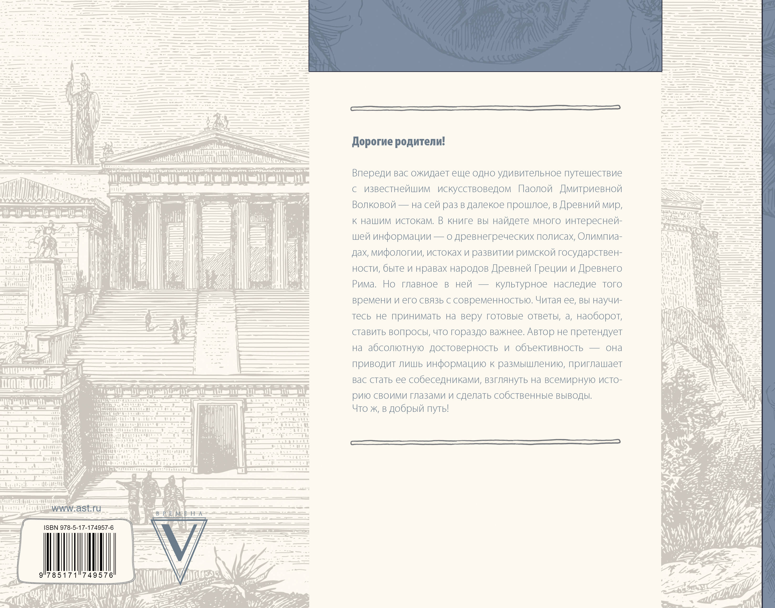 Дорогие родители! Впереди вас ожидает еще одно удивительное путешествие с известнейшим искусствоведом Паолой Дмитриевной Волковой - на сей раз в далекое прошлое, в Древний мир, к нашим истокам. В книге вы найдете много интереснейшей информации - о древнегреческих полисах, Олимпиадах, мифологии, истоках и развитии римской государственности, быте и нравах народов Древней Греции и Древнего Рима. Но главное в ней - культурное наследие того времени и его связь с современностью. Читая ее, вы научитесь не принимать на веру готовые ответы, а, наоборот, ставить вопросы, что гораздо важнее. Автор не претендует на абсолютную достоверность и объективность - она приводит лишь информацию к размышлению, приглашает вас стать ее собеседниками, взглянуть на всемирную историю своими глазами и сделать собственные выводы. Что ж, в добрый путь!