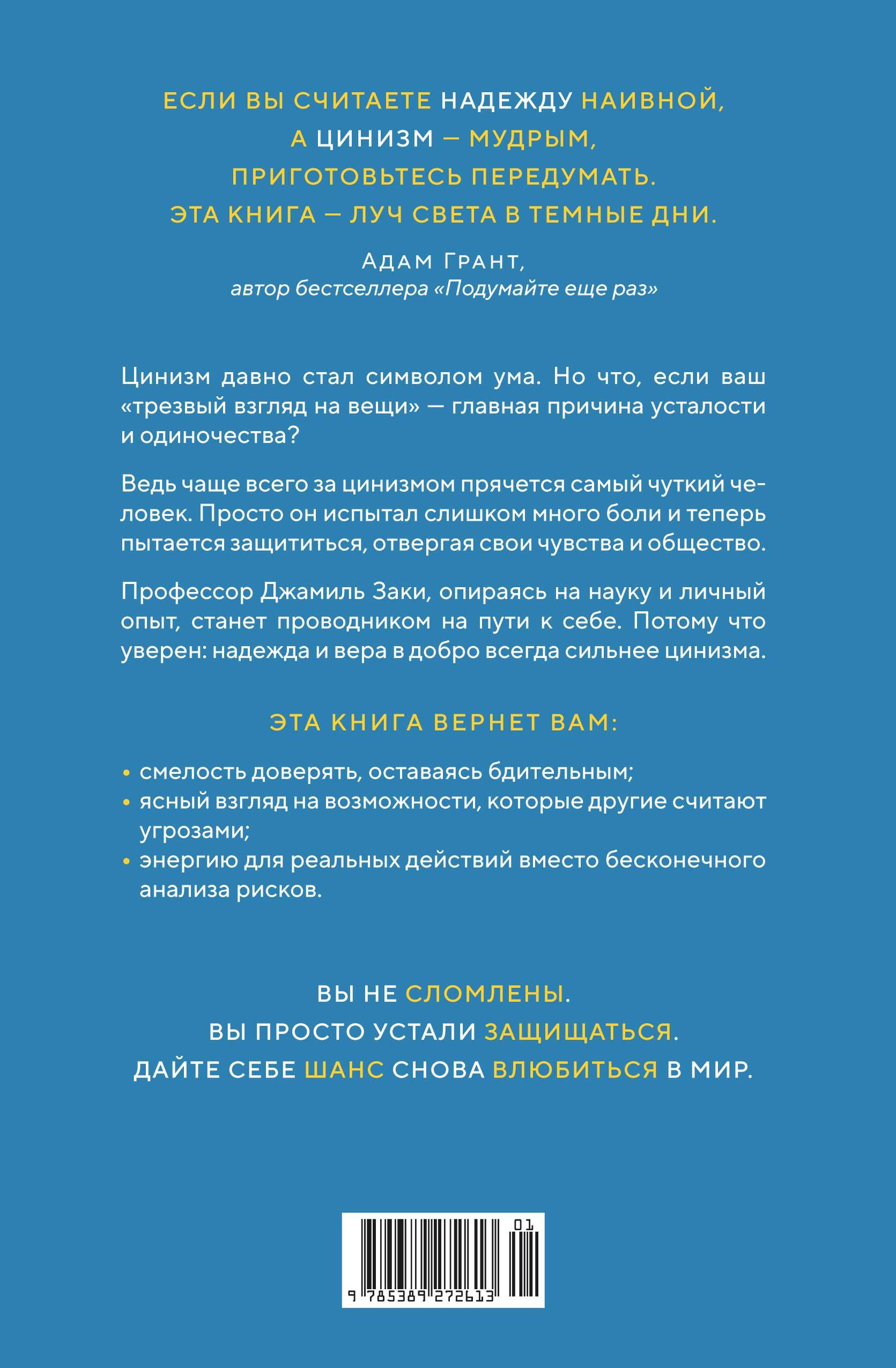 Если вы считаете надежду наивной, а цинизм - мудрым, приготовьтесь передумать. Эта книга - луч света в темные дни. Адам Грант, автор бестселлера «Подумайте еще раз» Цинизм давно стал символом ума. Но что, если ваш «трезвый взгляд на вещи» - главная причина усталости и одиночества? Ведь чаще всего за цинизмом прячется самый чуткий человек. Просто он испытал слишком много боли и теперь пытается защититься, отвергая свои чувства и общество. Профессор Джамиль Заки, опираясь на науку и личный опыт, станет проводником на пути к себе. Потому что уверен: надежда и вера в добро всегда сильнее цинизма. Эта книга вернет вам: • смелость доверять, оставаясь бдительным; • ясный взгляд на возможности, которые другие считают угрозами; • энергию для реальных действий вместо бесконечного анализа рисков. Вы не сломлены. Вы просто устали защищаться. Дайте себе шанс снова влюбиться в мир.| Издательство | Издательство АЗБУКА ООО |