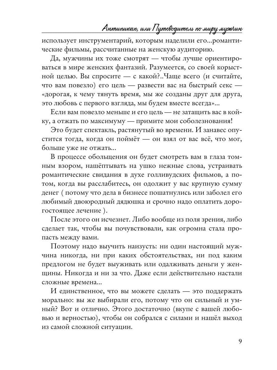 «Антипикап, или Путеводитель по миру мужчин» - это небольшая по объему книга, созданная в жанре психологизированной прозы, которая написана для женской аудитории. Представляя собой гармоничный микс между психологией (первая часть) и беллетристикой (вторая часть, подается в виде художественной прозы), книга является инструментарием по разоблачению лжецов и манипуляторов с рассказами в качестве примеров. Назначение книги - не только развлечь, но и помочь сделать правильный выбор в сфере личных отношений, ориентируясь на свой душевный комфорт.| Издательство | Рипол Классик |