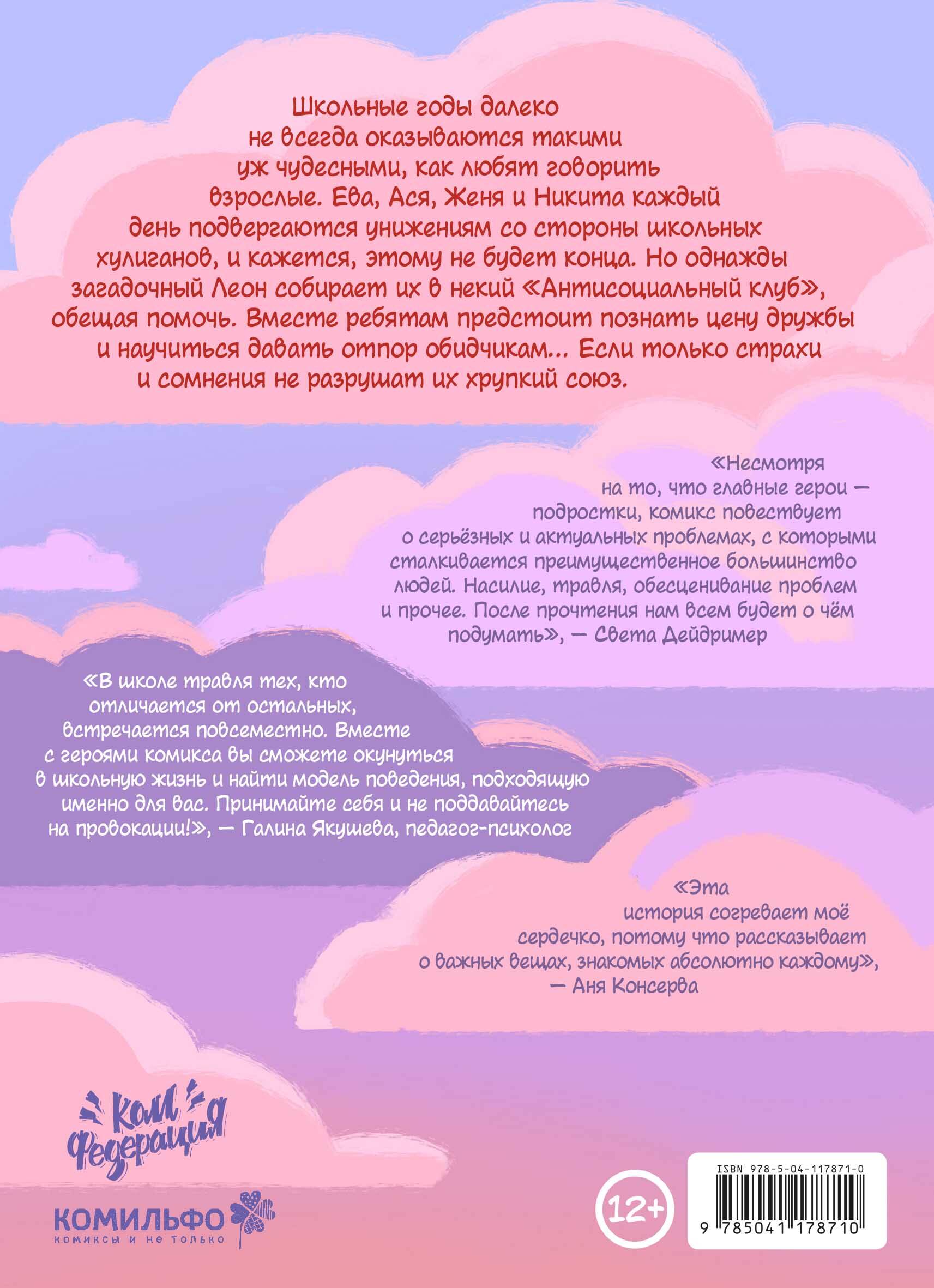 Школьные годы далеко не всегда оказываются такими уж чудесными, как любят говорить взрослые. Например, Еву дразнят в школе из-за её протеза, заменяющего руку. Над Женей смеются просто потому, что он увлекается комиксами. Ася стала объектом насмешек из-за якобы лишнего веса, а Никиту травят по причине того, что он из небогатой семьи. Каждый день ребята подвергаются унижениям со стороны школьных хулиганов и кажется, этому не будет конца. Но однажды загадочный Леон собирает их вместе в некий «Антисоциальный клуб», обещая помочь. Вместе им предстоит познать цену дружбы и научиться давать отпор обидчикам… Если только страхи и обиды не порушат их хрупкий союз.| Издательство | Эксмо |
