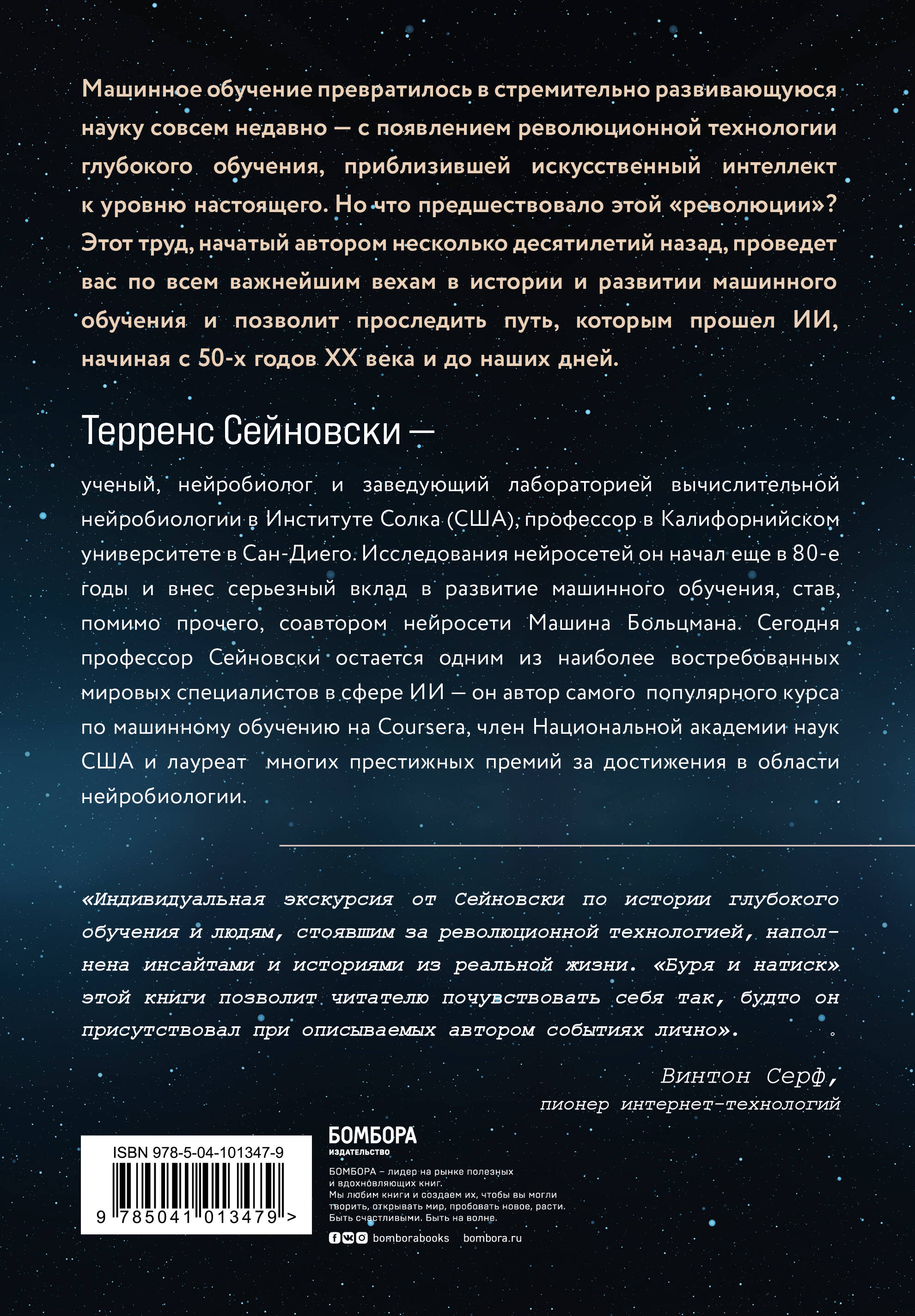 Масштабный труд одного из ведущих мировых ученых в области исследования искусственного интеллекта Терренса Сейновски проведет читателя по всем ключевым вехам в развитии этой технологии. Работа Сейновски охватывает промежуток в 60 лет, за которые машинное обучение шагнуло из теоретических исследований в прикладную науку. Являясь ученым-нейробиологом и заведующим лабораторией Вычислительной нейробиологии в Институте Солка (США), а также профессором в Калифорнийском Университете в Сан-Диего, автор начинал исследования нейросетей еще в 80-е годы, до «революции» глубокого обучения, выдвинувшей искусственный интеллект в ранг самых перспективных технологий современности. Сегодня профессор Сейновски остается одним из наиболее востребованным мировых специалистов в сфере ИИ - он автор самого популярного курса по машинному обучению на Coursera, член Национальной Академии Наук США и лауреат многих престижных премий за достижения в области нейробиологии.| Издательство | ООО "Издательство "Эксмо" |