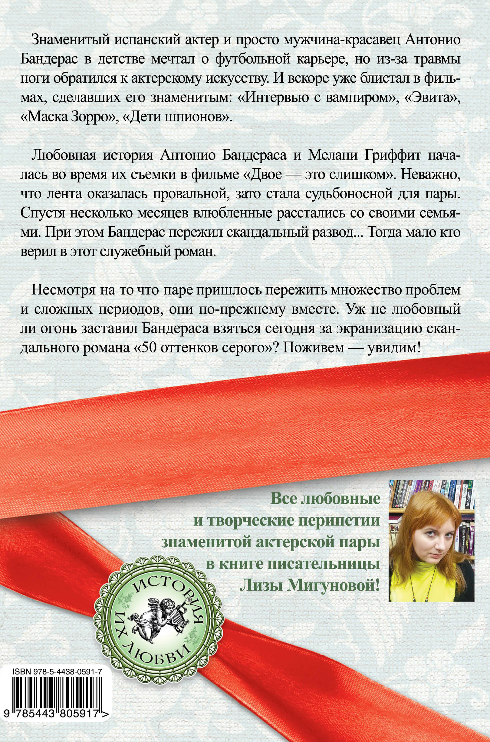 Знаменитый испанский актер и просто мужчина-красавец Антонио Бандерас в детстве мечтал о футбольной карьере, но из-за травмы ноги обратился к актерскому искусству. И вскоре уже блистал в фильмах, сделавших его знаменитым: "Интервью с вампиром", "Эвита", "Маска Зорро", "Дети шпионов". Любовная история Антонио Бандераса и Мелани Гриффит началась во время их съемки в фильме "Двое - это слишком". Спустя несколько месяцев влюбленные расстались со своими семьями. При этом Бандерас пережил скандальный развод - его супруга не желала смириться, что какая-то "старая рыжая стерва" с детьми хочет отнять у нее мужа. Тогда мало кто верил в этот служебный роман. Очередным испытанием на пути к алтарю стала ревность отвергнутой знаменитой Мадонны. Но, несмотря на все препятствия, Бандерас и Гриффит смогли выстоять и поженились, а затем у них родилась дочь. Несмотря на то, что паре пришлось пережить множество проблем и сложных периодов, они по-прежнему вместе. Уж не любовный ли огонь заставил Бандераса взяться сегодня за экранизацию скандального романа "50 оттенков серого"? Поживем - увидим!| Издательство | Издательство АЛГОРИТМ ООО |