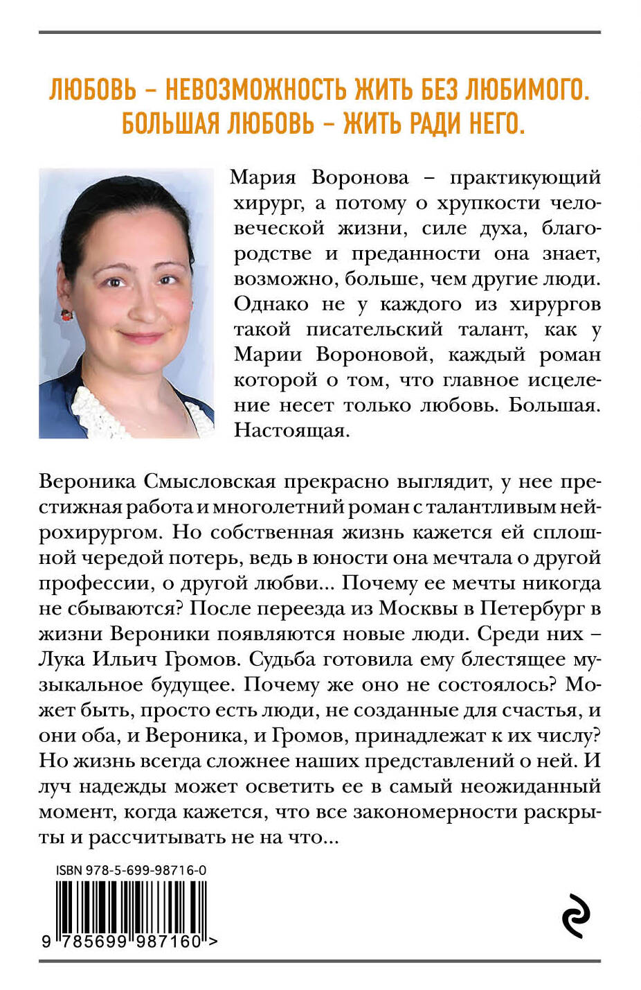 Вероника Смысловская прекрасно выглядит, у нее престижная работа и многолетний роман с талантливым нейрохирургом. Но собственная жизнь кажется ей сплошной чередой потерь, ведь в юности она мечтала о другой профессии, о другой любви... Почему ее мечты никогда не сбываются? После переезда из Москвы в Петербург в жизни Вероники появляются новые люди. Среди них - Лука Ильич Громов. Судьба готовила ему блестящее музыкальное будущее. Почему же оно не состоялось? Может быть, просто есть люди, не созданные для счастья, и они оба, и Вероника, и Громов, принадлежат к их числу? Но жизнь всегда сложнее наших представлений о ней. И луч надежды может осветить ее в самый неожиданный момент, когда кажется, что все закономерности раскрыты и рассчитывать не на что...| Издательство | Эксмо |