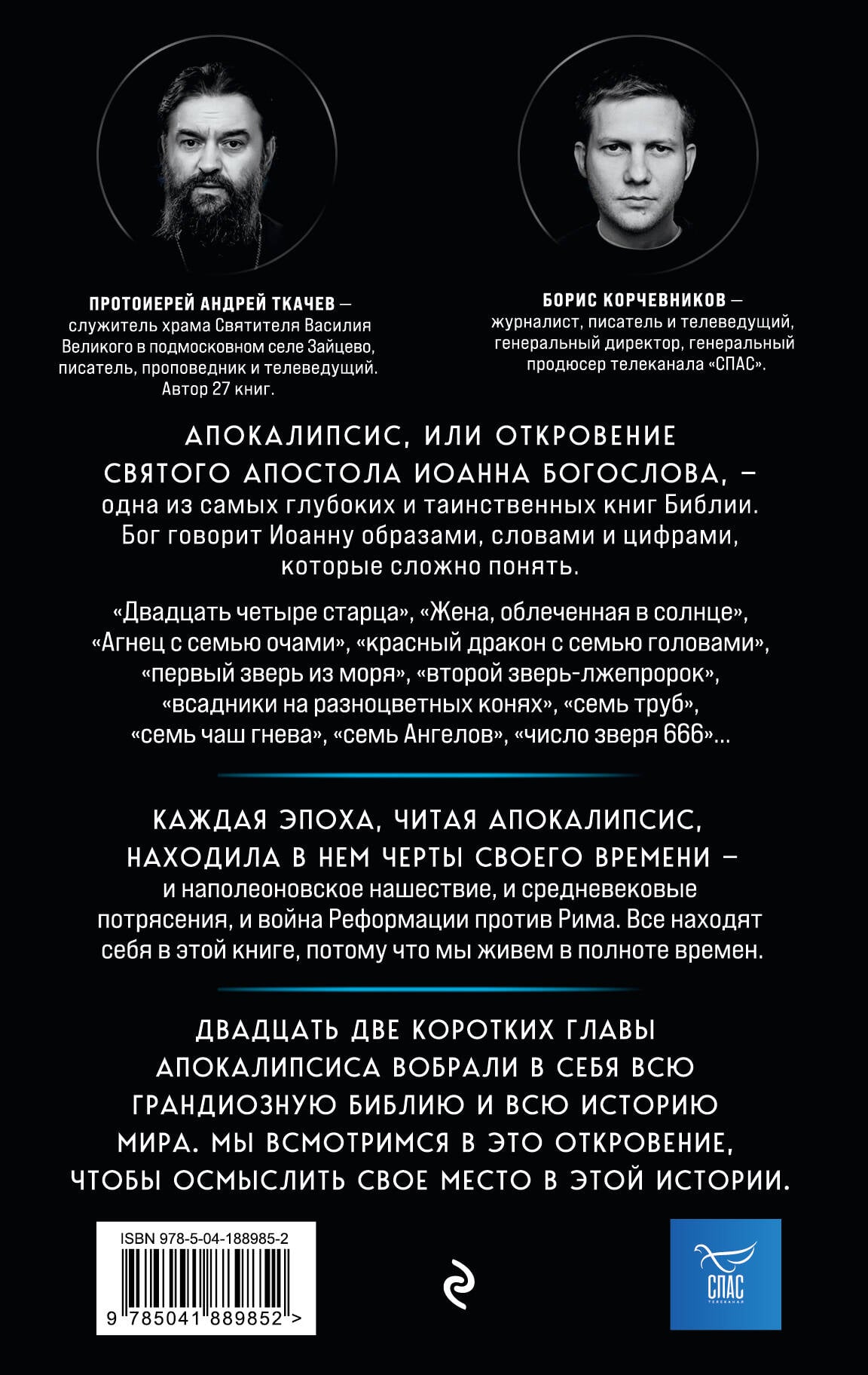 «Апокалипсис. Сейчас позже, чем мы думаем» - сборник размышлений священника Андрея Ткачева и телеведущего Бориса Корчевникова о манускрипте Апокалипсис Святого Иоанна Богослова. Авторы делятся мыслями об Армагеддоне, анализируют каждую главу Откровения и заставляют читателей задуматься над Библией и историей мира. Книга основана на телевизионной программе Бориса Корчевникова, в которой ведущие разбирают и трактуют великие религиозные памятники письменности.| Издательство | ООО "Издательство "Эксмо" |